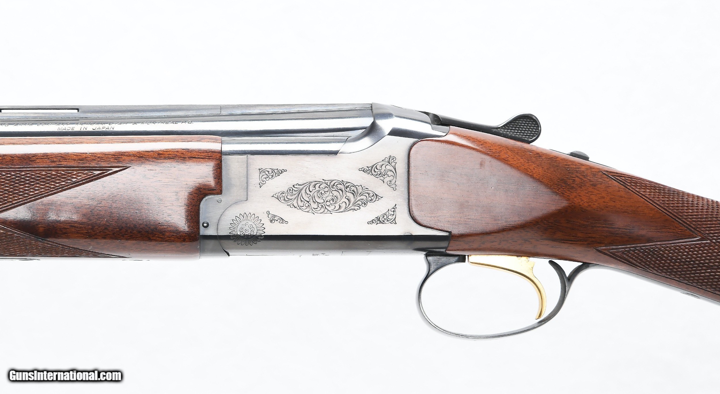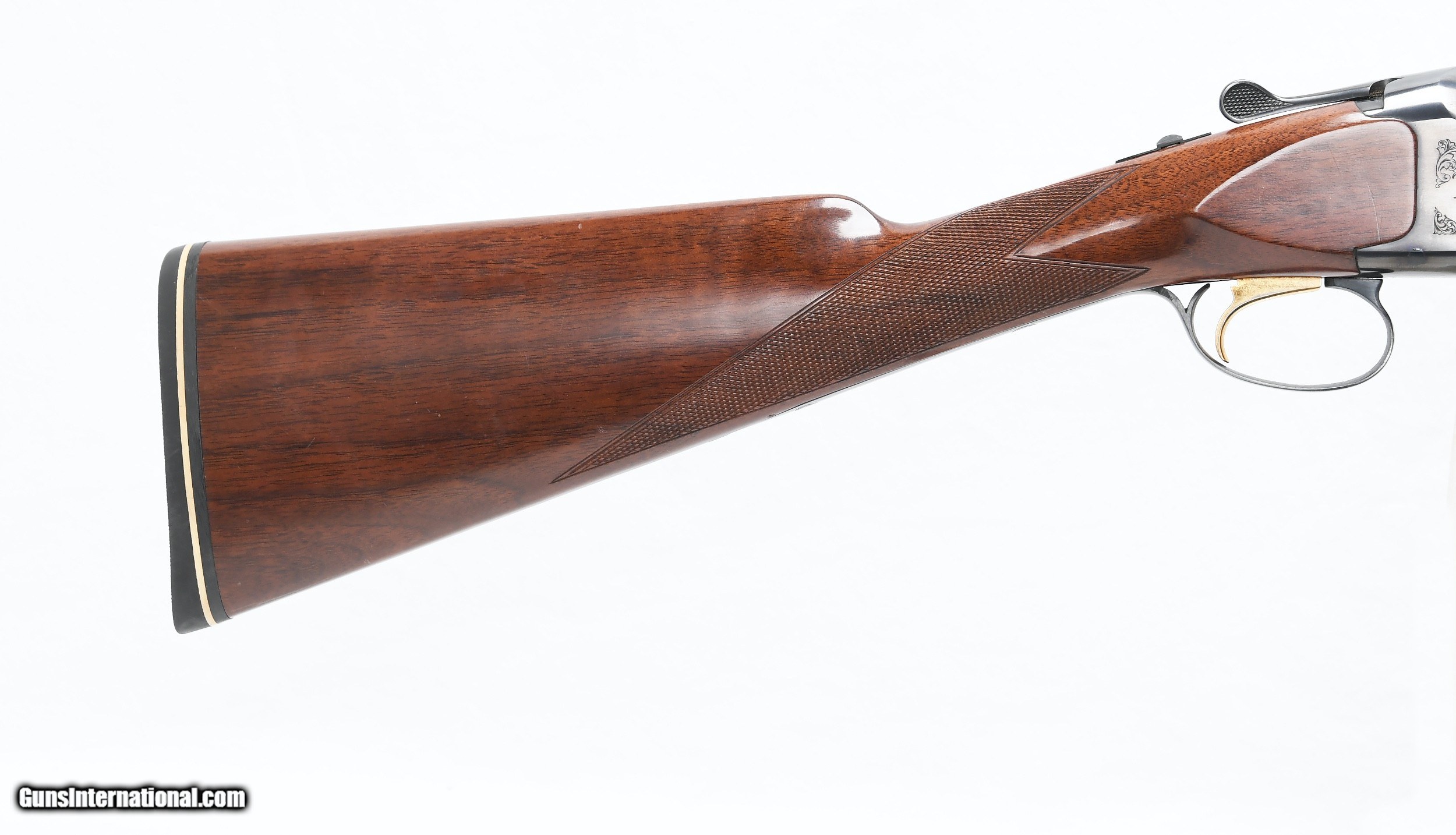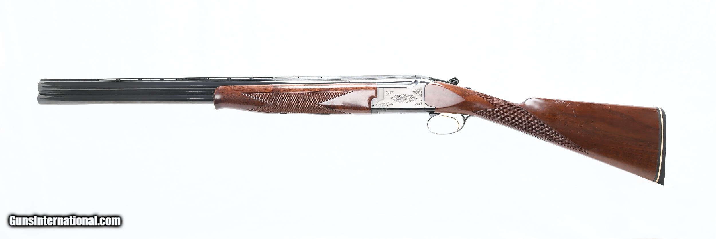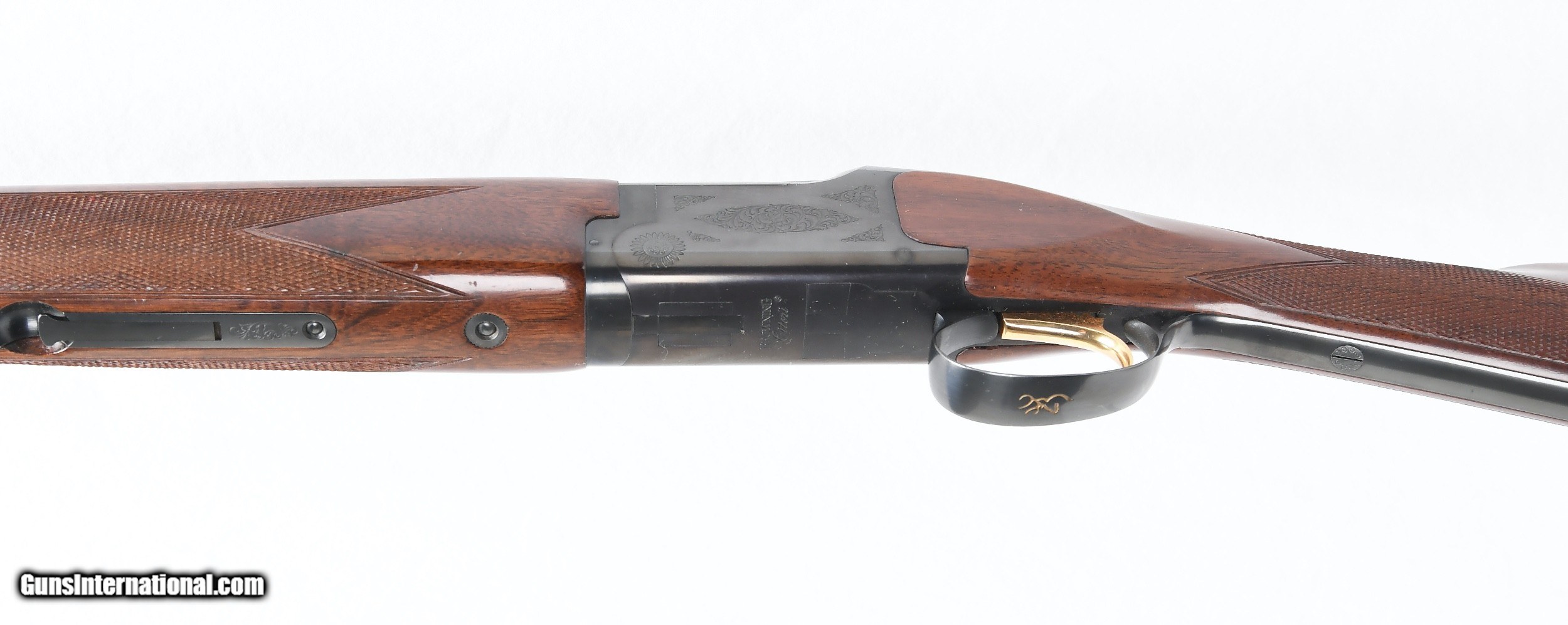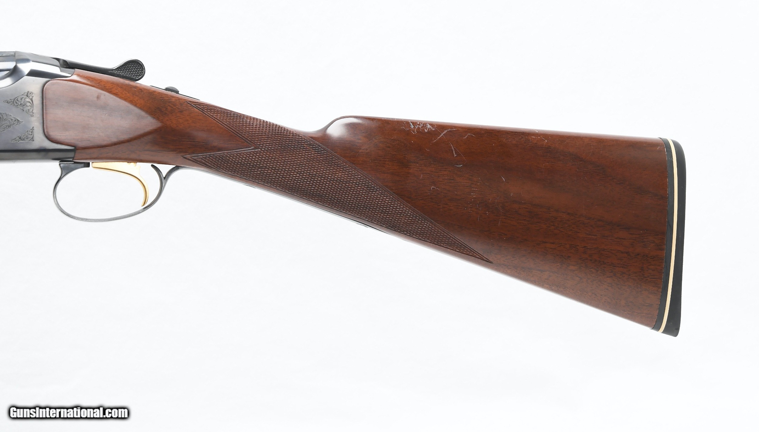 Description: Browning Citori Upland 20 gauge O/U shotgun. Made in 1984 this Upland has 24” barrels and Browning Invector choke tubes. The Upland was similar to the Superlight in that it had a Schnabel Forearm and a Straight Grip Stock but the Upland had 24” barrels instead of 26”. Single selective trigger, vent rib, automatic safety and selective ejection were all standard features. This one has had the stock shortened and a ½” pad added to make the LOP, 12 ¾”. There is a total of four chokes with the gun: 2 skeet, 1 IC and 1 Mod along with the wrench. Also the piece of the buttstock that was cut off is with the gun. Great gun for youth or smaller person. Weighs 5 lbs. 14 oz. Metal and forearms are 98%+ the buttstock has some handling marks on the left side. $875.00 SN: 13188PW123 SOLD |