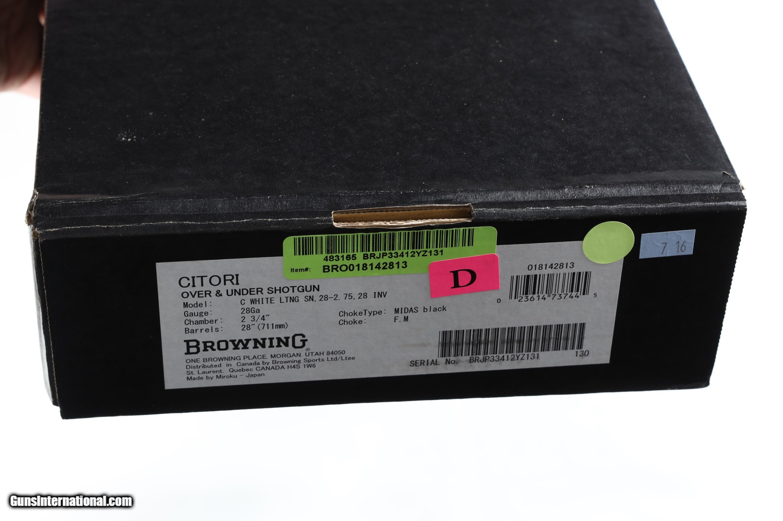 Description: Like new with matching factory box, papers, lock, and a choke tool. 2 3/4" chambers with a 14 1/4" LOP, modified and skeet screw-in chokes installed. • Free Shipping, No Credit Card Fees. • Lay-a-way available for this firearm. • 1/3 Down, a 1/3 in 30 Days 1/3 in 60 Days. SOLD Manufacturer: Browning Model: Citori Serial Number: BRJP33412YZ131 Barrel Length: 28 |