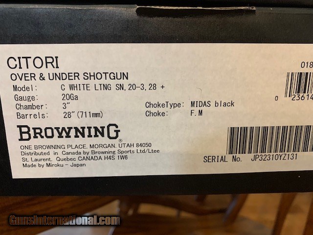 BROWNING CITORI WHITE LIGHTNING, SILVER NITRATE ENGRAVED RECEIVER, 20 GA., 28” BARRELS WITH EXTENDED CHOKE TUBES, NEW UNFIRED IN THE BOX