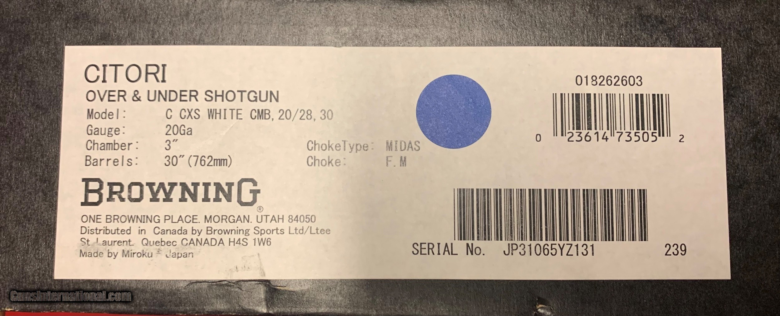 Gauge 20Chamber Length 3" Barrel Length 30"Overall Length47 1/2" Length of Pull 14 3/4"Drop at Comb1 1/2" Drop at Heel 2 1/4"Weight 7 lbs 2 oz Rib Width 3/8 - 1/2"Barrel FinishPolished Blued Stock Finish GlossWood GradeGrade III/IV Chokes IncludedFull, Modified, Improved CylinderReceiver Finish Silver Nitride Dura Touch FinishNoChamber Finish Chrome Plated Chamber Front Sight Ivory BeadChoke SystemInvector-Plus Midas Barrel Material SteelStock MaterialBlack Walnut Recoil Pad Inflex 2, LargeCheckeringCut 18 LPI Sling Swivel StudsNoneReceiver Material Steel Trigger Finish Gold PlatedTrigger Guard FinishPolished Blued Trigger MaterialAlloyTrigger Guard Material Steel Trigger Guard Engraving NoneChoke Wrench Included T-Wrench MSRP $4,379.99 SOLD Shotgun Gauge: 20 Gauge, 28 Gauge Manufacturer: Browning Model: Citori CXS White 20/28 Gauge Combo Barrel Length: 30 Bore: 20 & 28 gauge Chambers: 3” Condition: New Metal Condition: New Wood Condition: New Bore Condition: New Barrels: Over Under Action: Over Under Stock Cast: RH Chokes: Midas |