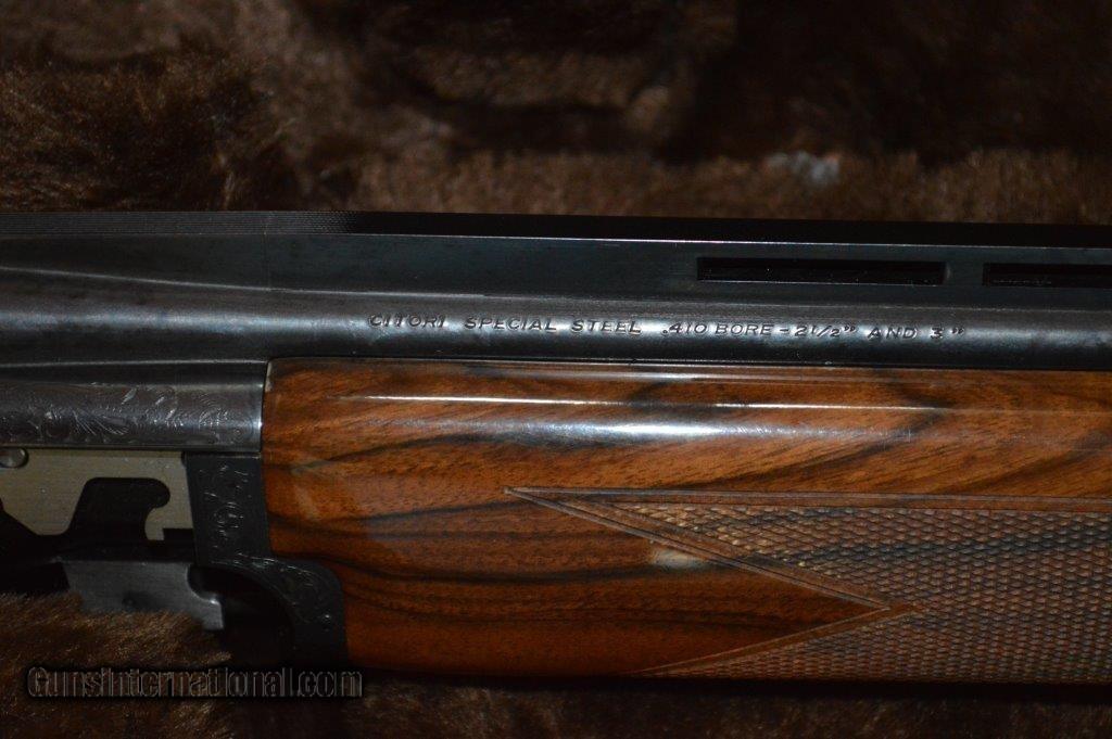 Description: SOLD Pending Funds *** Browning Citori O/U 410 Grade VII with 28" barrels that feature deep relief engraving on a blue receiver, trigger guard, top tang, takedown lever and bracket. This gun exhibts 24Kt. gold bird inlays which are three quail on the right side and three grouse on the left side with the gold bust of a pointer on the bottom. The stock and forearm are high gloss finish with nicely figured walnut.The gun is in excellent over all condition and comes with a Browning hard luggage style case. The invector chokes are Skeet & Skeet, Lite Mod & Imp Mod. The metal is 100% and the wood 99.9% with one little mark on the top of the comb. This gun has been fired a minor amount and it is tight as new with the lever to the right of center. This grade was discontinued in 2012 and is relatively rare and appreciating in value. SOLD Serial Number: 30580MT131 |