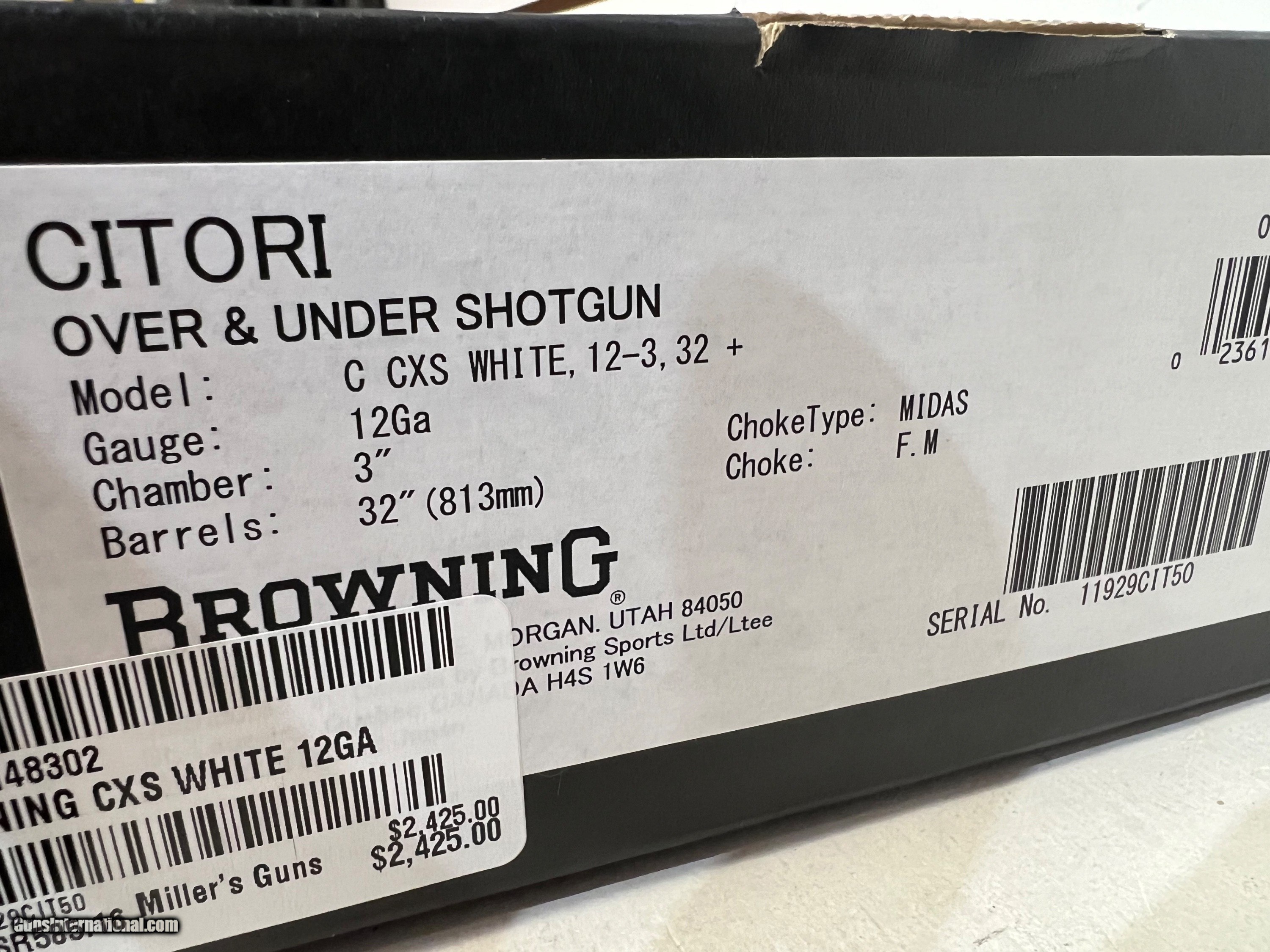Description: new BRN CIT CXS WHITE OU 12M/32MC new in box (CALIBER:12 GAUGE); (MAG CAPACITY:2); (MODEL SERIES:CITORI); (CAPACITY:2); (FINISH:POLISHED BLUE); (STOCK:GLOSS FINISH GRADE III/IV AMERICAN WALNUT); (SIGHTS:IVORY FRONT AND MID BEAD); (OVERALL LENGTH:49.5); (FEATURES:VECTOR PRO FORCING CONE/ FLAT FLOATING RIB); (GUN TYPE:SHOTGUN: OVER AND UNDER); (ACTION:OVER + UNDER); (BARREL LENGTH:32 LIGHTWEIGHT PROFILE); (DEPT:LONG) Buyer pays shipping Millers Gun Center Located in New Castle, Delaware "Home of TAX-Free shopping" No Credit Card Fees Send Gun international inquiry and then call 302-328-9747 to complete your purchase SOLD Serial Number: 11929CIT50 |