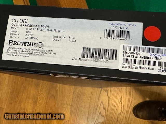 Description: New BRN CIT Trap XT AT Miller 12G 2.75 32" bbl P+ INV Plus 3 chokes wrench new 2023 inventory Adjustable Comb Make: Browning Model: Citori XT-AT American Trap, Millers Exclusive Trigger: 3 trigger system Year of Manufacture: 2023 Gauge: 12 Gauge, 2 3/4″ Shells Action Type: Top Lever, Break Action Over/Under Shotgun With Single Selective Trigger (inertial) and Individual Ejectors Barrel Length: 32″, Ported, Vent Rib Choke: Both Barrels are threaded for Browning Invector-Plus Extended Chokes. Stock Configuration & Condition: The stocks are two-piece checkered Grade 2-3 walnut with finger-grooved forend, slightly flared flat-bottom pistol grip with right-side palm-swell, monte-carlo stock with black buttplate. The LOP measures 14 1/2″ from the front of the adjustable trigger to the back of the buttpad, 12 3/4″ to the back of the wood. The trigger is adjustable for LOP with about 1/8″ of travel available forward, 1/4″ to the rear. The installed trigger is a checkered-face curved with a neutral cast. The drop at the fixed front of the comb is approximately 1 3/4″, drop at heel 1 13/16″. The cast is slightly off. Type of Finish: Blue & Coin Finish Originality: Original Bore Condition: new. Overall Condition: new Buyer pays shipping Millers Gun Center Located in New Castle, Delaware "Home of TAX-Free shopping" No Credit Card Fees Send Gun international inquiry and then call 302-328-9747 to complete your purchase SOLD Shotgun Gauge: 12 Gauge Manufacturer: Browning Model: Citori Serial Number: 15088CIT50 |