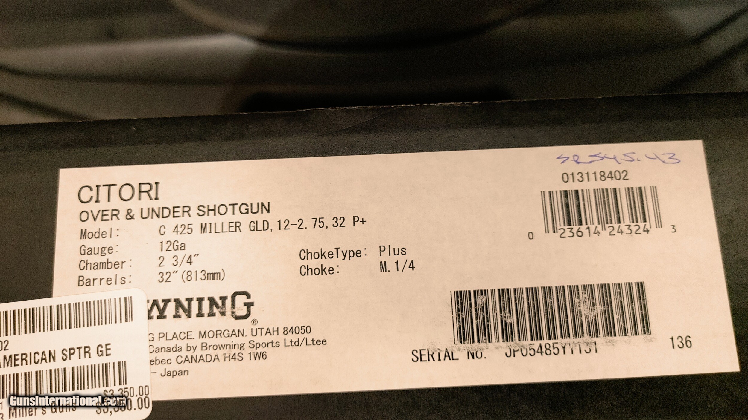 Description: New Browning Miller 425 Sporting Gold Enhanced 12 Gauge 32" ported barrels oil finish stock and forearm coin finish receiver 4 chokes 2 IC 1 Skeet 1 Mod lock manual New 2022 Inventory Buyer pays shipping Millers Gun Center Located in New Castle, Delaware "Home of TAX-Free shopping" No Credit Card Fees Send Gun international inquiry and then call 302-328-9747 to complete your purchase SOLD Shotgun Gauge: 12 Gauge Manufacturer: Browning Model: 425 Serial Number: JP05485YY131 |