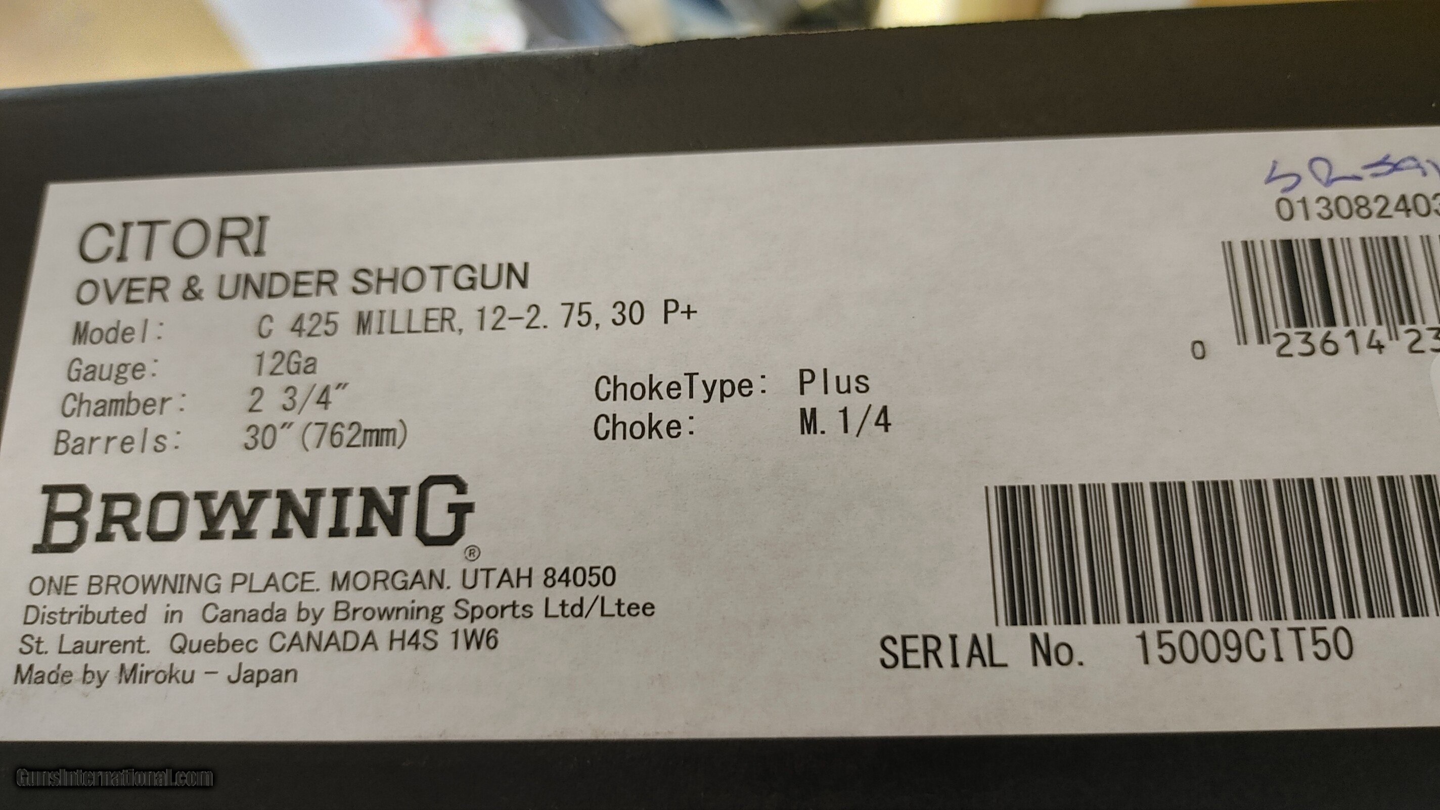 Description: New Browning Millers 425 12 gauge 30" ported barrel Grade 2-3 wood Oil finish Gray Receiver Custom Engraving 3 trigger system- Grey Finish Triggers 4 chokes 1 skeet 2 imp cyl 1 modified wrench tool manuals lock Buyer pays shipping Millers Gun Center Located in New Castle, Delaware "Home of TAX-Free shopping" No Credit Card Fees Send Gun international inquiry and then call 302-328-9747 to complete your purchase SOLD Shotgun Gauge: 12 Gauge Serial Number: 15009CIT50 |