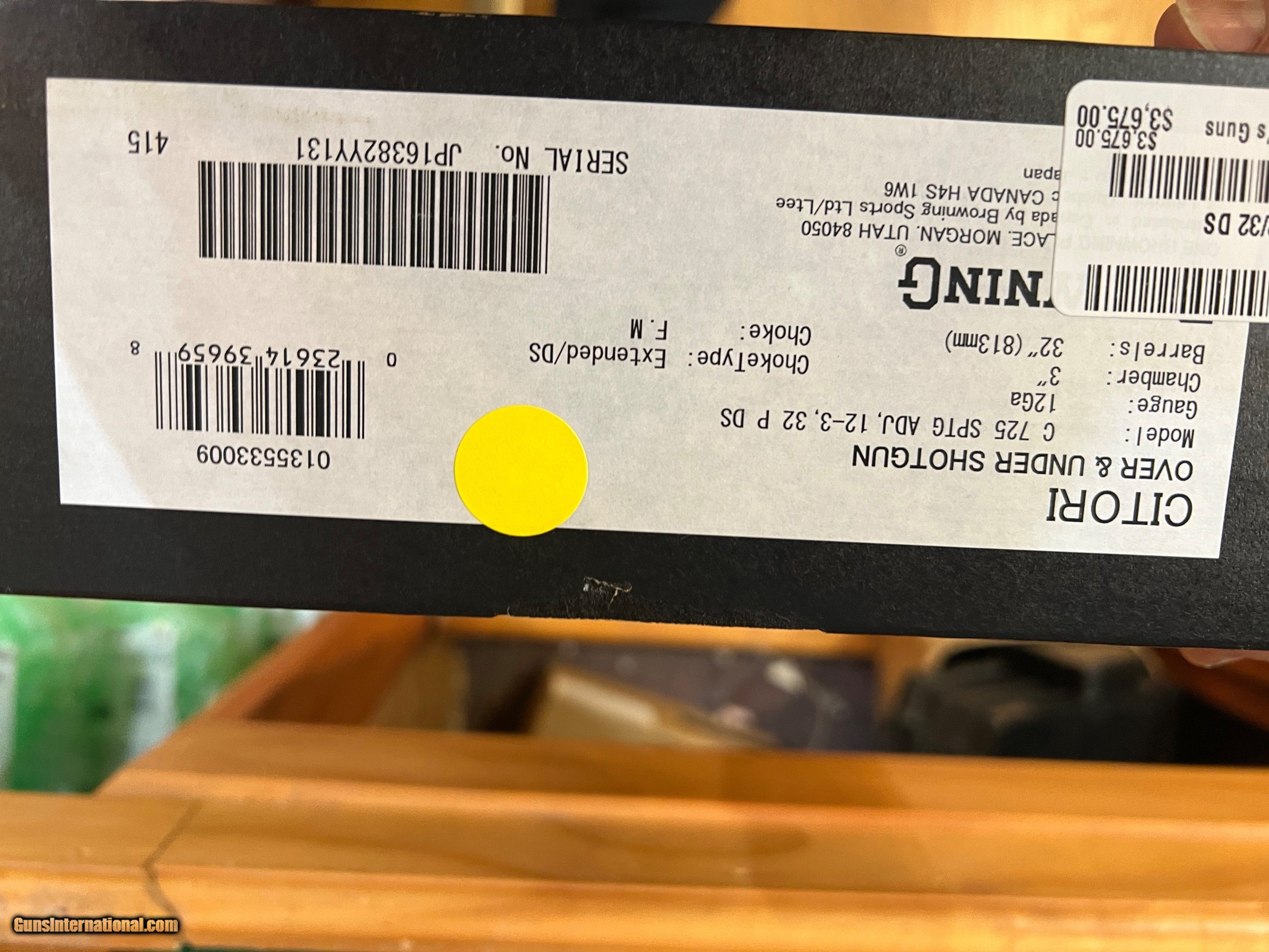 Description: new CITORI 725 SPTG 12/32 3 ADJ ADJ COMB/PORTED BBL new in box (MODEL:CITORI 725 SPORTING ADJUSTABLE); (ACTION:OVER / UNDER); (CAPACITY:2); (RECEIVER:SILVER NITRIDE); (SIGHTS:HIVIZ PRO-COMP SIGHT); (STOCKFRAMEGRIPS:GRADE III/IV WALNUT WOOD STOCK); (WEIGHT:7 LBS 13 OZ.); (OVERALLLENGTH:50); (CHAMBER:3); (BARREL LENGTH:32); (DRILL-TAPPED:FALSE); (SHOTGUN:SHOTGUN) Buyer pays shipping Millers Gun Center Located in New Castle, Delaware "Home of TAX-Free shopping" No Credit Card Fees Send Gun international inquiry and then call 302-328-9747 to complete your purchase SOLD Serial Number: JP16382YY131 |