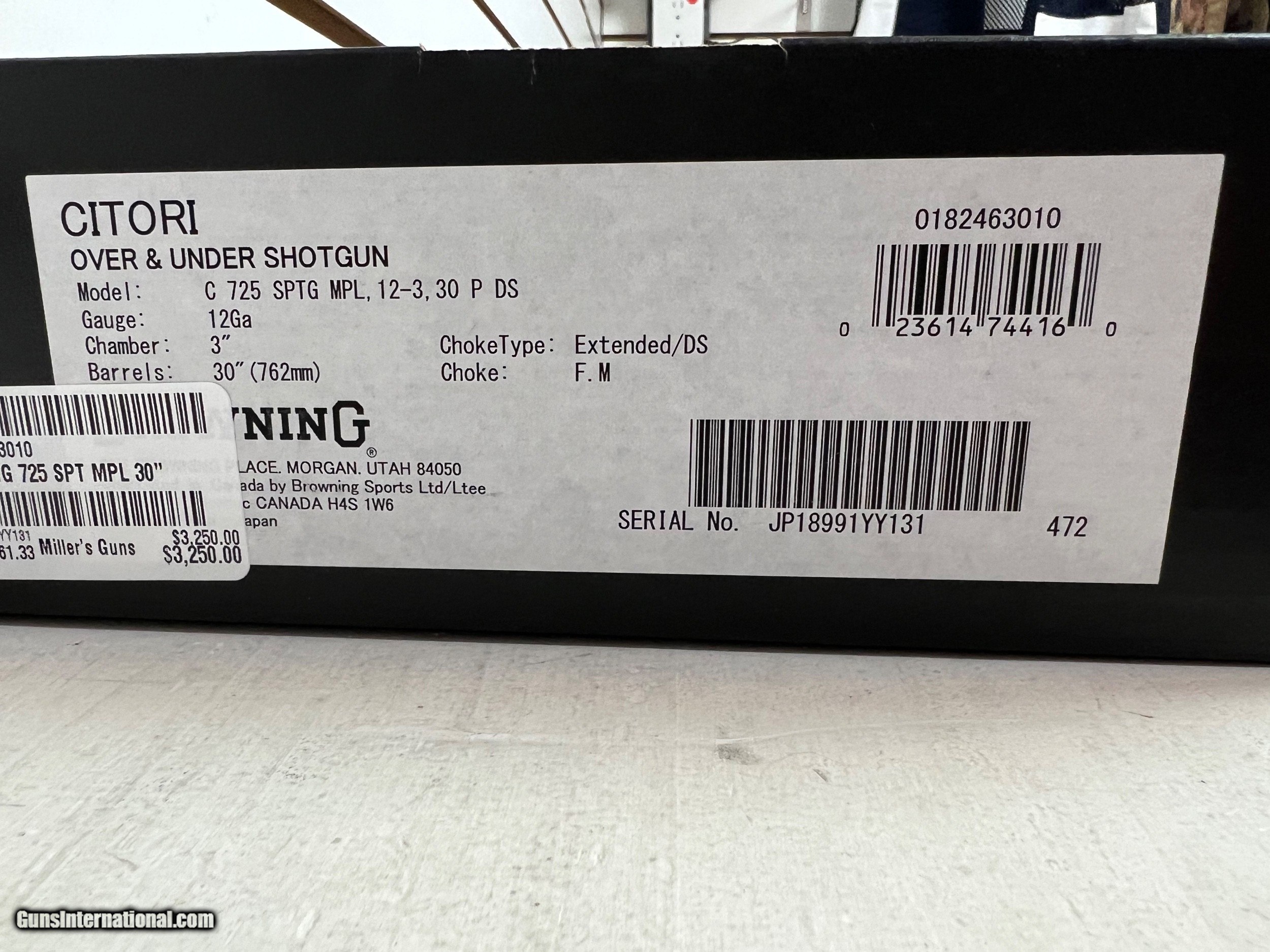 Description: New CITORI 725 SPTG MAP 12/30 3 PORTED BARREL new in box (MODEL:CITORI 725 SPORTING MAPLE); (ACTION:OVER / UNDER); (BARREL LENGTH:30); (CAPACITY:2); (OVERALLLENGTH:48); (RECEIVER:POLISHED BLUED); (SIGHTS:HIVIZ PRO-COMP SIGHT); (STOCKFRAMEGRIPS:WOOD STOCK GLOSS AAAA GRADE MAPLE); (WEIGHT:7 LBS 6 OZ.); (CHAMBER:3); (DRILL-TAPPED:FALSE); (SHOTGUN:SHOTGUN) Buyer pays shipping Millers Gun Center Located in New Castle, Delaware "Home of TAX-Free shopping" No Credit Card Fees Send Gun international inquiry and then call 302-328-9747 to complete your purchase SOLD Serial Number: JP18991YY131 |