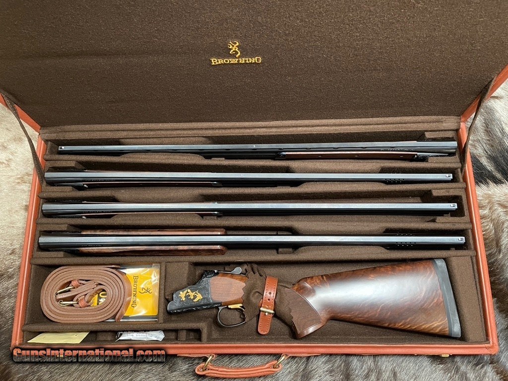 Description: NEW-IN-BOX, UNFIRED, NEVER PUT TOGETHER, (AND VERY RARE IN THIS CONDITION) BROWNING CITORI SKEET GRADE 7 ENGRAVED 4-BARREL SET (12GA, 20GA 28GA 410 BORE) WITH FITTED LEATHER CASE - THIS SHOTGUN SET IS IN EXACTLY THE SAME CONDITION AS WHEN IT LEFT THE BROWNING FACTORY - LAYAWAY AVAILABLE. FEATURES OF THIS GREAT GRADE 7 ENGRAVED BROWNING OVER/UNDER 4-BARREL SKET SET W/ LEATHER CASE INCLUDE: