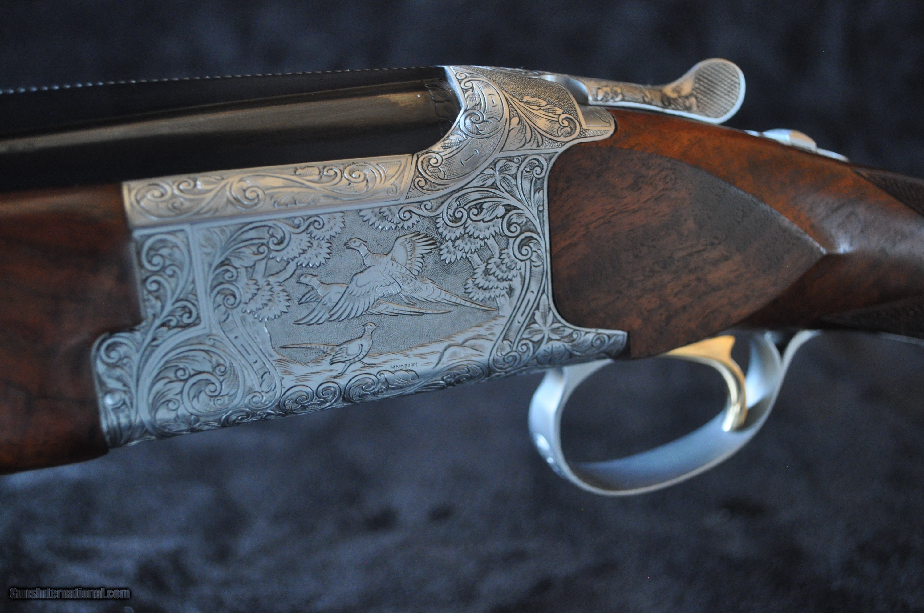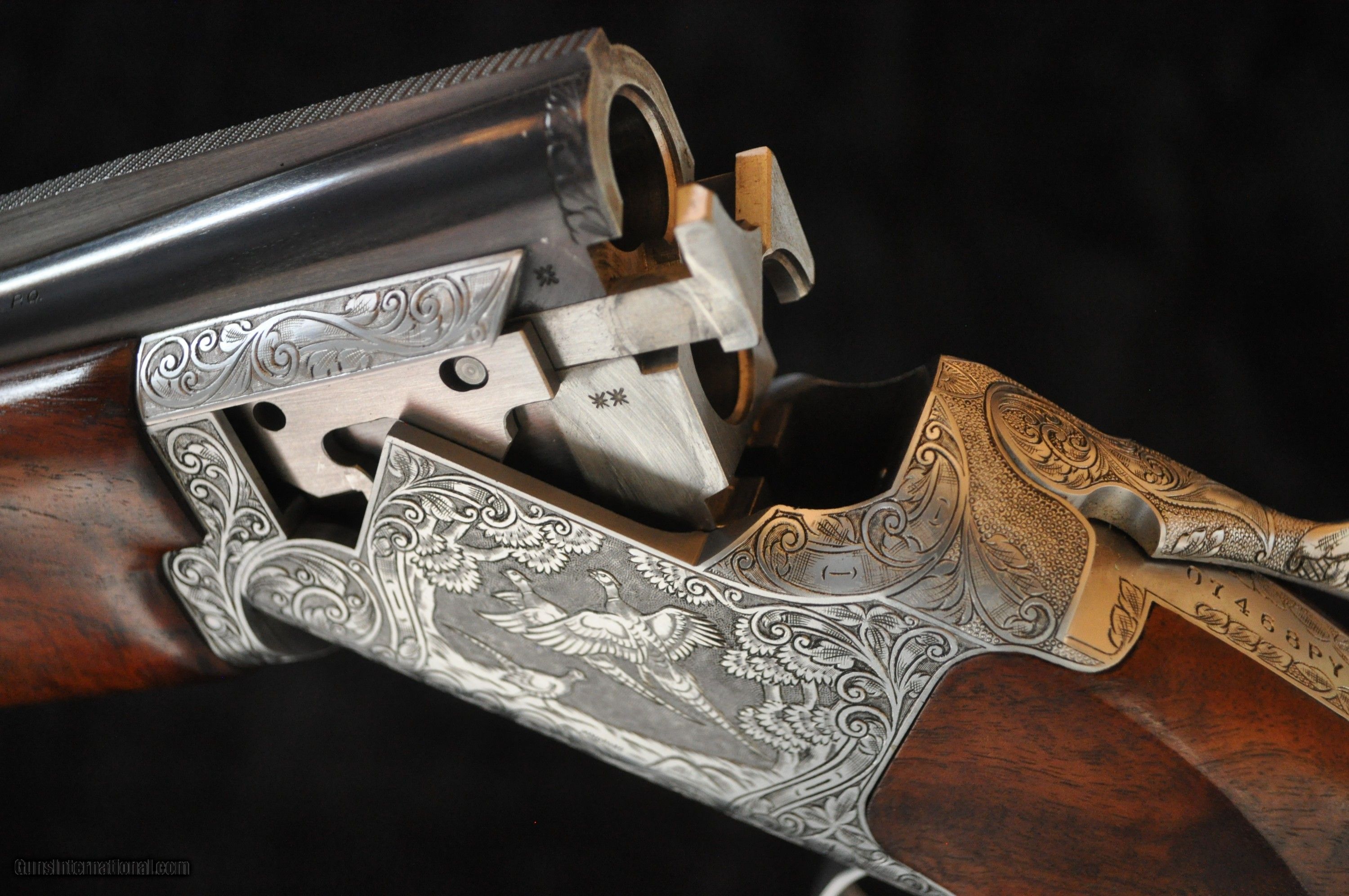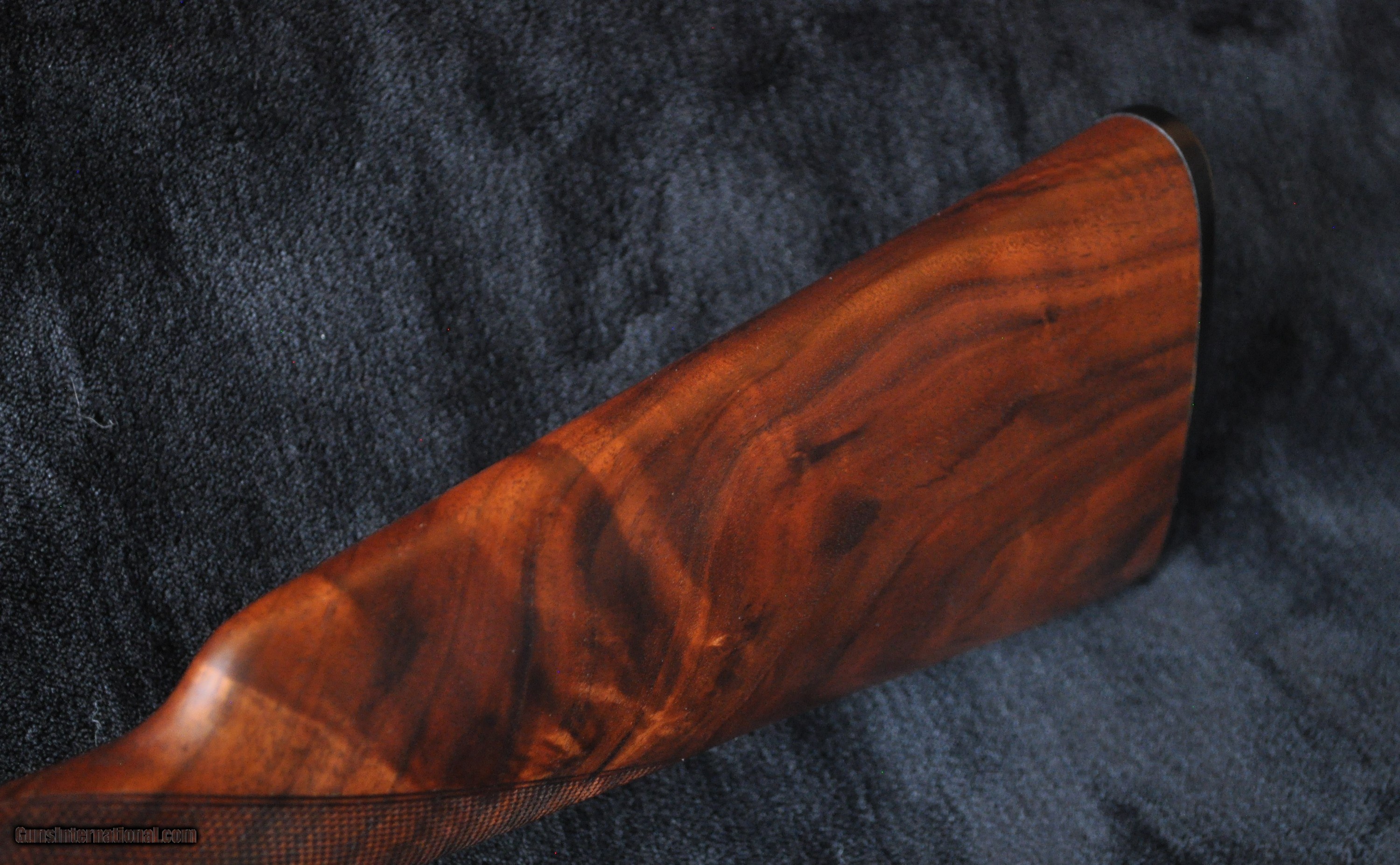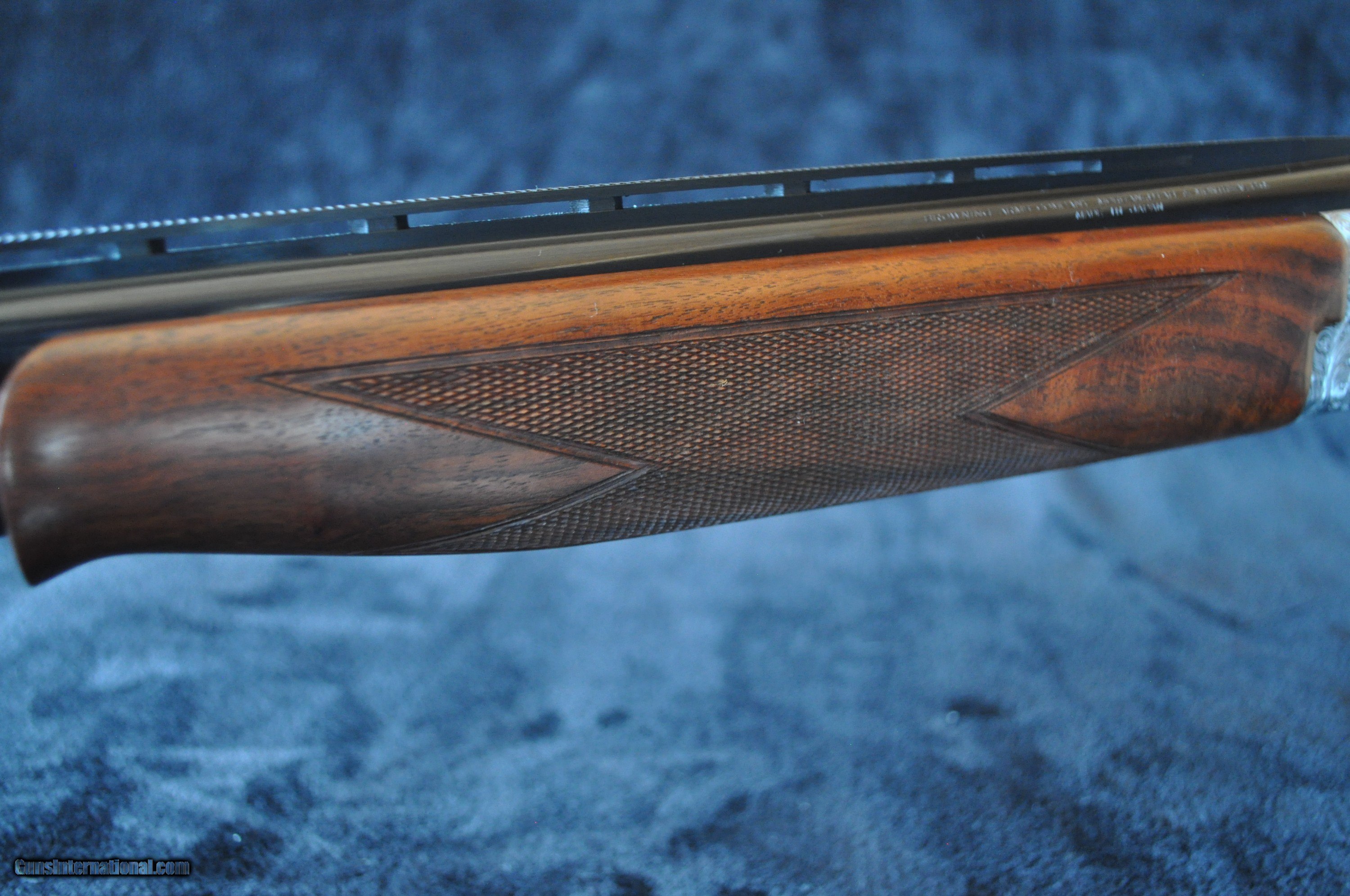 Description: Offered for sale is a fabulous looking 28ga. Browning Citori Sporter Grade V with 28-inch barrels. This gun is unique in that it is like the Citori Superlight, having a straight grip stock, but sports 28-inch barrels, 2 ¾ inch chambers, fixed chokes and hand engraving. This gun was manufactured in Japan in 1982 and was hand engraved by M. Nozaki whose signature can be seen on the left side of the receiver. The 28-inch barrels are as new and sport a ventilated rib, a single silver front bead site and are choked Modified and Full. The deep relief hand engraved receiver has 3 pheasants in flight on the left side, 3 ducks lifting from a pond on the right and a retriever and pheasant on the bottom. The straight grip stock and Schnabel forend are made of beautiful walnut, are finely checkered and oil satin finished. This gun comes with a gold single selective trigger, an engraved quail on the beautiful long trigger guard, an auto safety and its original Browning butt pad. This Sporter is truly in exceptional shape. LOP is 14 3/8” with DAC of 1 1/2, DAH of 2 5/16 , weighs 6bs 9oz, comes in its original factory box and letter of authentication from the Browning Historical Department. SOLD Shotgun Gauge: 28 Gauge Manufacturer: Browning Model: Citori Barrel Length: 28 Condition: Like New Stock Comb: 1 1/2 Stock Heel: 2 5/16 Weight: 6lbs 9oz |