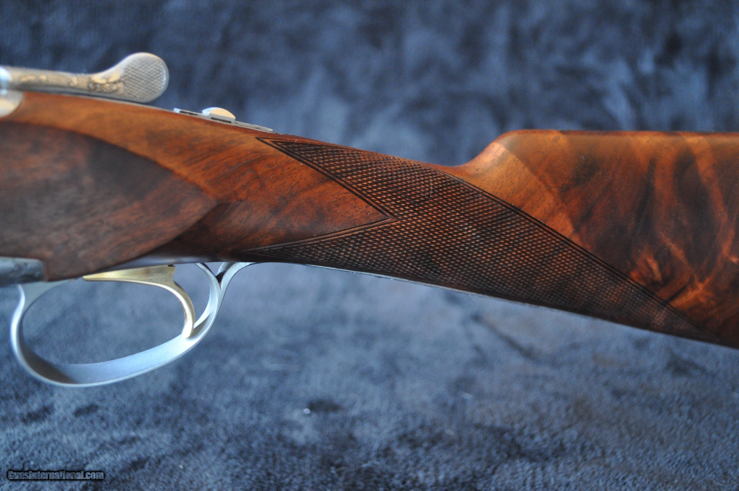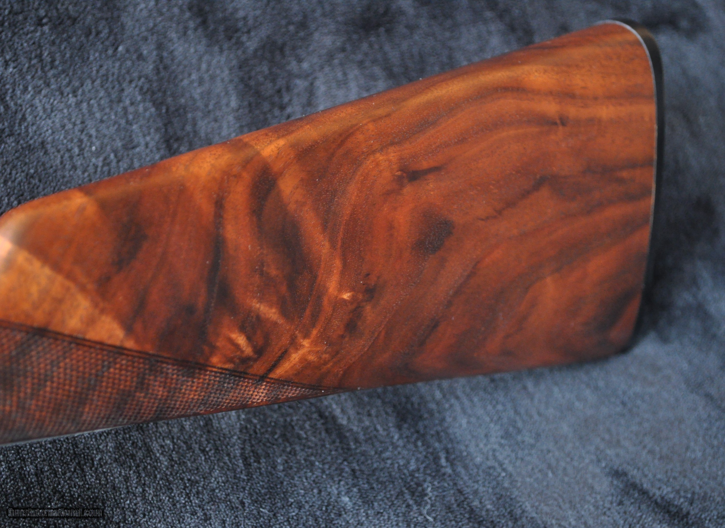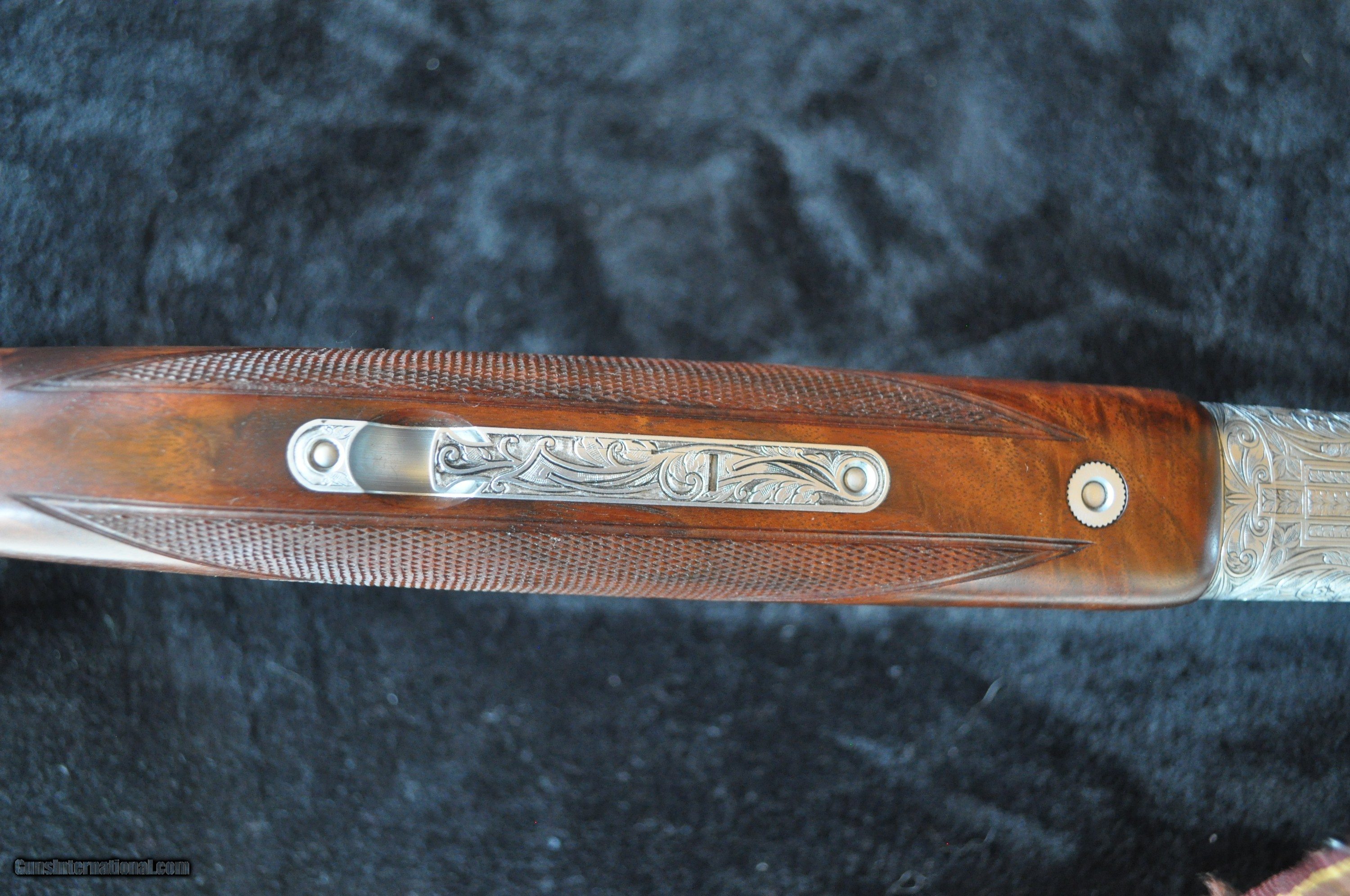 Description: Offered for sale is a fabulous looking 28ga. Browning Citori Sporter Grade V with 28-inch barrels. This gun is unique in that it is like the Citori Superlight, having a straight grip stock, but sports 28-inch barrels, 2 ¾ inch chambers, fixed chokes and hand engraving. This gun was manufactured in Japan in 1982 and was hand engraved by M. Nozaki whose signature can be seen on the left side of the receiver. The 28-inch barrels are as new and sport a ventilated rib, a single silver front bead site and are choked Modified and Full. The deep relief hand engraved receiver has 3 pheasants in flight on the left side, 3 ducks lifting from a pond on the right and a retriever and pheasant on the bottom. The straight grip stock and Schnabel forend are made of beautiful walnut, are finely checkered and oil satin finished. This gun comes with a gold single selective trigger, an engraved quail on the beautiful long trigger guard, an auto safety and its original Browning butt pad. This Sporter is truly in exceptional shape. LOP is 14 3/8” with DAC of 1 1/2, DAH of 2 5/16 , weighs 6bs 9oz, comes in its original factory box and letter of authentication from the Browning Historical Department. SOLD Shotgun Gauge: 28 Gauge Manufacturer: Browning Model: Citori Barrel Length: 28 Condition: Like New Stock Comb: 1 1/2 Stock Heel: 2 5/16 Weight: 6lbs 9oz |