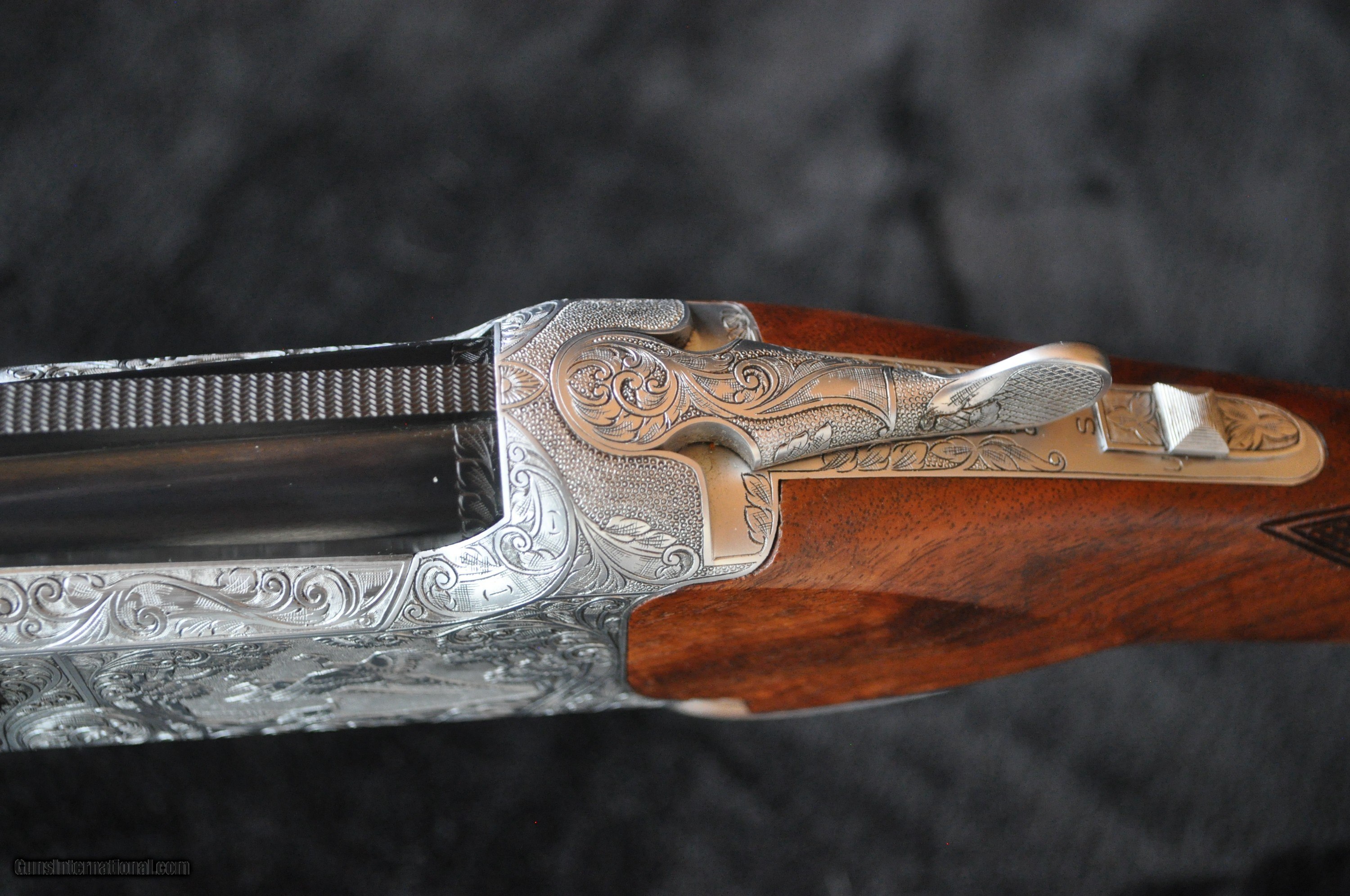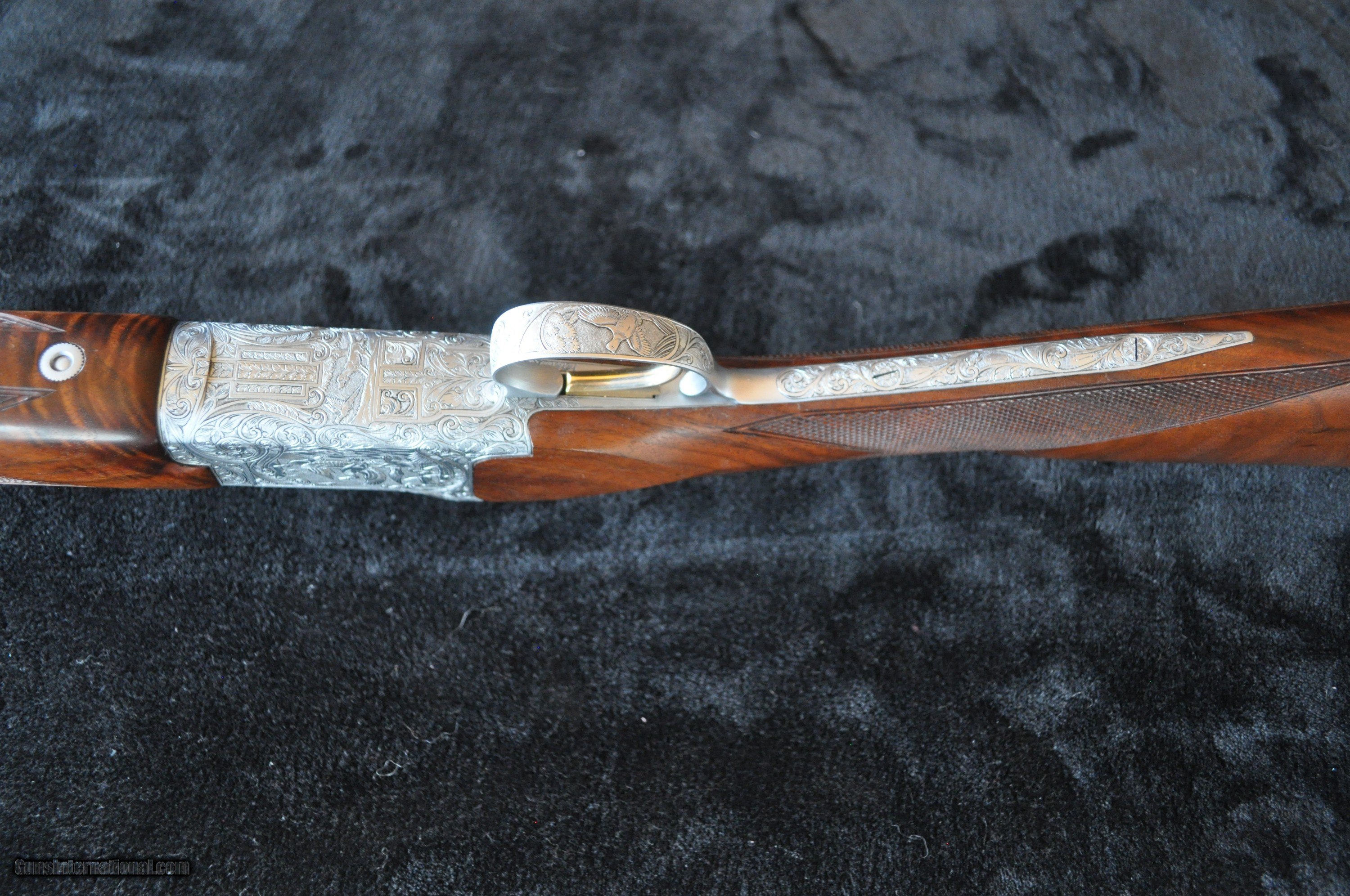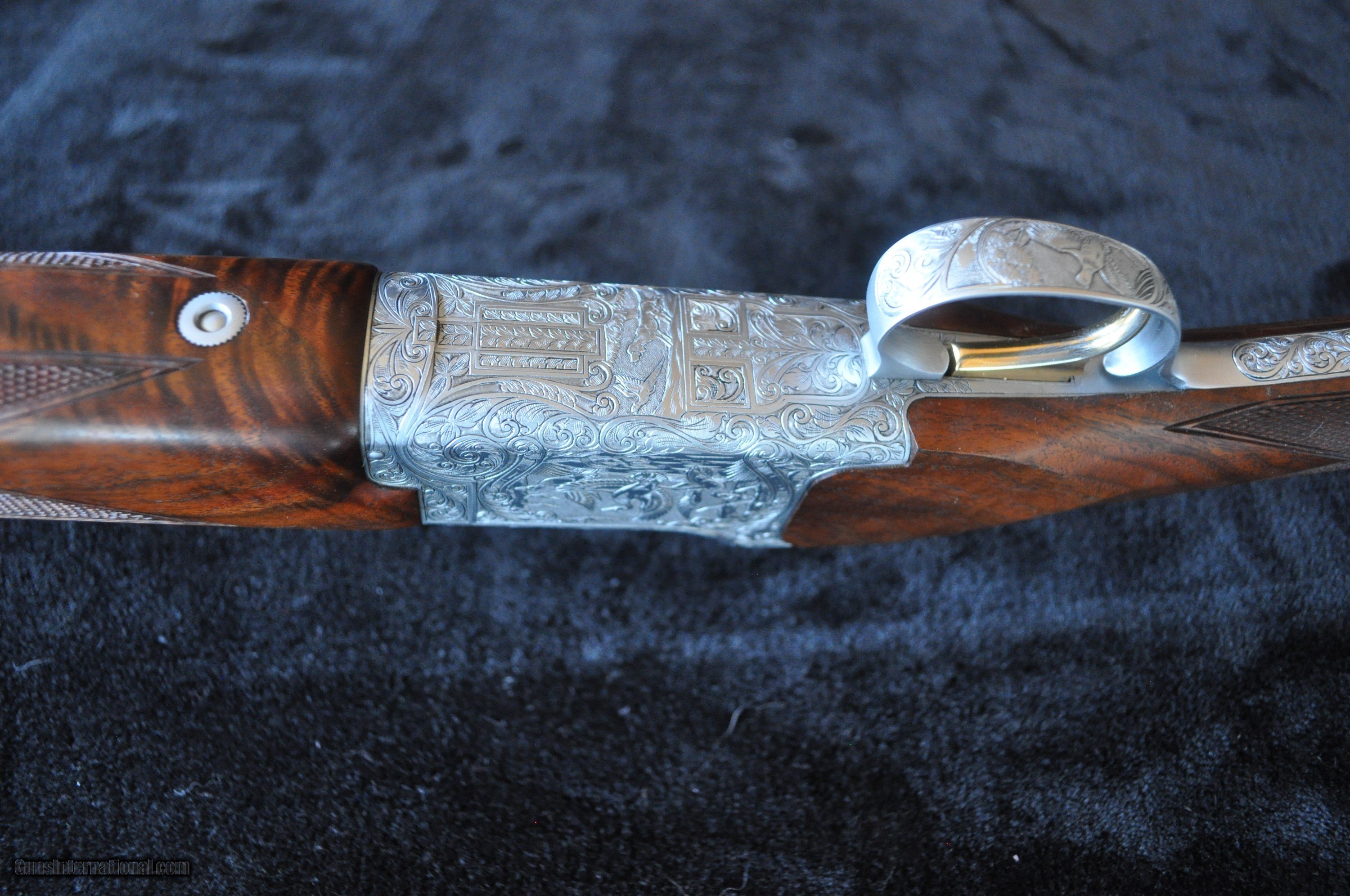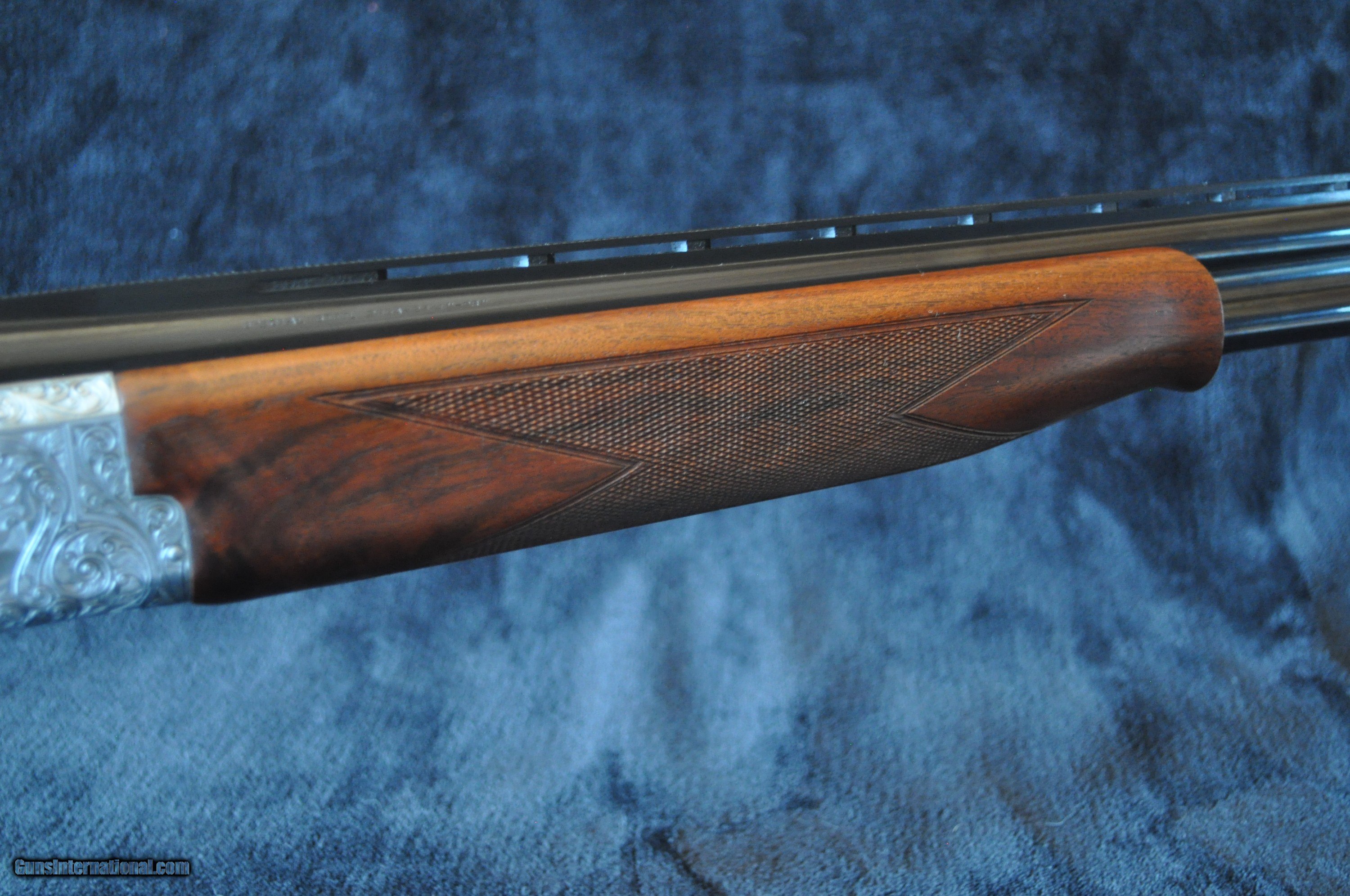 Description: Offered for sale is a fabulous looking 28ga. Browning Citori Sporter Grade V with 28-inch barrels. This gun is unique in that it is like the Citori Superlight, having a straight grip stock, but sports 28-inch barrels, 2 ¾ inch chambers, fixed chokes and hand engraving. This gun was manufactured in Japan in 1982 and was hand engraved by M. Nozaki whose signature can be seen on the left side of the receiver. The 28-inch barrels are as new and sport a ventilated rib, a single silver front bead site and are choked Modified and Full. The deep relief hand engraved receiver has 3 pheasants in flight on the left side, 3 ducks lifting from a pond on the right and a retriever and pheasant on the bottom. The straight grip stock and Schnabel forend are made of beautiful walnut, are finely checkered and oil satin finished. This gun comes with a gold single selective trigger, an engraved quail on the beautiful long trigger guard, an auto safety and its original Browning butt pad. This Sporter is truly in exceptional shape. LOP is 14 3/8” with DAC of 1 1/2, DAH of 2 5/16 , weighs 6bs 9oz, comes in its original factory box and letter of authentication from the Browning Historical Department. SOLD Shotgun Gauge: 28 Gauge Manufacturer: Browning Model: Citori Barrel Length: 28 Condition: Like New Stock Comb: 1 1/2 Stock Heel: 2 5/16 Weight: 6lbs 9oz |