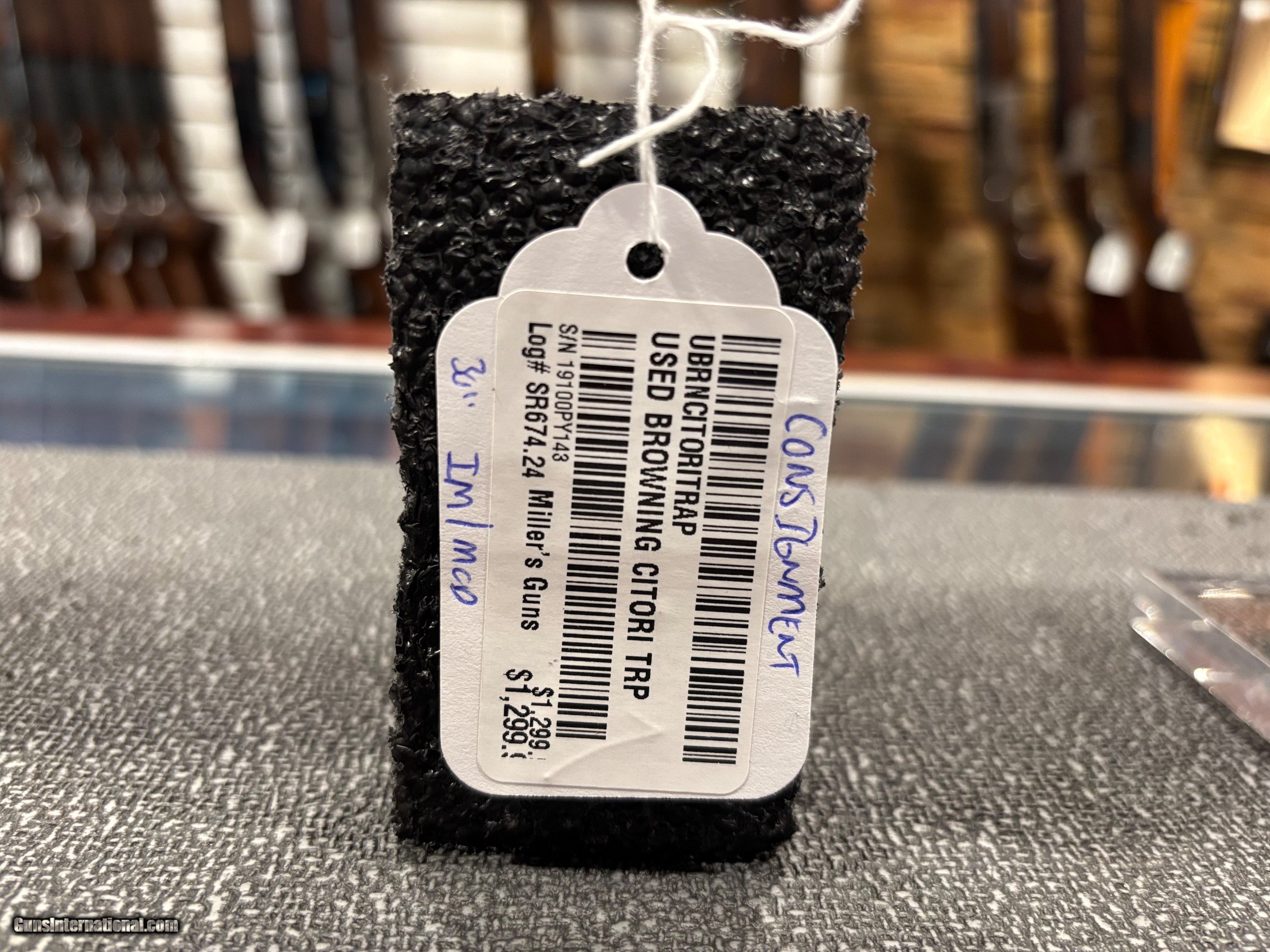 Description: USED Browning Citori Trap 12ga 30" barrels IM/MOD choked Ported barrels Adjustable comb Adjustable butt plate Small cracks in stock (see pictures) Finish wear Rust on barrel Shotgun Gauge: 12 Gauge Manufacturer: Browning Model: Citori Trap Serial Number: 19100PY143 Barrel Length: 30 Condition: POOR Price: $1,299.99 Contact Seller |