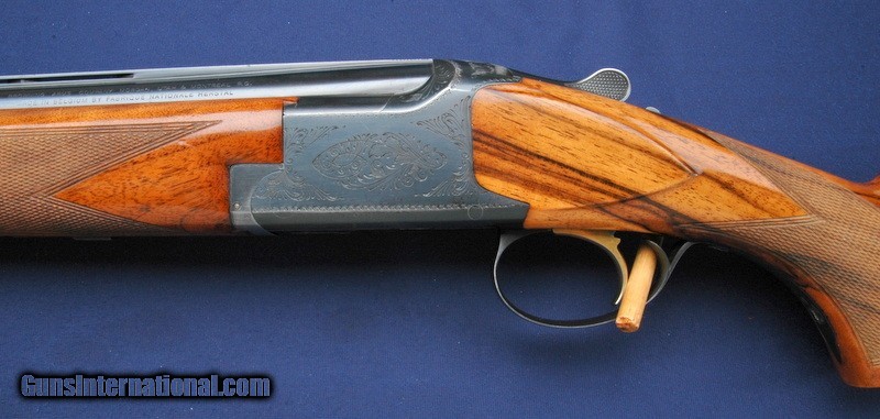 Description: Very, very pretty Grade 1 Lightning with exceptional wood. About as nice a Grade 1 as you will see. 28" barrels, top barrel is FULL, bottom barrel is MOD. Gun was shot, there are numerous minor dings to the wood, nothing that detracts from the appearance, as you can see in the pictures. Has the original Browning buttplate. With action closed, lever is just a touch to the right (from the butt) of 6 o'clock. More blue wear to the bottom of the frame, that appears to be where it was held or carried, by the palm under the frame in front of the trigger guard. Comes in a generic hard case with a brown leather cover. This a nice one, priced right, shouldn't last long- don't miss it. $75 shipping to the lower 48, 3% surcharge for using a CC. If you pay with a personal check, you can expect us to hold the item for up to 10 days just to make sure that it clears. Also please try to expedite delivery, as we will keep and item on your word for 5 days. SOLD |