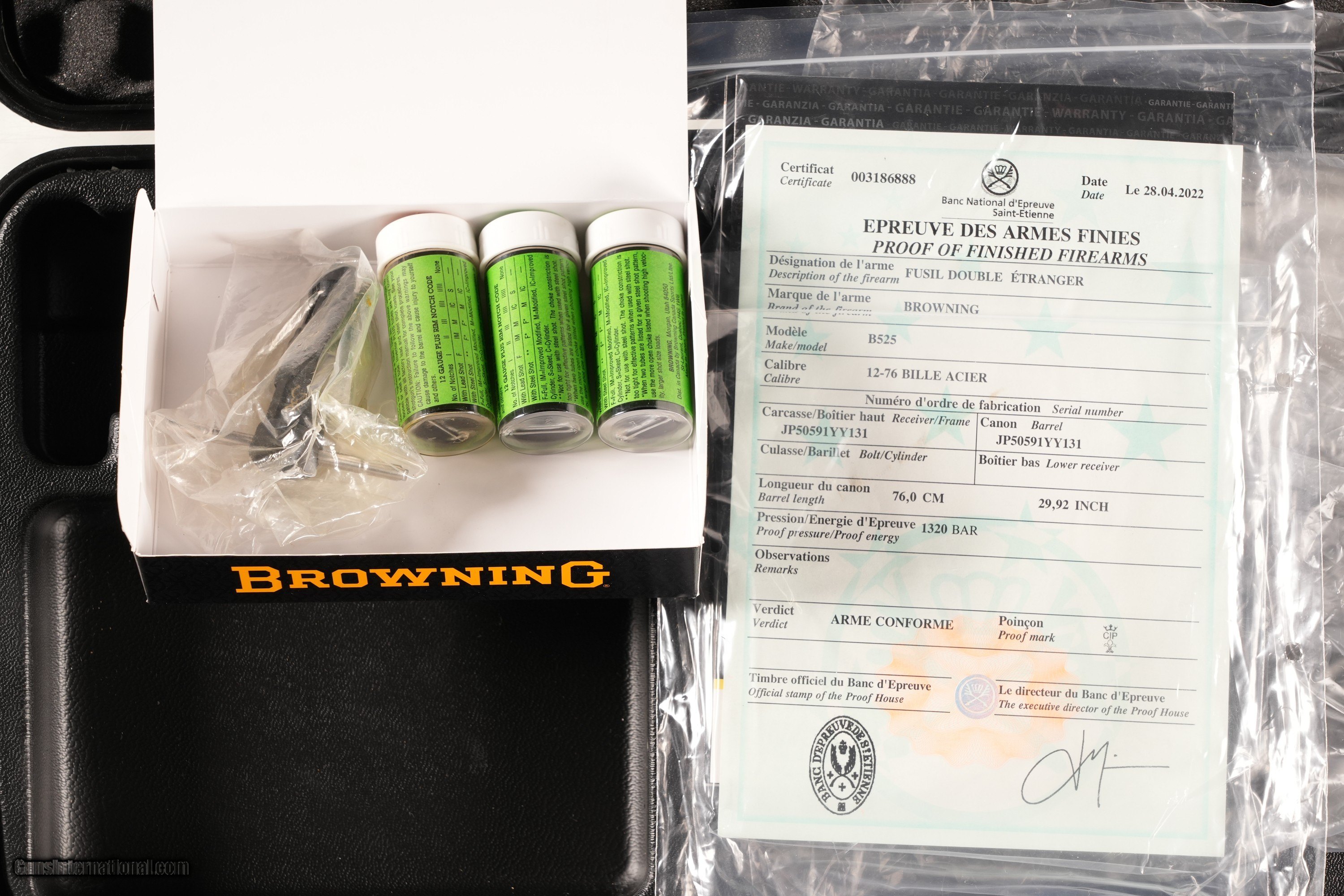 Description: Browning B525 Over/Under Shotgun – 12 GA – 30" – Game Scene Engraved – Cased Serial #JP50591YY131 | Manufactured 2022 | Modern The Browning B525 is a versatile and refined 12 gauge over/under shotgun, perfect for field or sporting use. This model features 30" vent rib barrels and utilizes the proven Invector choke system. Five choke tubes and a wrench are included to suit a variety of shooting scenarios. The coin-finished receiver is beautifully engraved with game scenes of waterfowl and pheasants surrounded by classic scroll and foliate motifs. A satin-finished walnut stock with checkering and factory recoil pad provides a comfortable and stylish shooting experience. Specifications: