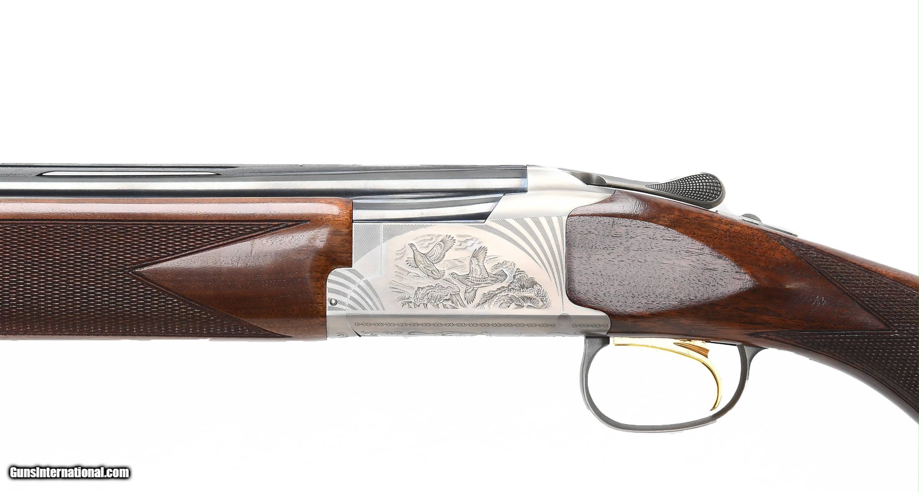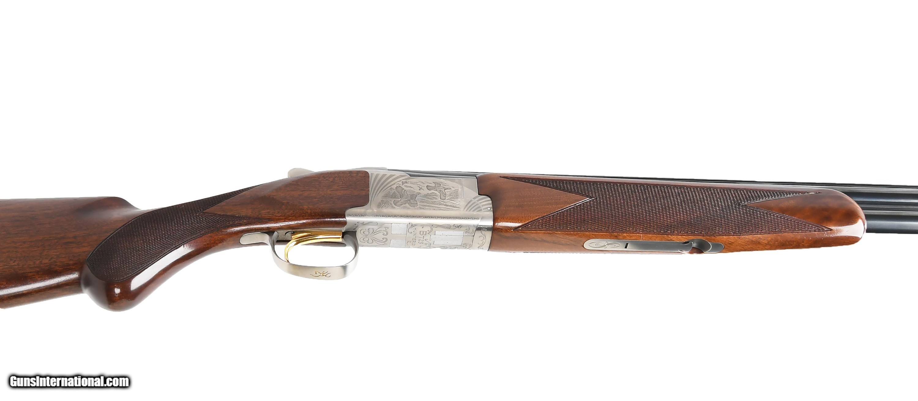 Description: Brownig B725 G1 Hunter 20 gauge O/U shotgun with 32". Although the model has the name "Hunter" in it, the gun is really designed for multi-purpose sporting clays and hunting! If you do not recognize the model, that is because this gun was made for the European market. The 32" barrels have low/narrow vent rib with front bead only. And the barrels are factory fitted with Browning Invector DS long choke tubes. Five tubes come with gun, Skeet, IC, Mod, IM, & Full. Chambered for 2 3/4" & 3" shells. As set-up the stock has a 15" length of pull over the Kick Eez pad and there are two factory pads with gun that will incrementally shorten the LOP. The drop at comb is 1 3/8" and the drop at the heel is 2 1/4" with neutral to very slight right hand cast. Tight as new and mechanically perfect. The gun weighs 6 lbs. 12 oz. and balances just back of the hinge pin. Factory cased SN: 67783ZW the "ZW" indicates 2014 manufacture SOLD |