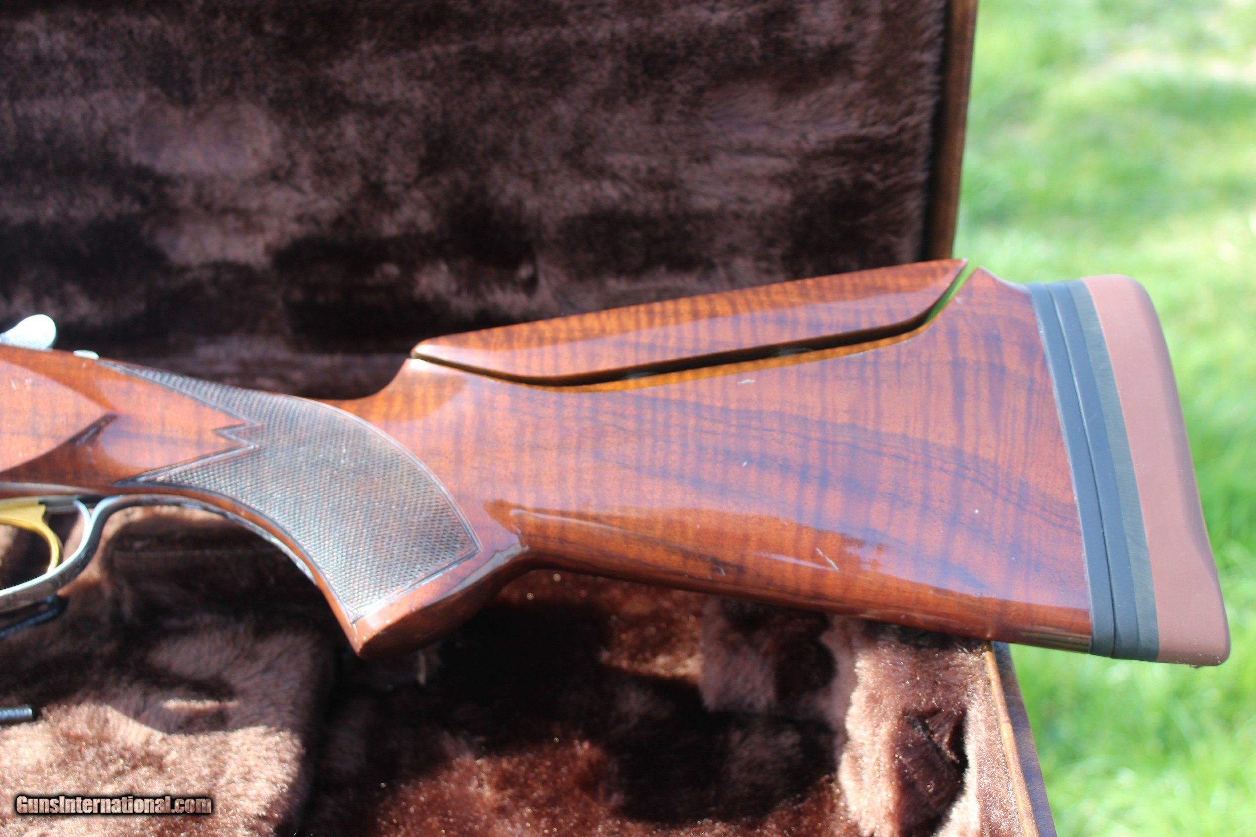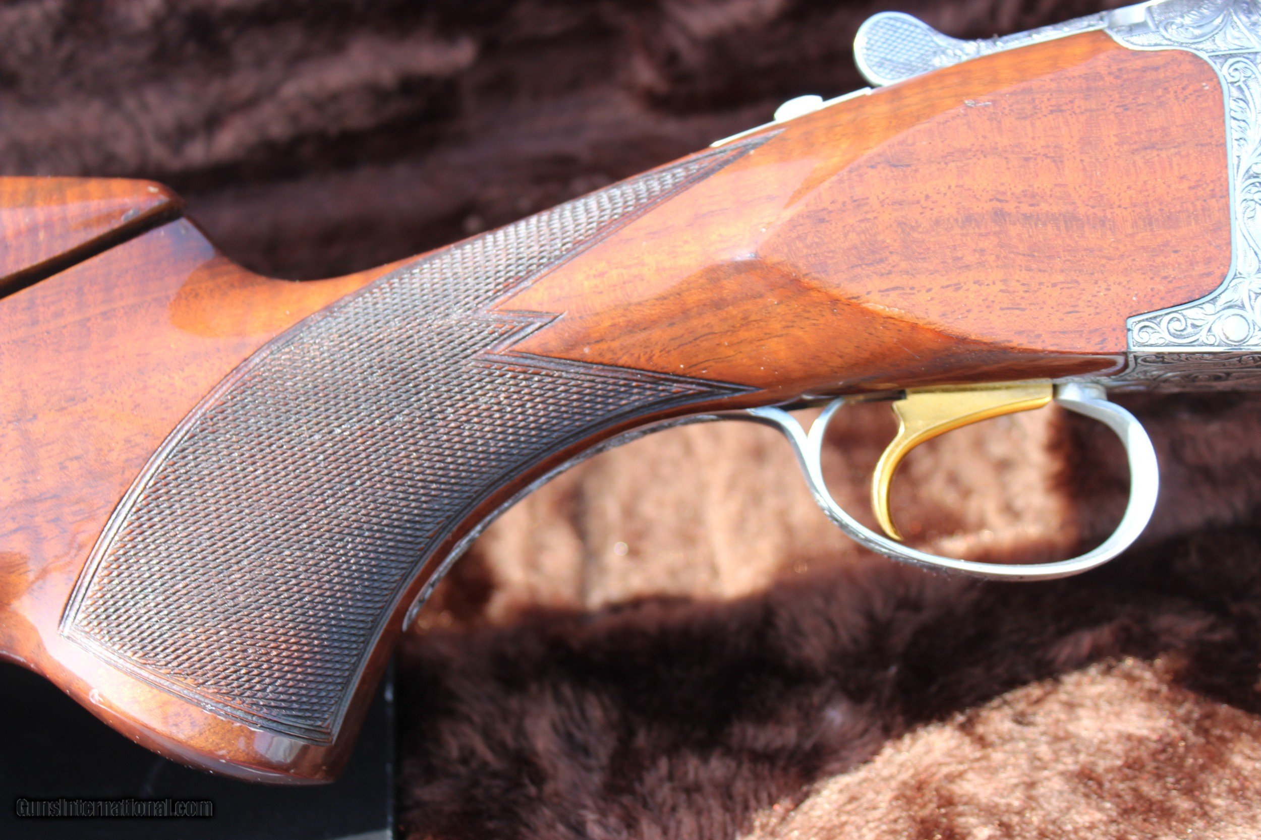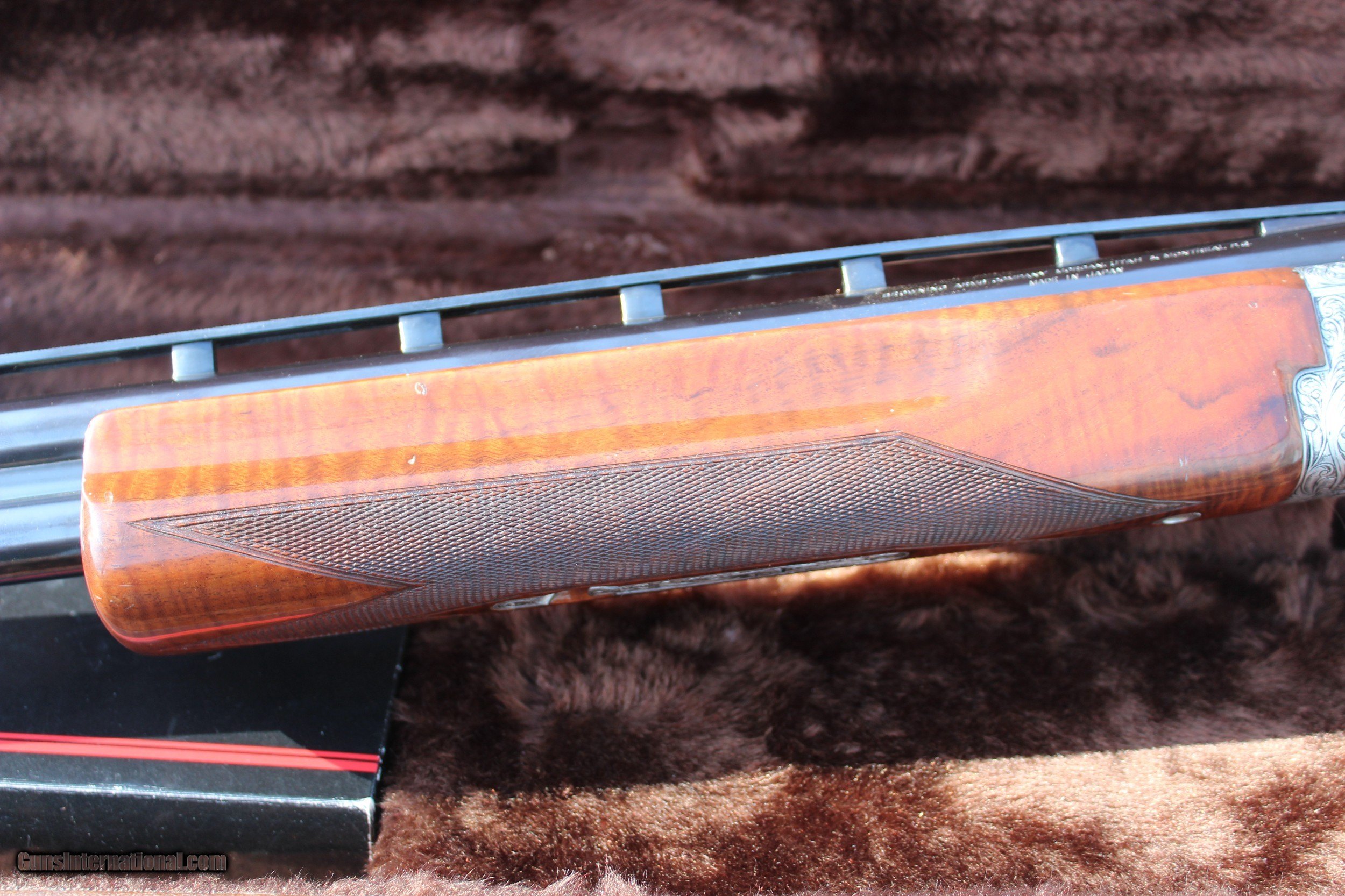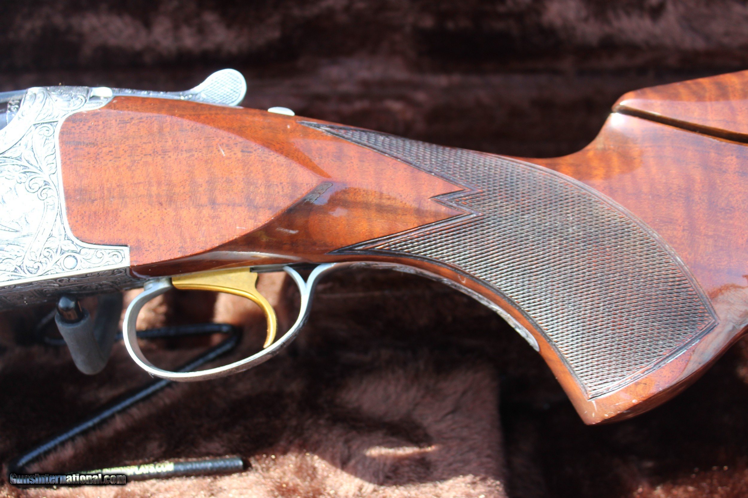 Description: Circa 1982 Deep chisel ,factory hand engraved game scene 32 " barrel with excellent bores Choked full/improved modified 10 mm high rib Fiddleback walnut stock and fore end Adjustable butt plateand comb Drop at heel 2 1/4 " drop at comb 1 1/2 " LOP 14 1/2 " 99 % factory bluing & coin finish with several nicks at toe of stock Weighs 8lbs 15 oz These early grade fives were hand engraved like the Superposed models.They are very similiar to the Diana grade Browning hard shell case included $ 4695 + Shipping SOLD |