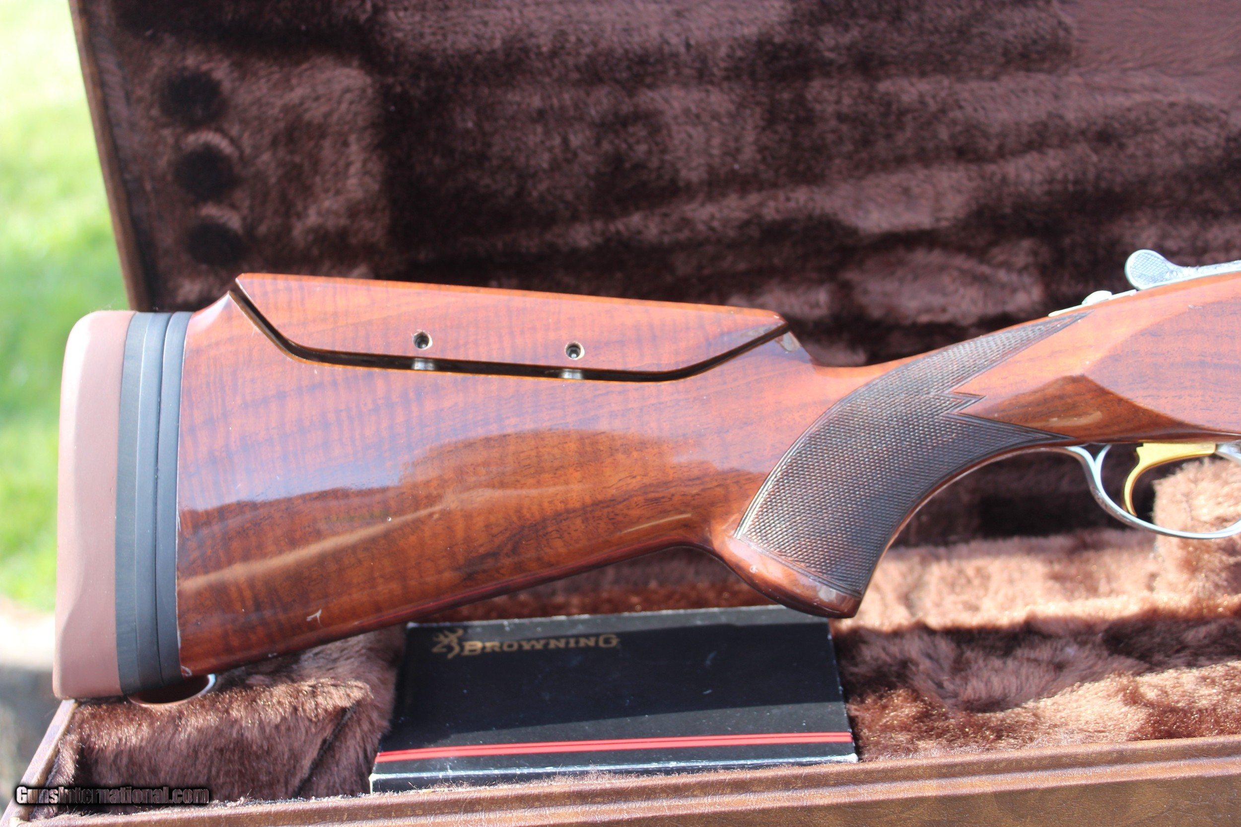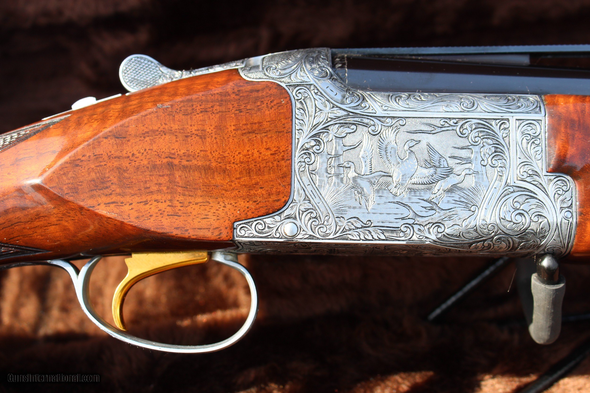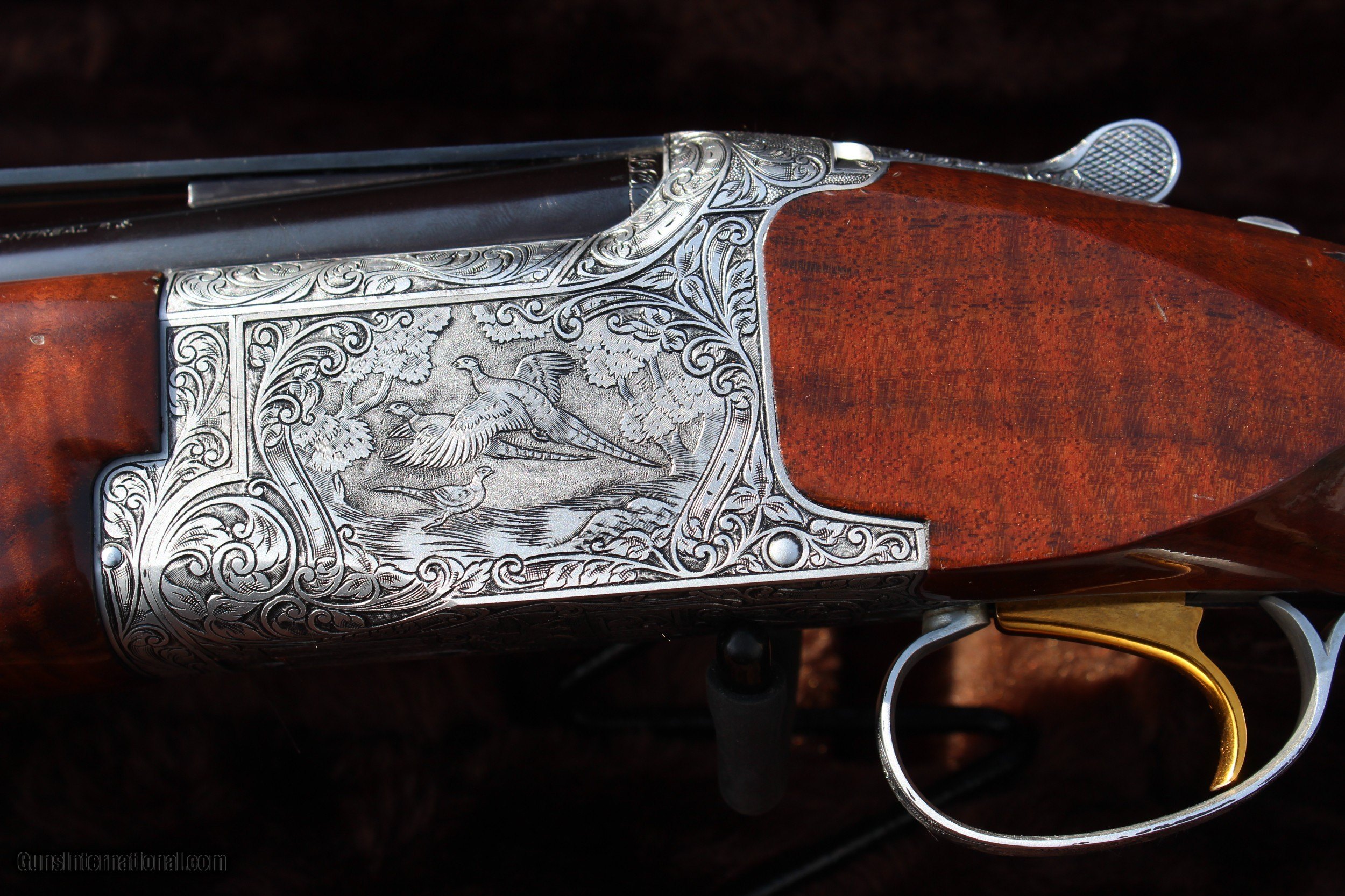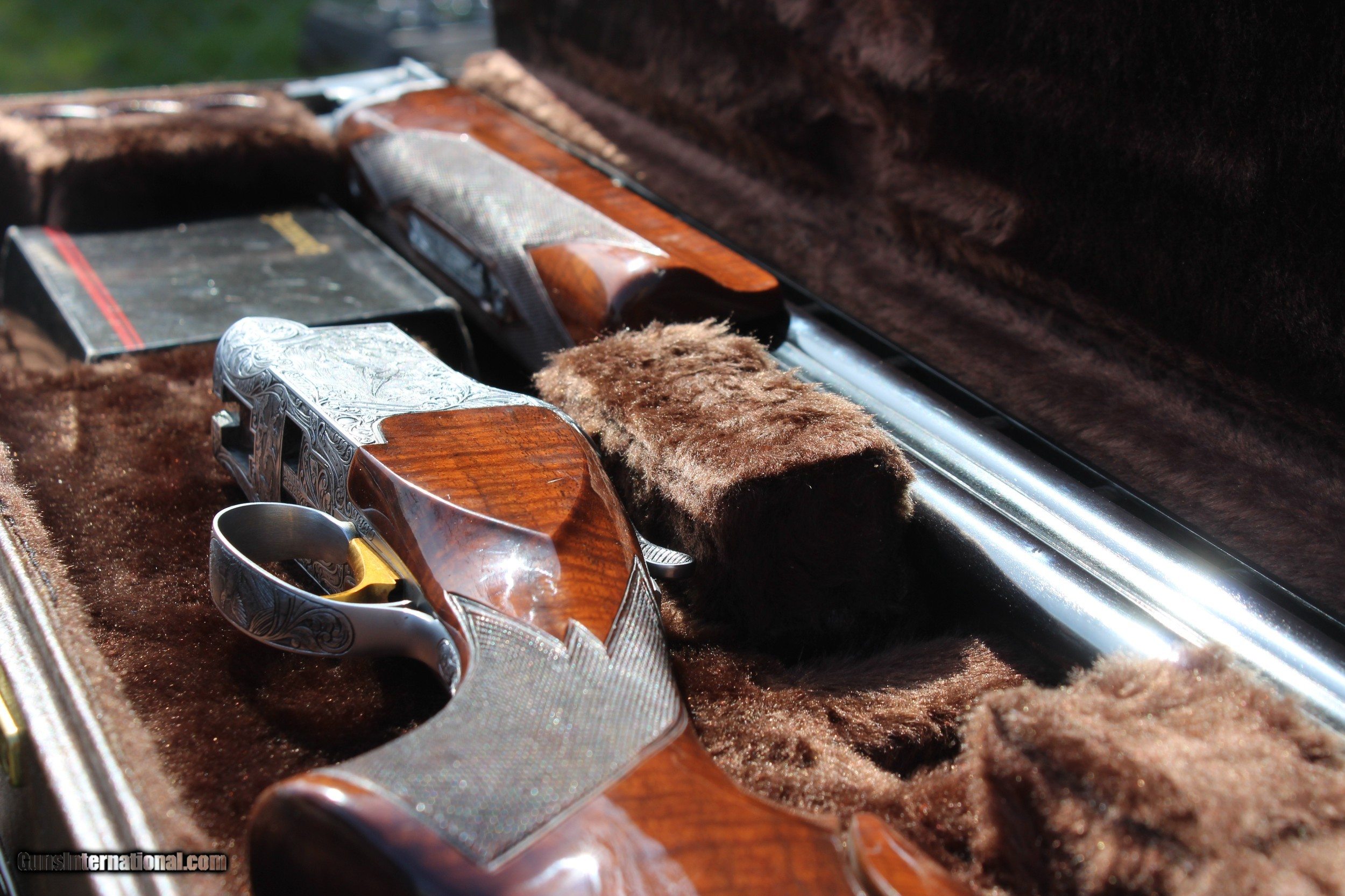 Description: Circa 1982 Deep chisel ,factory hand engraved game scene 32 " barrel with excellent bores Choked full/improved modified 10 mm high rib Fiddleback walnut stock and fore end Adjustable butt plateand comb Drop at heel 2 1/4 " drop at comb 1 1/2 " LOP 14 1/2 " 99 % factory bluing & coin finish with several nicks at toe of stock Weighs 8lbs 15 oz These early grade fives were hand engraved like the Superposed models.They are very similiar to the Diana grade Browning hard shell case included $ 4695 + Shipping SOLD |