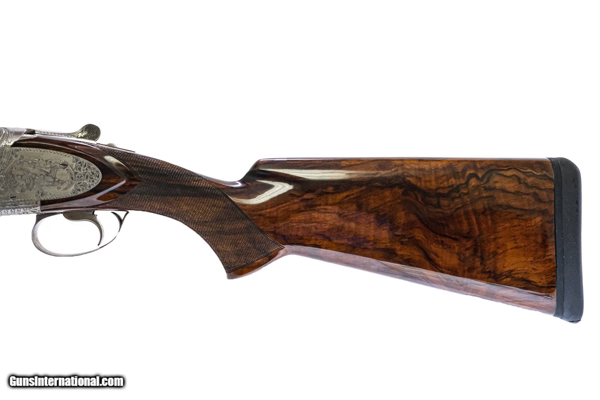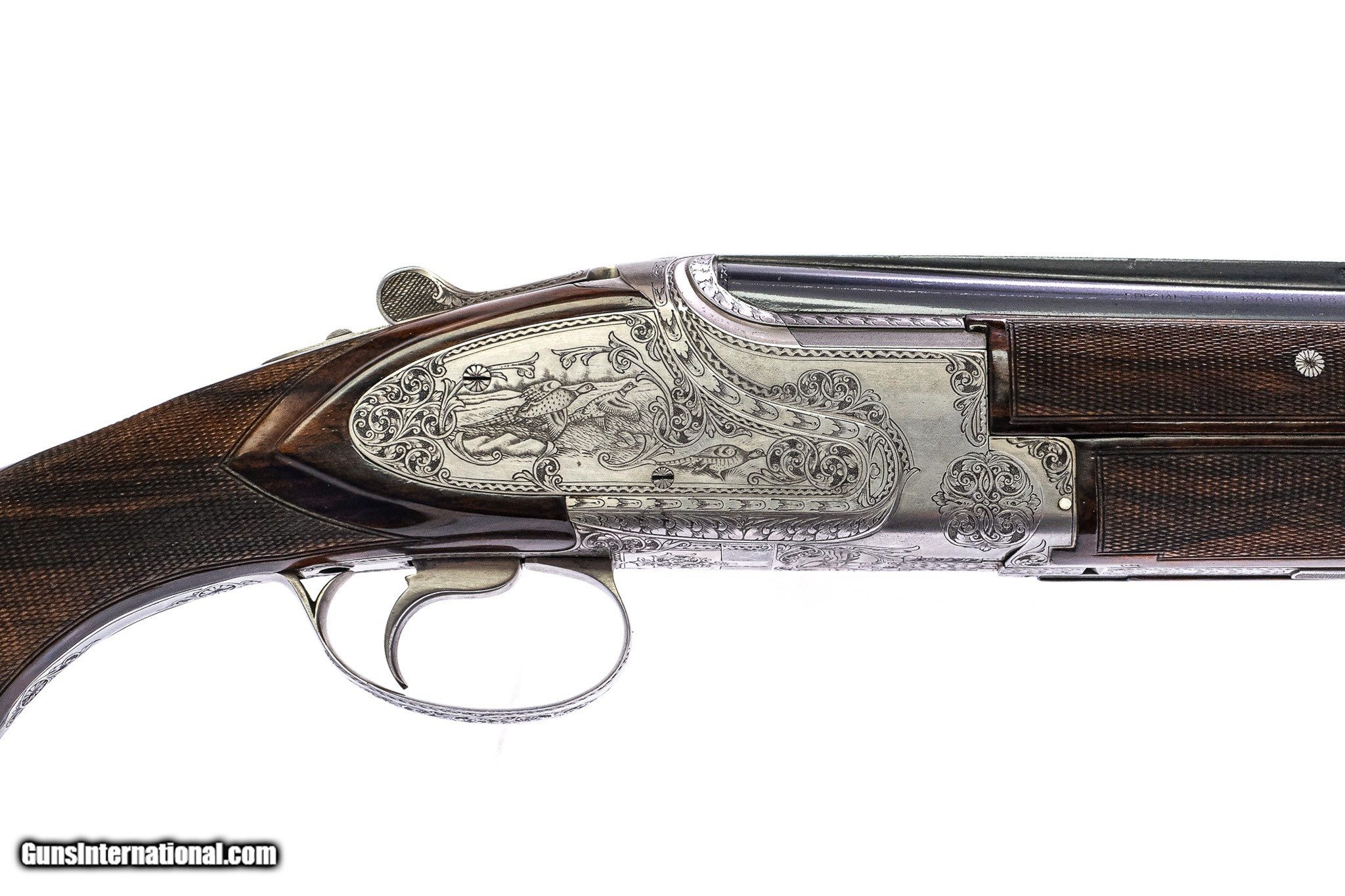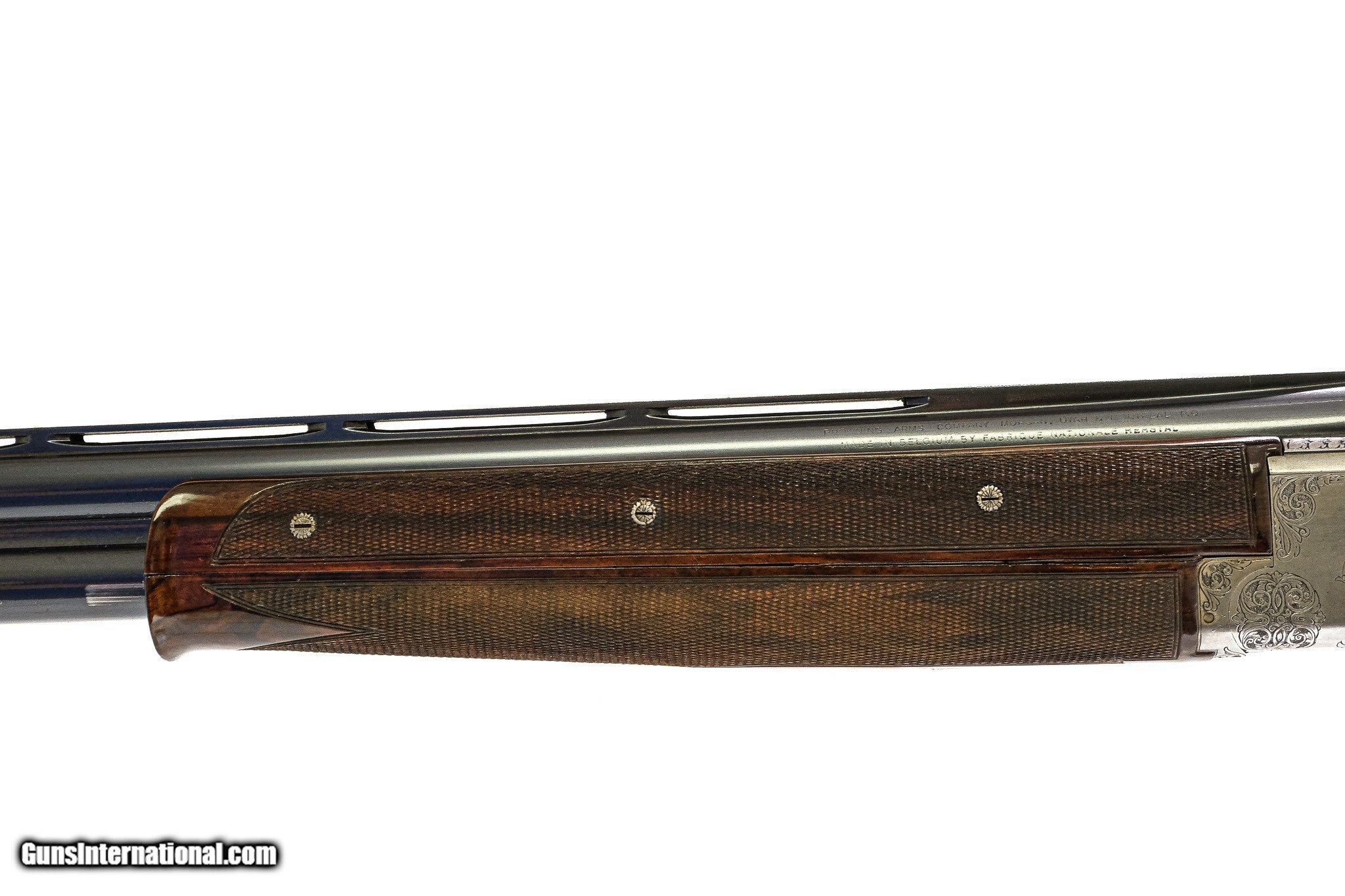 Description: Browning - Exhibition Sideplate, O/U, 12ga. 30" Barrels Choked C/IC. Over and Under, choked few thousandths, 3 piece forend, specially ordered vent rib, magnificently engraved with ornamental scroll, quail on the left lock plate, pheasants on the right, and a duck scene on the bottom, long tang, dual pistol grip, special order customer selected Turkish Walnut, single trigger, auto ejector, recoil pad, and schnabel forend. This is a very high grade gun built in the Browning custom shop for a customer who went and order it . The replacement cost of this gun is close to $40,000. It’s as New, and possibly unfired. Inv: 71916 7 lbs. 7 oz. 14 1/2" x 1 3/8" x 2 1/4" $12,995.00 SOLD |