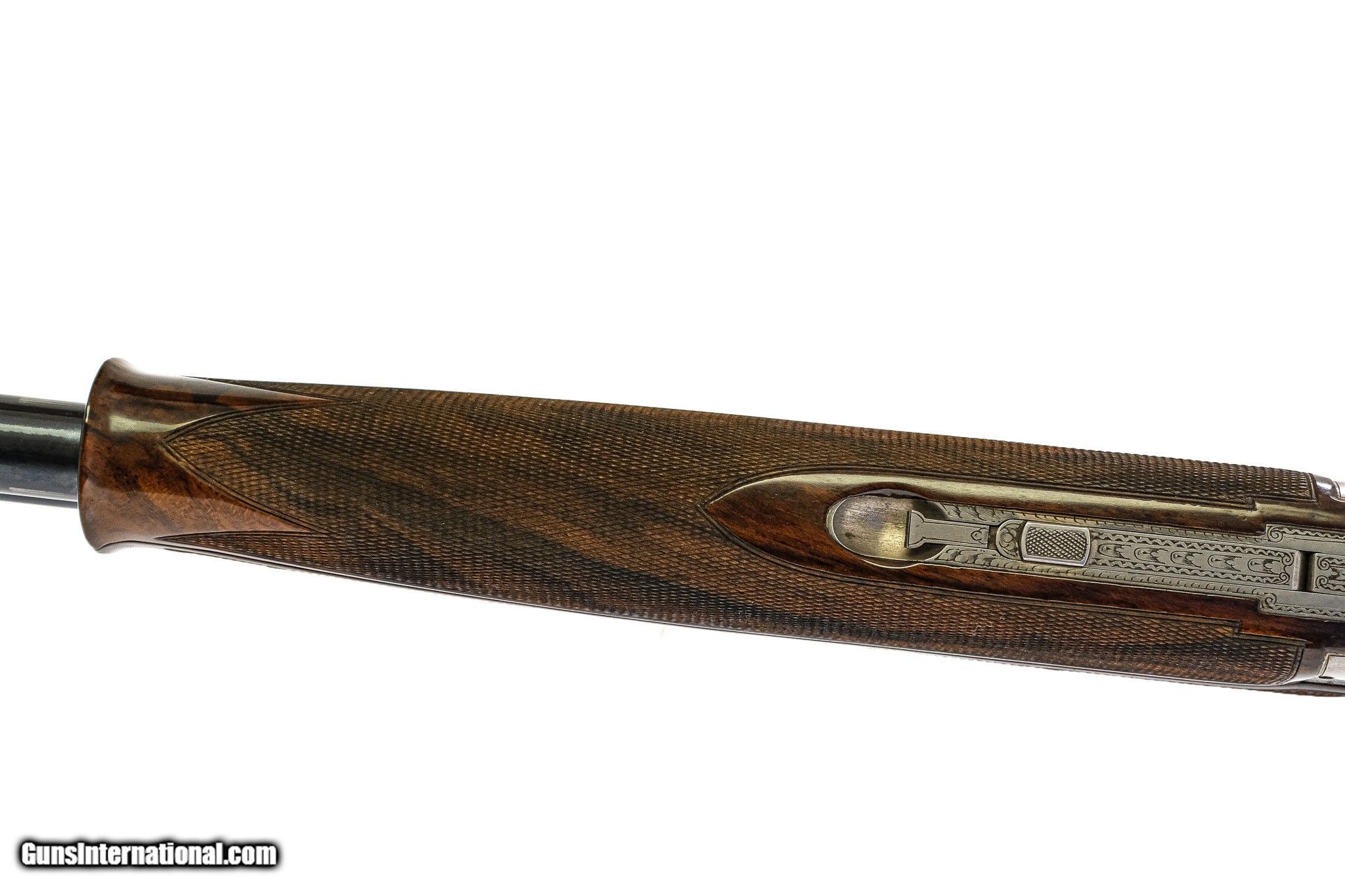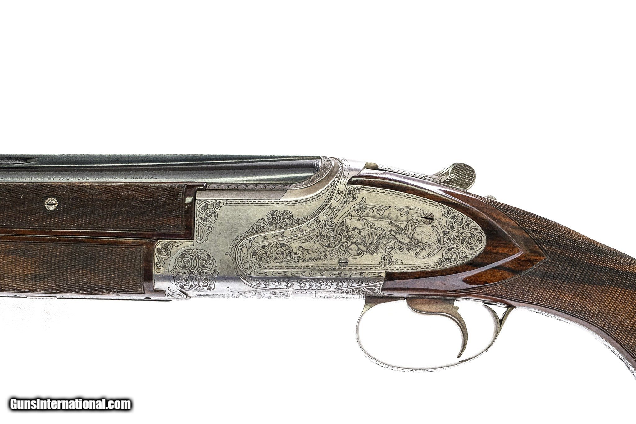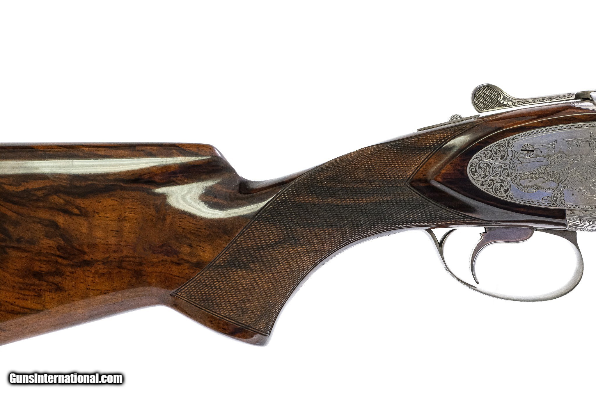 Description: Browning - Exhibition Sideplate, O/U, 12ga. 30" Barrels Choked C/IC. Over and Under, choked few thousandths, 3 piece forend, specially ordered vent rib, magnificently engraved with ornamental scroll, quail on the left lock plate, pheasants on the right, and a duck scene on the bottom, long tang, dual pistol grip, special order customer selected Turkish Walnut, single trigger, auto ejector, recoil pad, and schnabel forend. This is a very high grade gun built in the Browning custom shop for a customer who went and order it . The replacement cost of this gun is close to $40,000. It’s as New, and possibly unfired. Inv: 71916 7 lbs. 7 oz. 14 1/2" x 1 3/8" x 2 1/4" $12,995.00 SOLD |