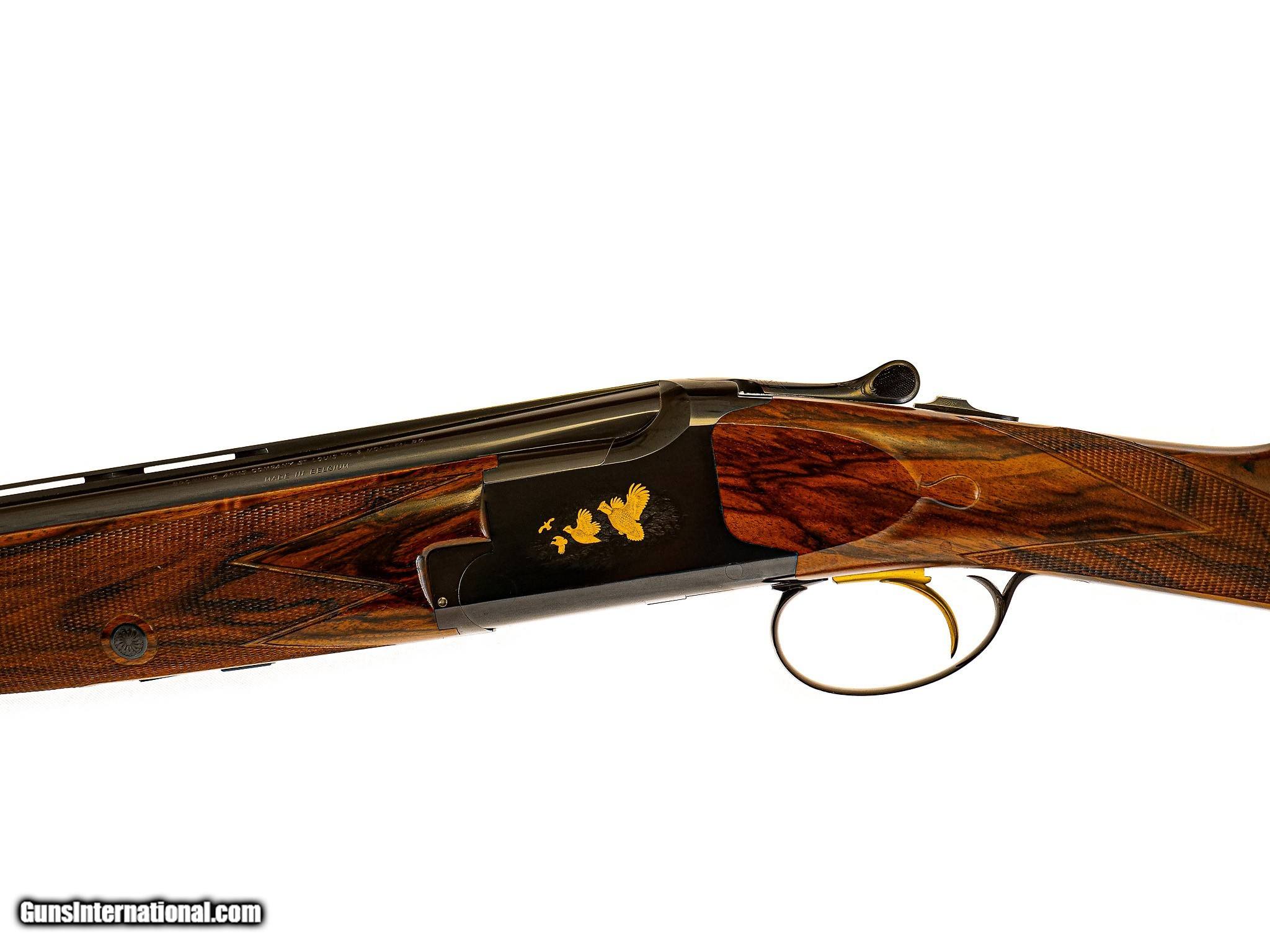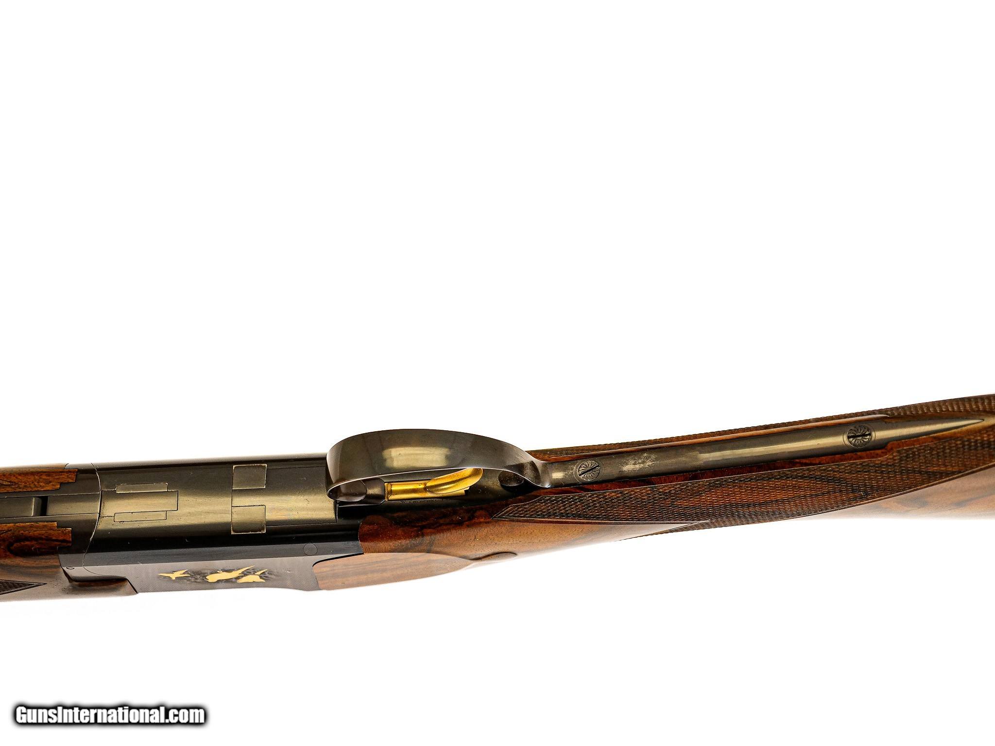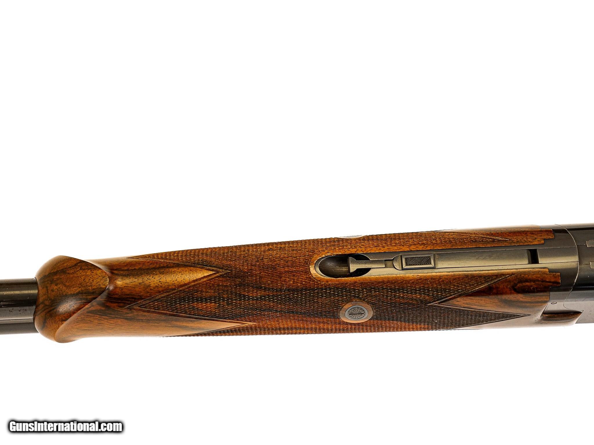 Description: Browning - Superlight (Churchill Engraved), 20ga. 26 ½" Barrels Choked M/F. The best Exhibition walnut straight grip stock, leather covered pad, single trigger, Belgian manufacture Superlight, Schnabel forend, automatic ejectors, gold oval, vent rib, stocked by Jerry Fisher, the engraving features gold inlayed quail and dove game scenes executed and detailed to highest level by the Master Winston Churchill, top lever engraved with light scroll and a banner "No.2", the shotgun is accompanied by the best oak & leather case with all the proper accouterments and a canvas cover, the gun remains in pristine as new condition with only very minor handling marks, an opportunity to own a gun engraved by one of the most revered engravers ever, available for immediate delivery. Inv: 25297 6 lbs. 5 oz. 14 ½" X 1 3/8" X 2 ¼" $48,995.00 SOLD |
