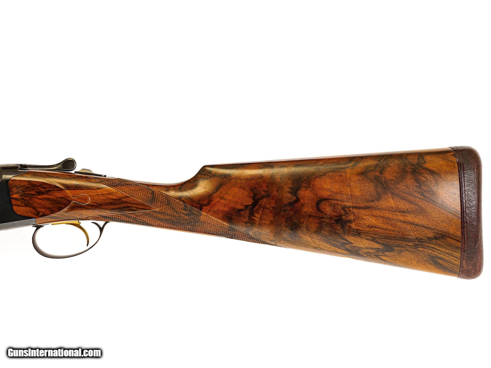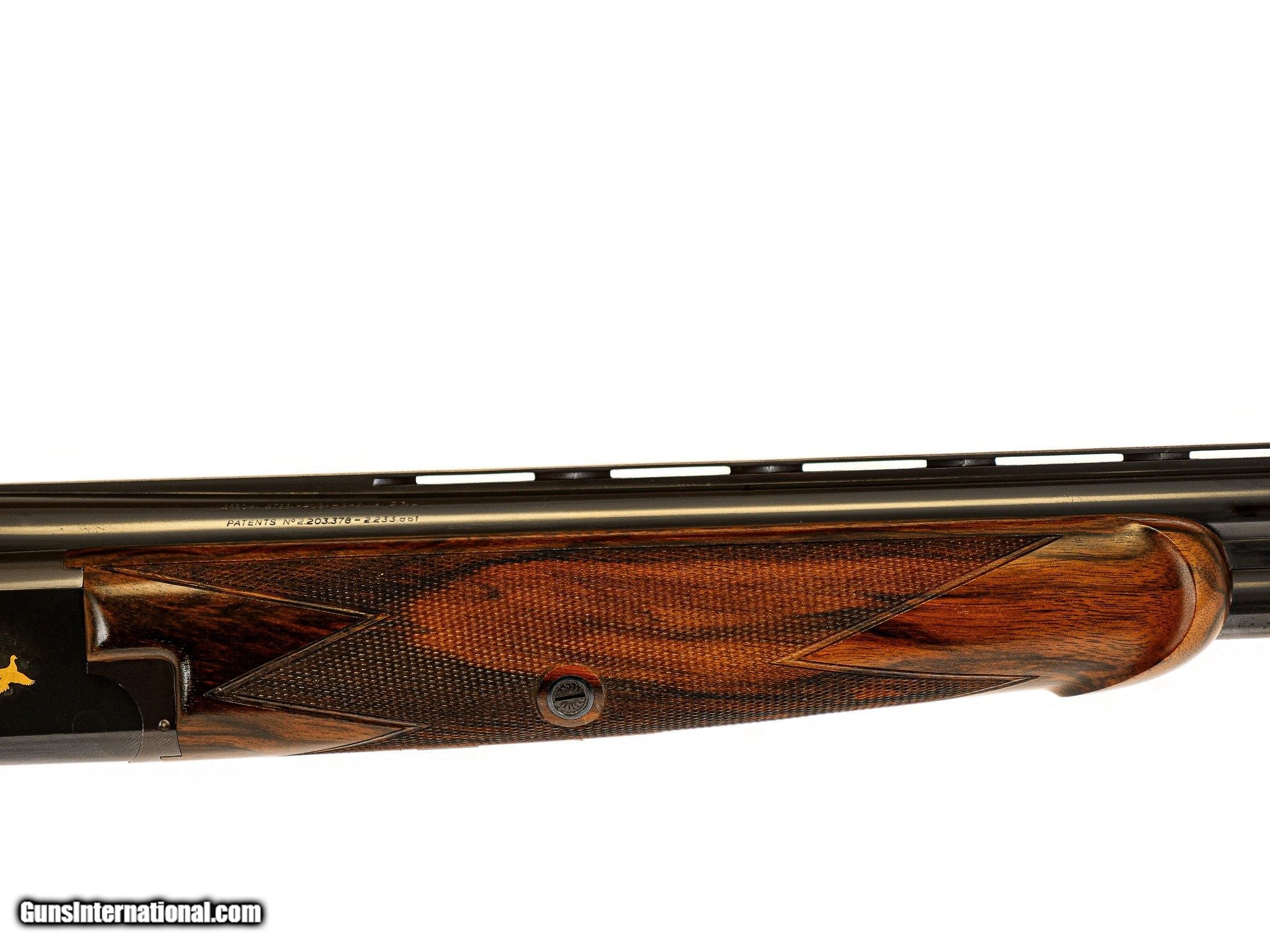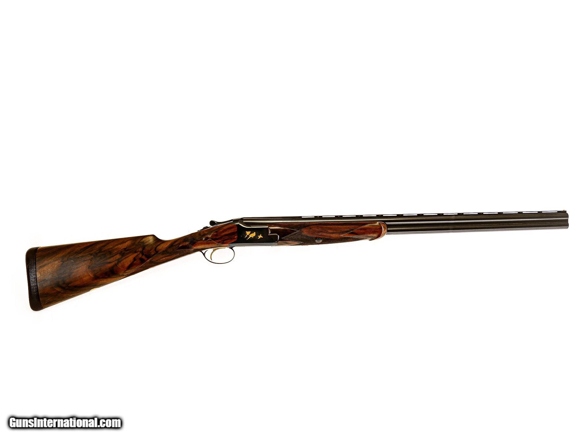 Description: Browning - Superlight (Churchill Engraved), 20ga. 26 ½" Barrels Choked M/F. The best Exhibition walnut straight grip stock, leather covered pad, single trigger, Belgian manufacture Superlight, Schnabel forend, automatic ejectors, gold oval, vent rib, stocked by Jerry Fisher, the engraving features gold inlayed quail and dove game scenes executed and detailed to highest level by the Master Winston Churchill, top lever engraved with light scroll and a banner "No.2", the shotgun is accompanied by the best oak & leather case with all the proper accouterments and a canvas cover, the gun remains in pristine as new condition with only very minor handling marks, an opportunity to own a gun engraved by one of the most revered engravers ever, available for immediate delivery. Inv: 25297 6 lbs. 5 oz. 14 ½" X 1 3/8" X 2 ¼" $48,995.00 SOLD |