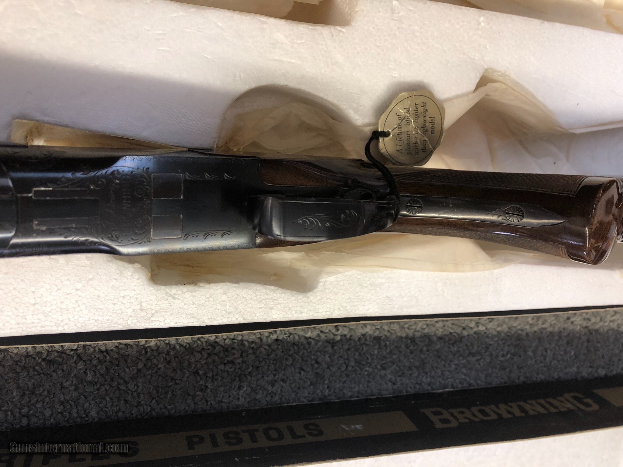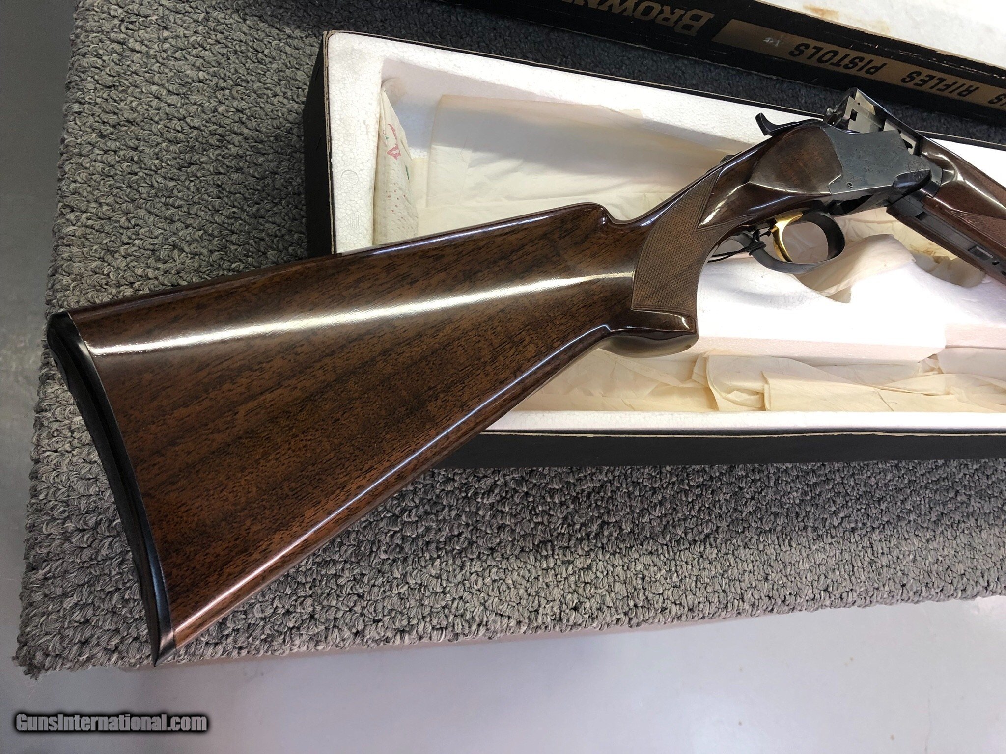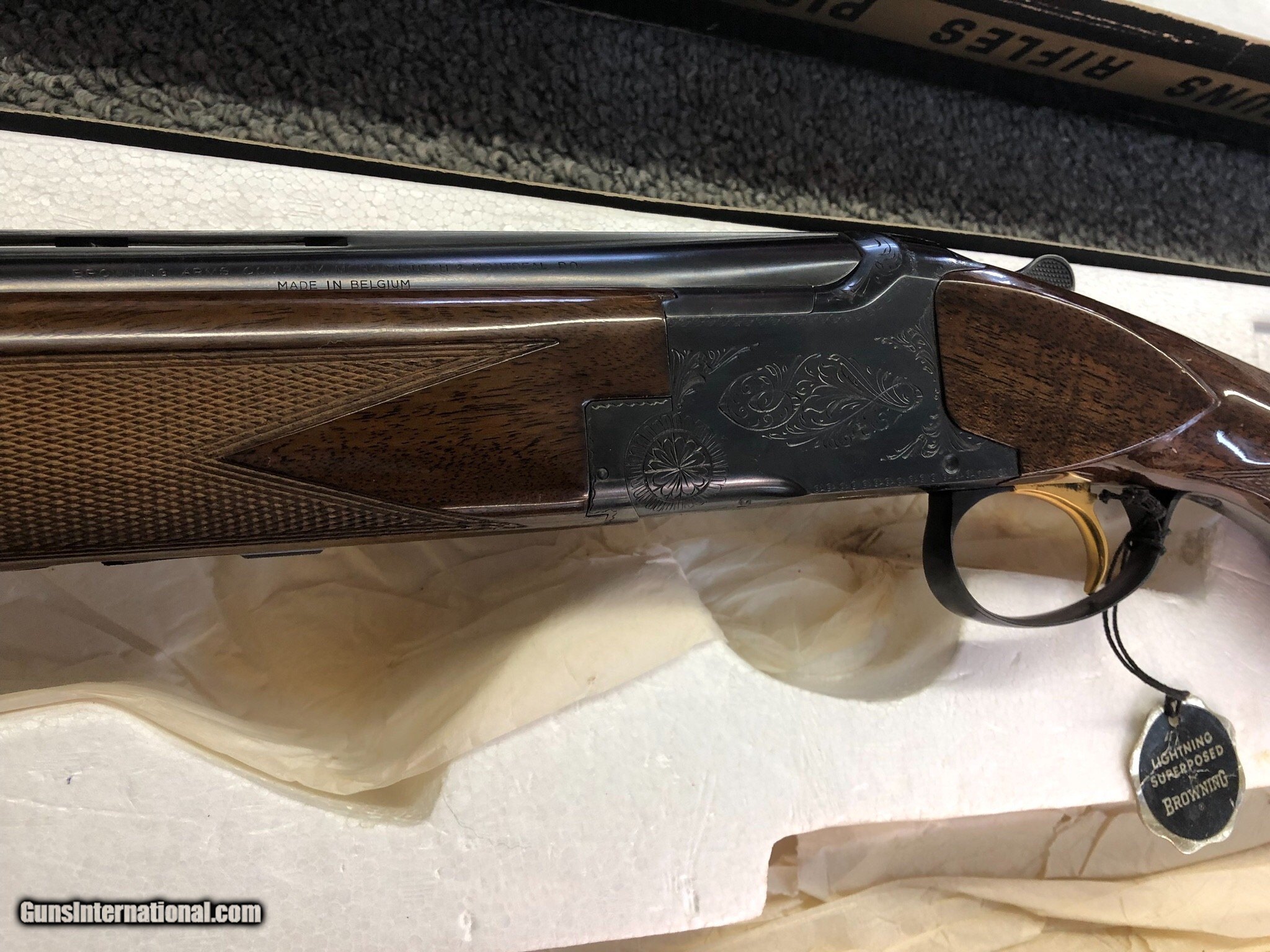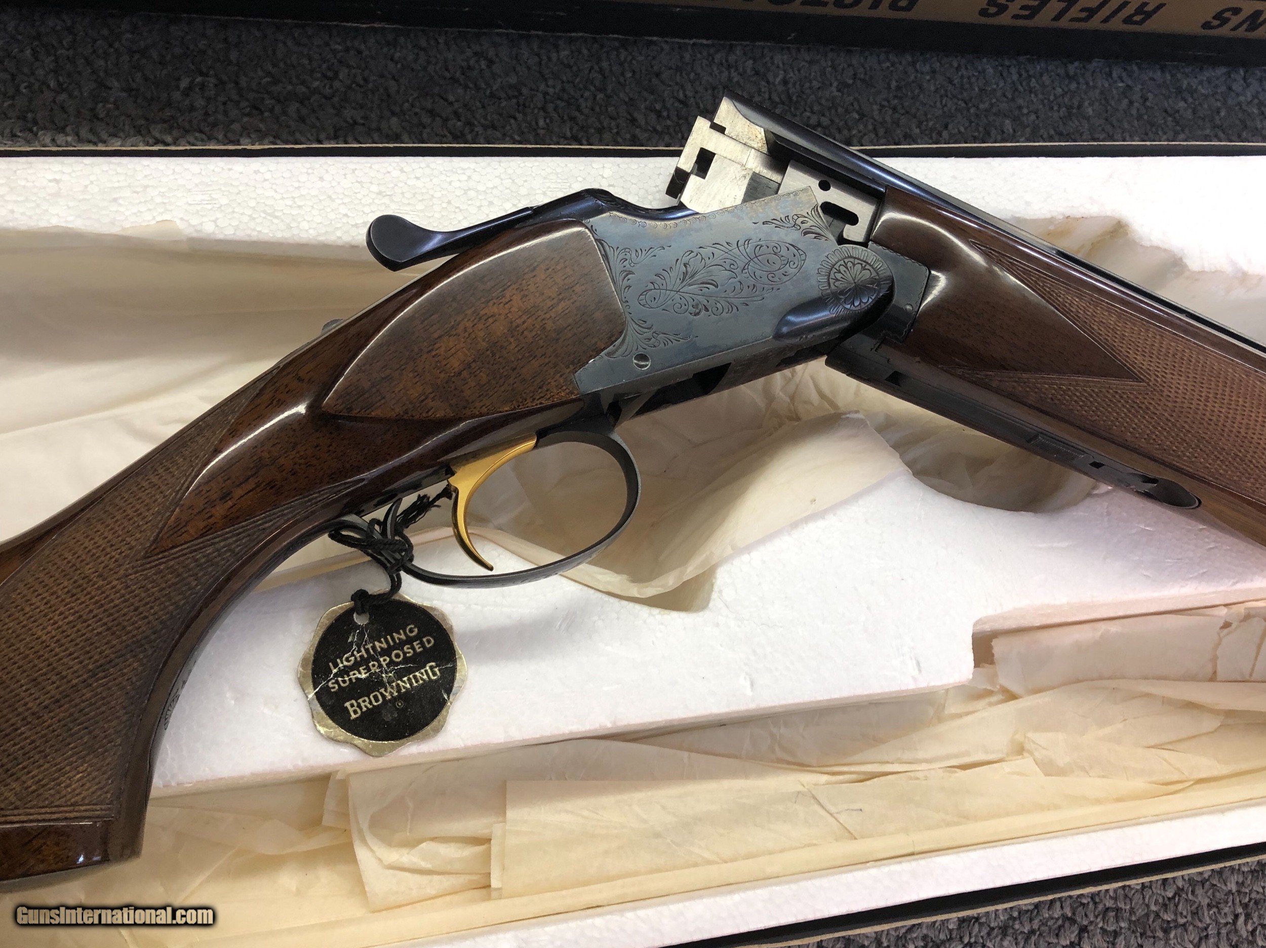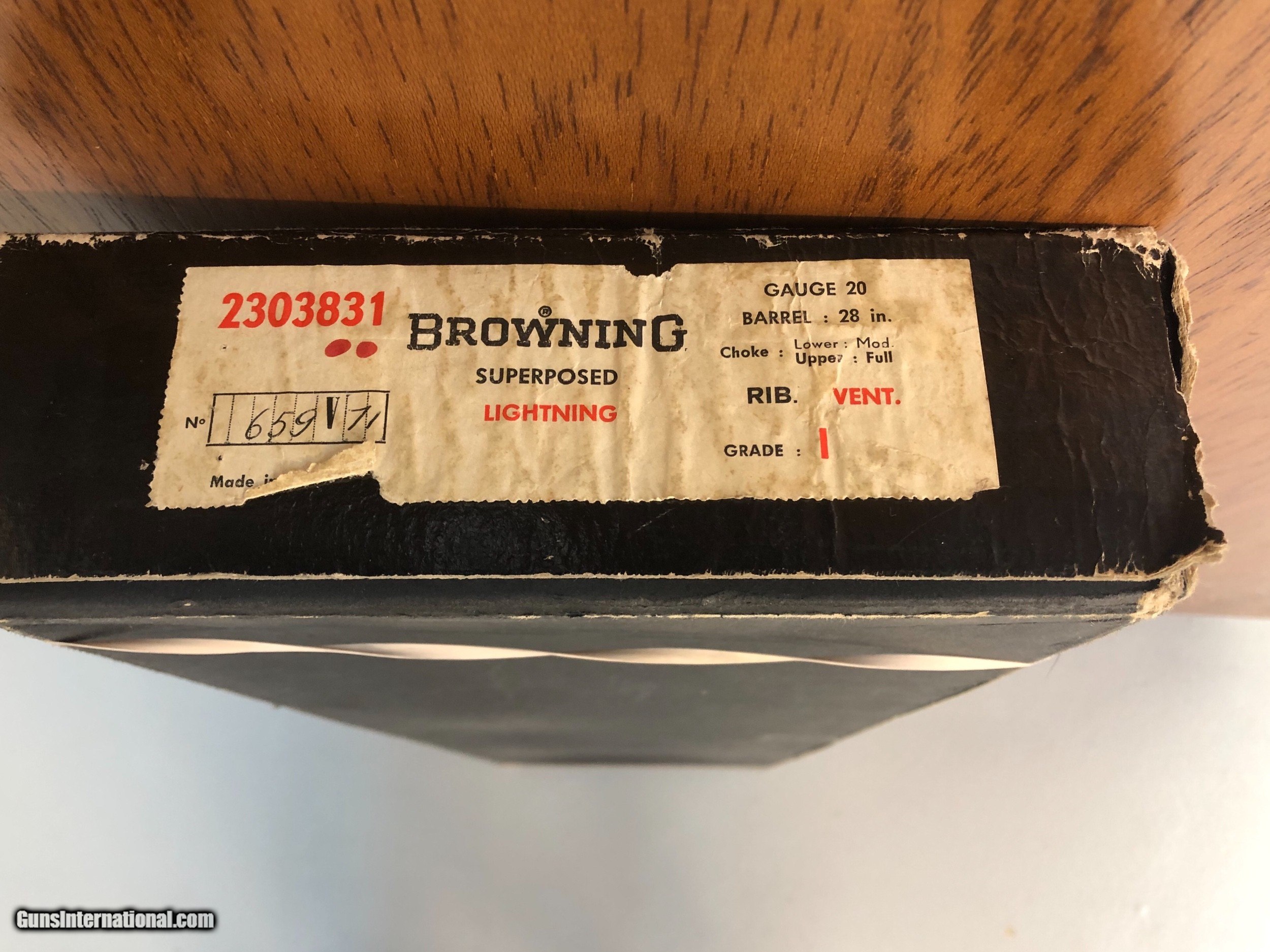 Description: SALE PENDING. A very nice 1971 20 bore Superposed Lightning with a long tang and flat knob. It’s 100% original with minimal use and very attractive dark wood! The metal is 99% and the wood 98% with just some minor usage marks. The barrels are 28 inches long and bored modified and full. The gun is tight to open. It’s in the original box. The box is in fair condition. In 1971, Browning started using mechanical triggers and this gun has that feature. Sure to please and I PAY SHIPPING & INSURANCE to the lower 48. SOLD |