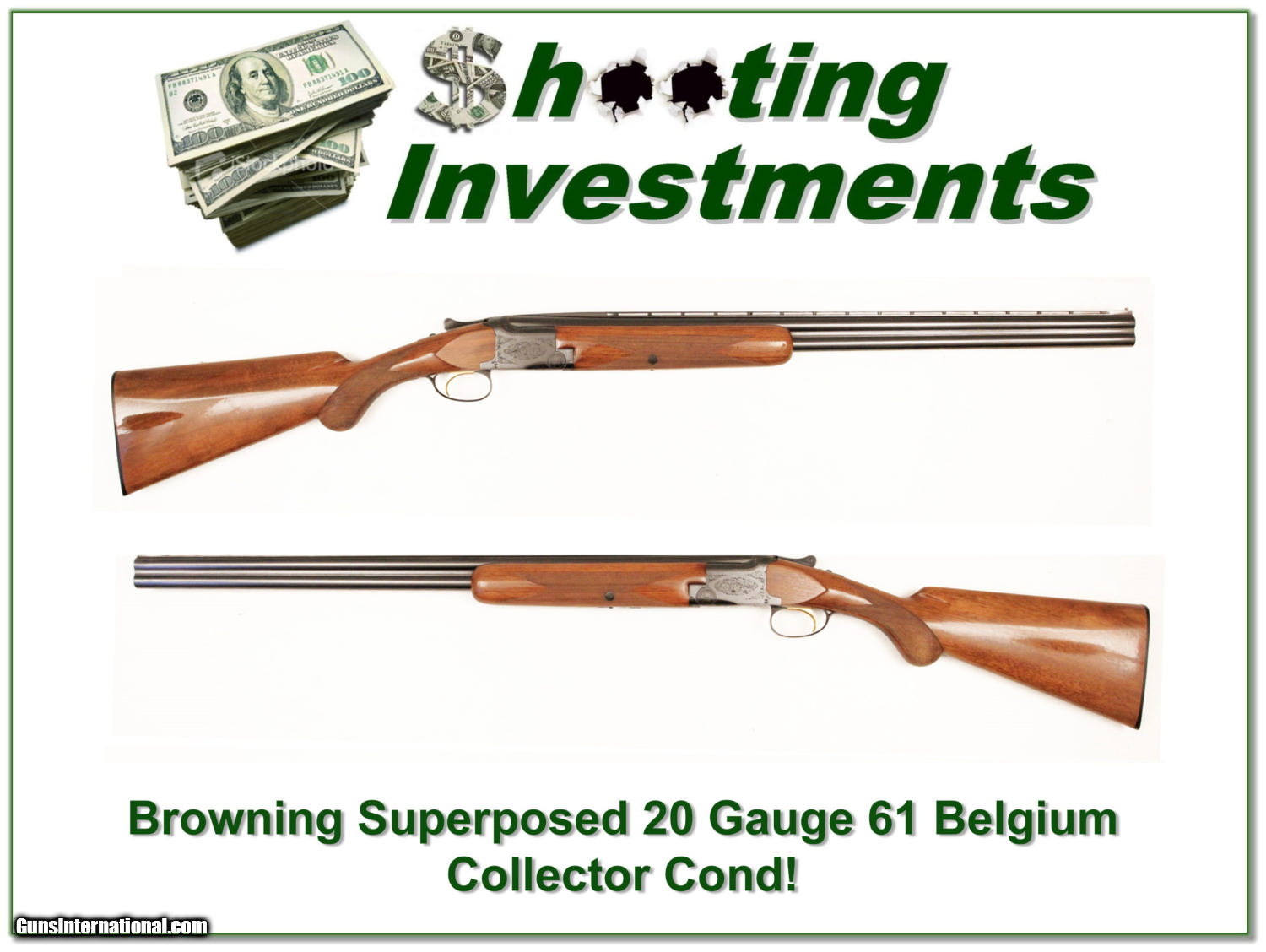 Description: This is a 1961 Belgium made Browning Superposed 20 Gauge. It is in excellent condition. The blue shows no edge wear or forearm wear. The barrels are 26in Mod and IC. The round knob long tang wood has only a few marks here and there. This will make a perfect classic field gun you can use and still expect to increase in value over time. That is what I call a Shooting Investment! Shipping and insurance is $40 or $18 more if you want it shipped in a new Plano hard case. Please email me with any questions or larger pictures. (I now consign quality firearms only 10%! Let me know if you have any you would like to sell!) [15-1213] Payment: Payment is by Money Order, Cashiers Check or Personal Check. I can now also accept MasterCard and Visa with a 3% convenience fee. PayPal can be used for some items but never firearms. Please let us know if you would like to pay via PayPal. Shipping: The shipping charge will be listed in each description. It is $30 for most guns. Some heavy guns or those insured for over $2000 may be higher. Shipments to Alaska and Hawaii are higher because air shipment is required. Most firearms are shipped within 5 days of receipt of payment. We prefer shipping at the beginning of the week to avoid firearms in transit over weekends. We package all shipments carefully and insure them for the full purchase price, rounded up to the next $100. In the unlikely event that damage occurs, it is important that you save all packaging material for the claims process. Optics are shipped Priority Mail and most other non-firearm shipments are shipped First Class. Returns: Our return policy is simple. If for any reason you are not pleased with your purchase, you may return your item for a refund. The only exception is ammunition, it cannot be returned. It is important to us that you are happy. Guns cannot be fired or dissembled before returning them and must be returned in the same condition as received. Notification of a return must occur with-in 3 days of receipt at your dealer. Shipping, convenience and dealer fees are not refundable and are the responsibility of the buyer. Lay-a-way: If needed, we offer a 60 day lay-a-way option on most firearms. It is 1/3 now, 1/3 in 30 days and 1/3 in 60 days. Lay-a-way firearm sales are final. Consigning your firearms with Shooting Investments: We will help you get top dollar for your firearms. While most local guns shops charge 20% or more, our fee is only 10% with a minimum of $50. At your local gun shop it might take months to sell. Selling on-line provides instant access to thousands of interested buyers. You won’t find any other on-line dealer willing to sell your firearms for only 10% or listing every gun on 4 separate s. Selling through an House typically costs the seller 15% and the buyer an addition 15% (so 30%) and you have to wait several months to sell and longer to receive funds. If properly priced, we will sell your firearms in a week or two. Send us an email or give us a call and we’ll explain how easy it is for you to get top dollar. Trading: We collect guns and usually just trade for guns we want to add to our collections. We often sell guns for others wanting to purchase one of ours. We find this the most fair to both of us. Our Commission is only 10% and we hold the gun you want until yours sells. Please contact us if you want to sell one of yours to buy one of ours. Help for California Buyers: We are happy to ship to California. It is the buyer’s responsibility to make sure any item you buy is legal in your state. We are also happy to help with your purchase of a firearm from someone other than us. If you see a gun you would like to buy but the seller can’t or won’t ship to California we can help. You buy the gun and have it shipped to us. We’ll then ship it to your California dealer. The cost for this service is only $30 + shipping. Let me know if we can help! SOLD |