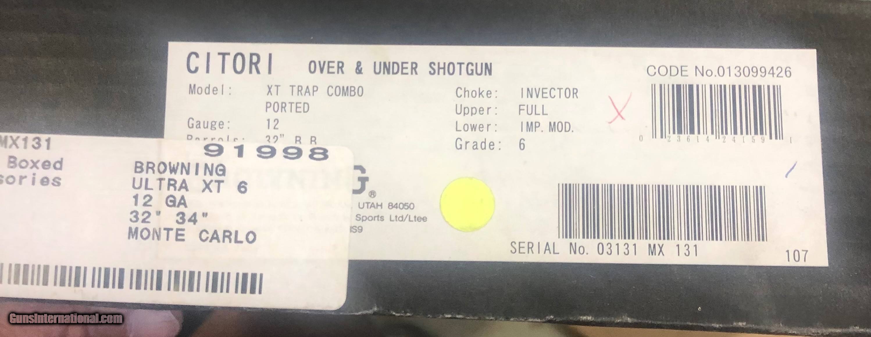 Description: Browning Citori XT 12 gauge Grade 6, Trap Combo 32" O/U and 34" Single, 2-3/4" chamber both factory ported, Invector Plus flush Mount Browning 2-F , 1-M. Rib and stock adjustable wood finish factory gloss, lightly used used <400 rounds fired no signs of handeling ware. Stock dimensions are Browning factory original and have NOT been modified ot altered, 100% factory original.. One small light scratch 0.375 long in clear coat finish right side top, remainder of gun is 100% flawless. Browning Trap 2 barrel Brown hard case, treated gun socks, snap caps, iinclud. Browning OEM factory boxes available see seen in include owning. Purchased new from Jacque's of Ohio, gun is also known as Jacque's High Grad Trap Special. Buyer pays shipping and insurance with cashiers check in full and ships to your FFL. NO SALES TAX Private Party Transfer. Shotgun Gauge: 12 Gauge Manufacturer: Browning Model: XT Trap Combo Barrel Length: 32” & 34” Chambers: 2-3/4” Condition: 99% Metal Condition: 100% Bore Condition: As New Finish: Factory Gloss Chokes: 2-F,1-M Invector Plus Extras: Snap Caps, Socks, Hard Case Price: $5,150.00 Contact Seller |