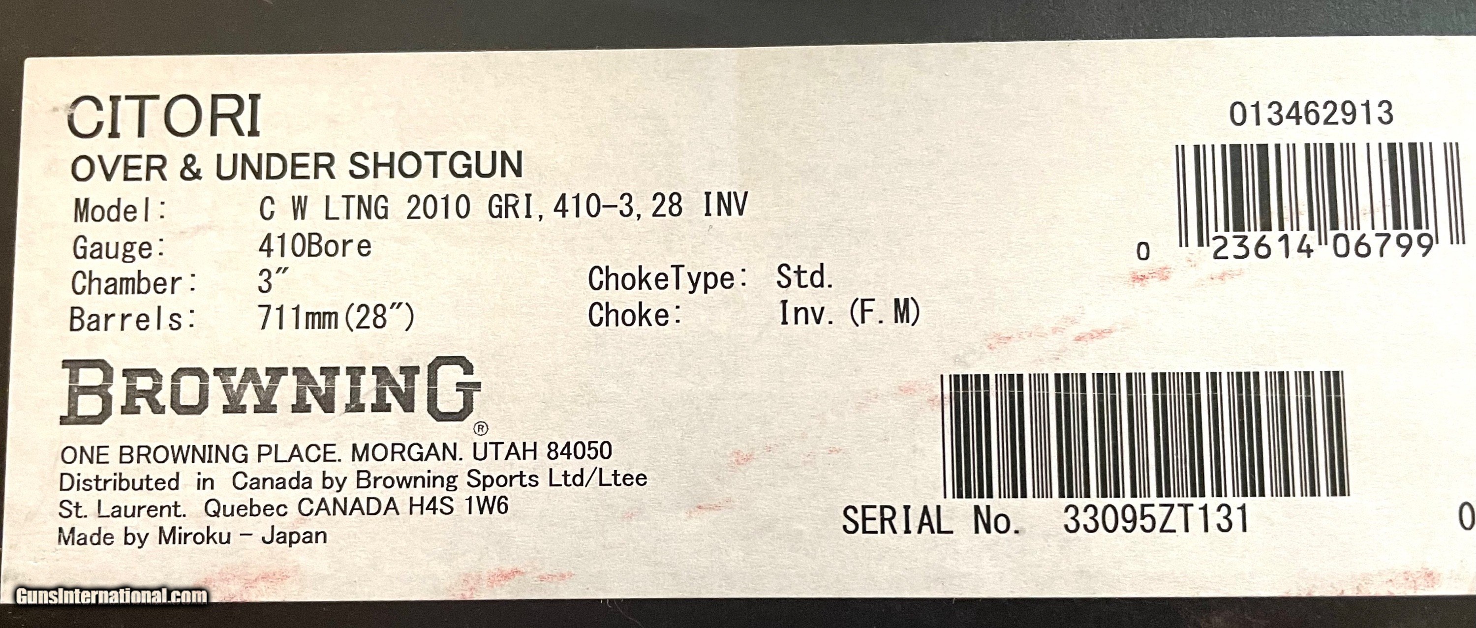 Description: LIke new in box only shot less than 200 times. Includes four Invector chokes: Skeet,Improved Cylinder, Modified & Full. 3 Inch chambers and 28 inch barrells. Great fun to shoot shotgun. $1800 or best offer plus shipping. SOLD Shotgun Gauge: .410 Gauge Manufacturer: Browning Model: Citori White Lightning Serial Number: 33095Z7131 Barrel Length: 28 inches Chambers: 3 inch Condition: Like New in box Metal Condition: Perfect Wood Condition: Perfect Bore Condition: Perfect Barrels: 28 Inch O/U Invector Chokes Triggers: Single Selective LOP: 14 1/8 inches Rib: vent Chokes: Invector Sk, IC, MOD, FULL |