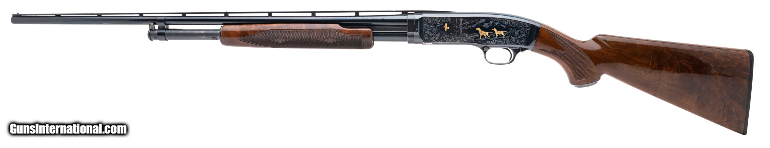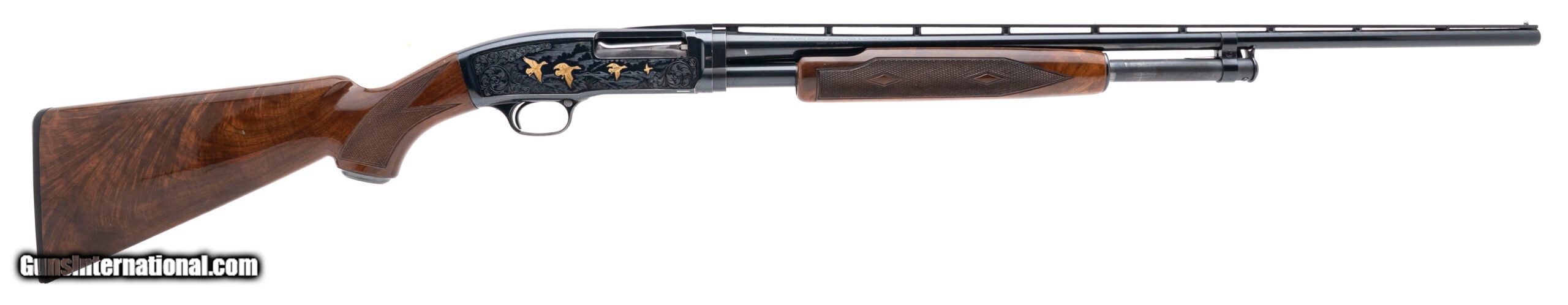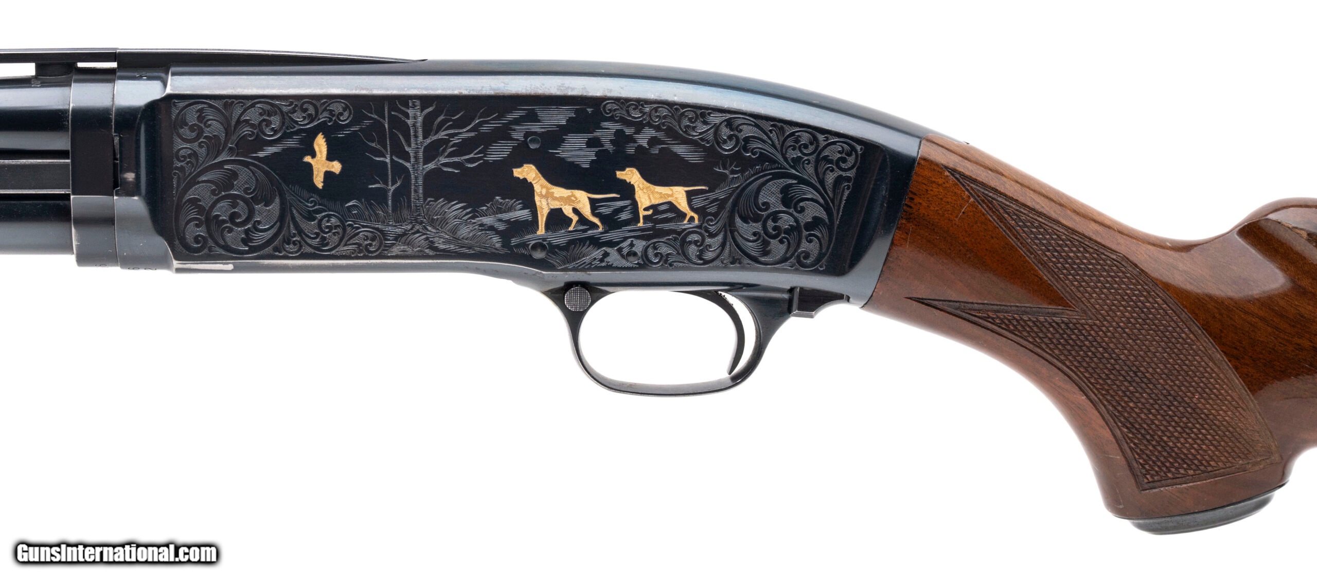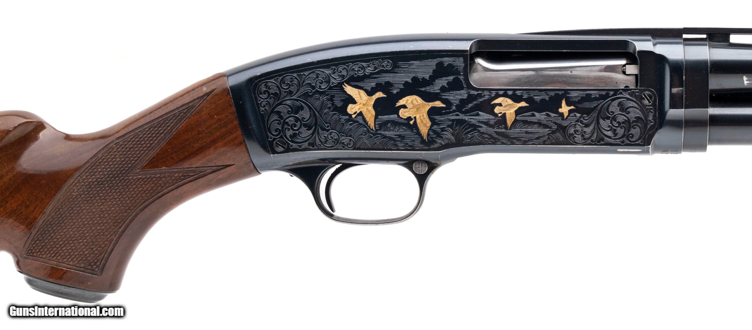 Description: "SN: 03256NZ982. Made in 1991, .410 Gauge with an 26"" Vent Ribbed Full Choke Barrel. Bore is bright. Grade V Pump-Action Shotgun with Engravings and Gold Inlays on the receiver. Finish is in very good condition with minor wear present along the receiver. Wood stock is in very good condition with minor wear present throughout, 14.25"" LOP. SOLD |