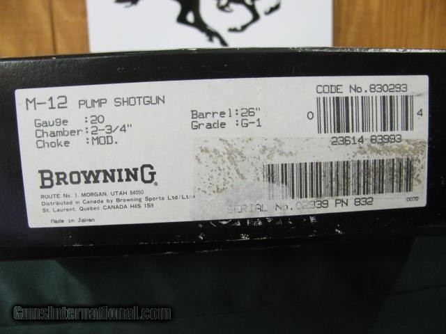 6656 Browning Model 12 20 gauge 26 inch barrels, mod fixed choke, Grade I, pump action, vent rib. never assembled, butt plate, all papers and booklets