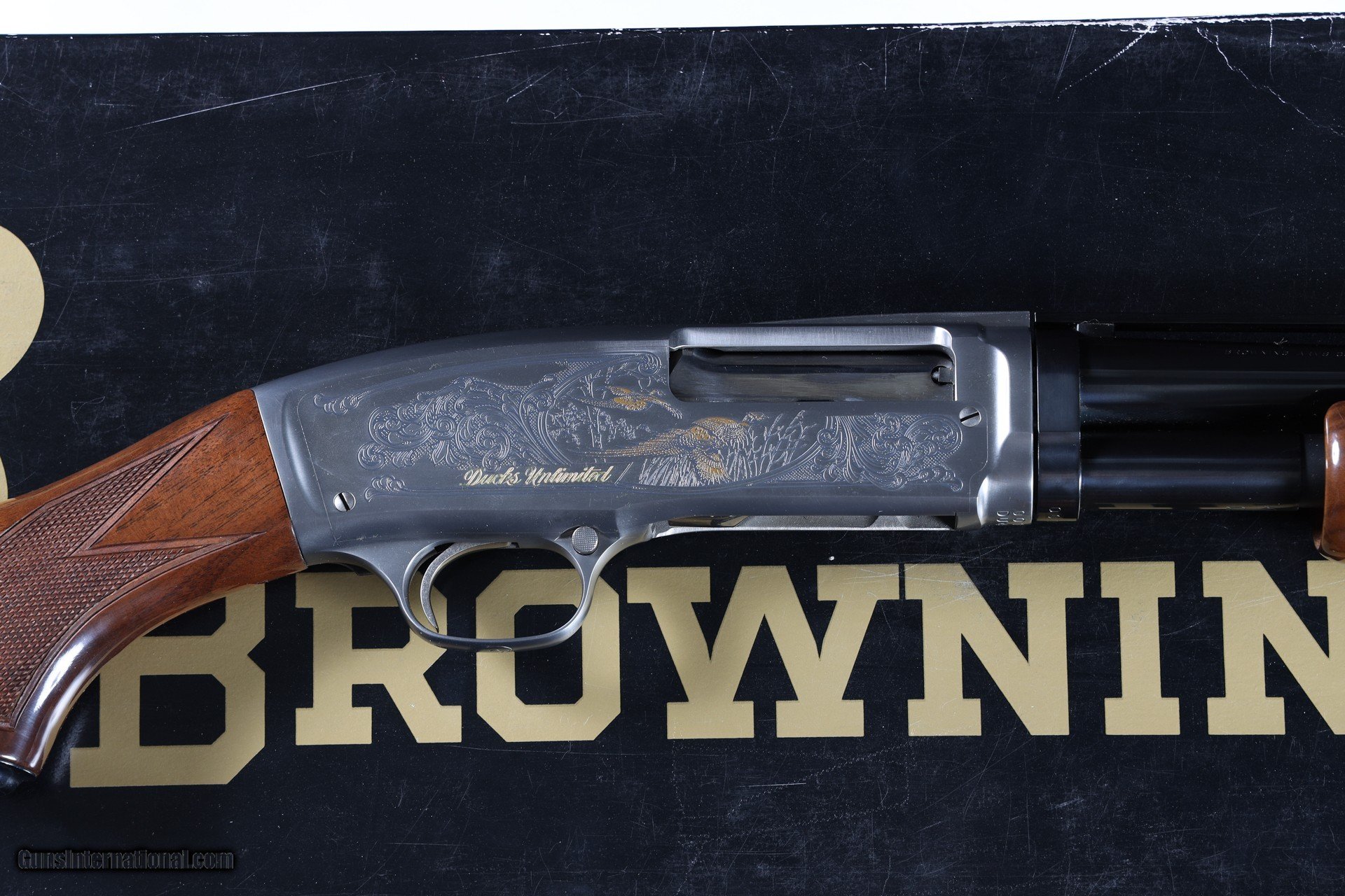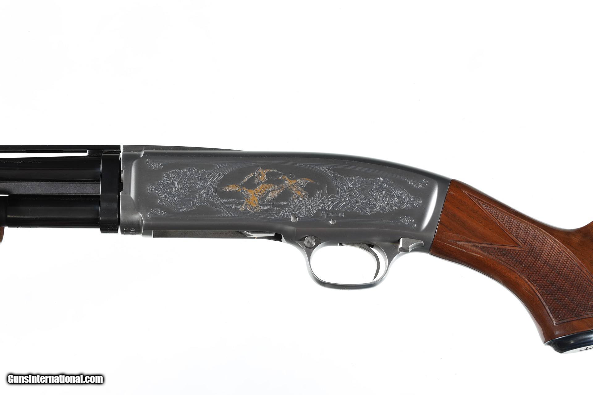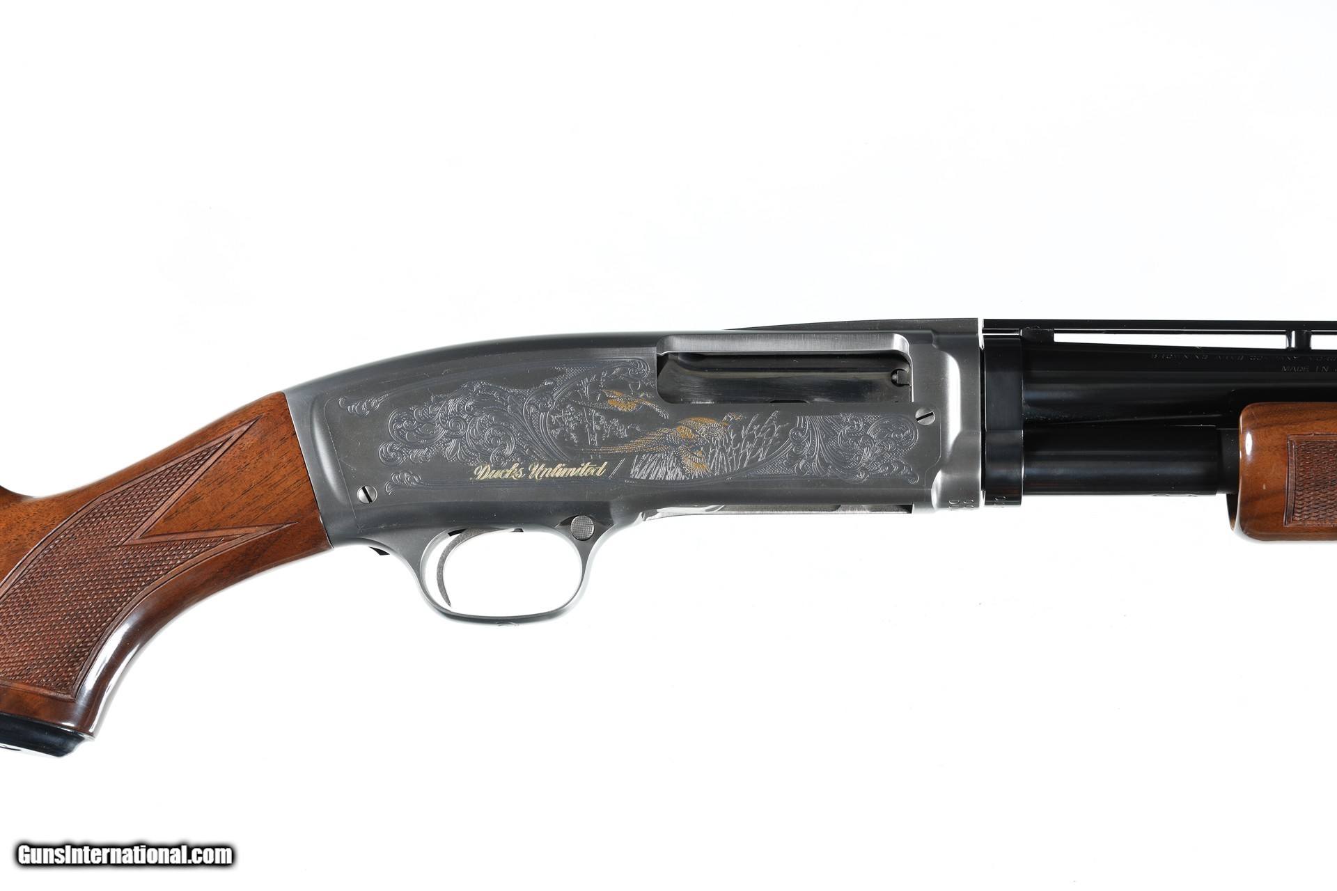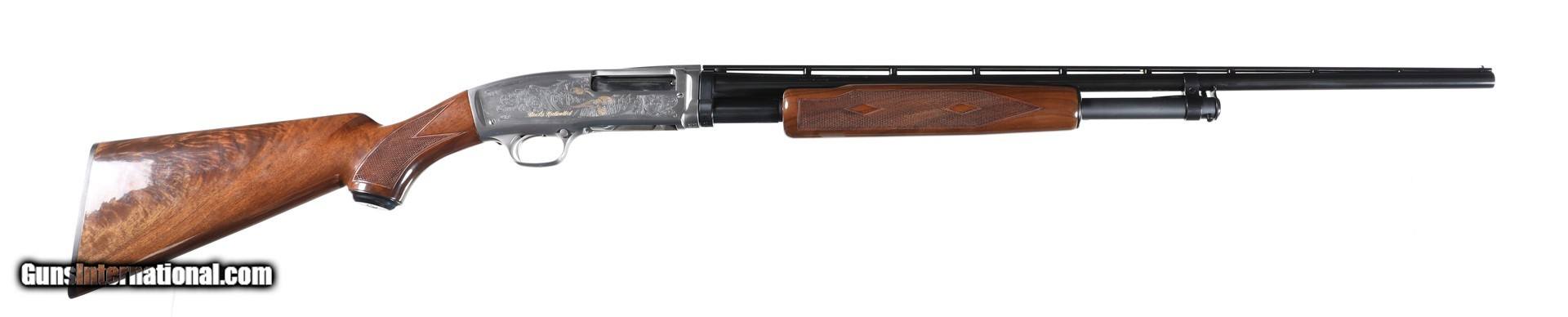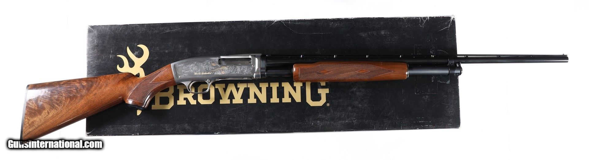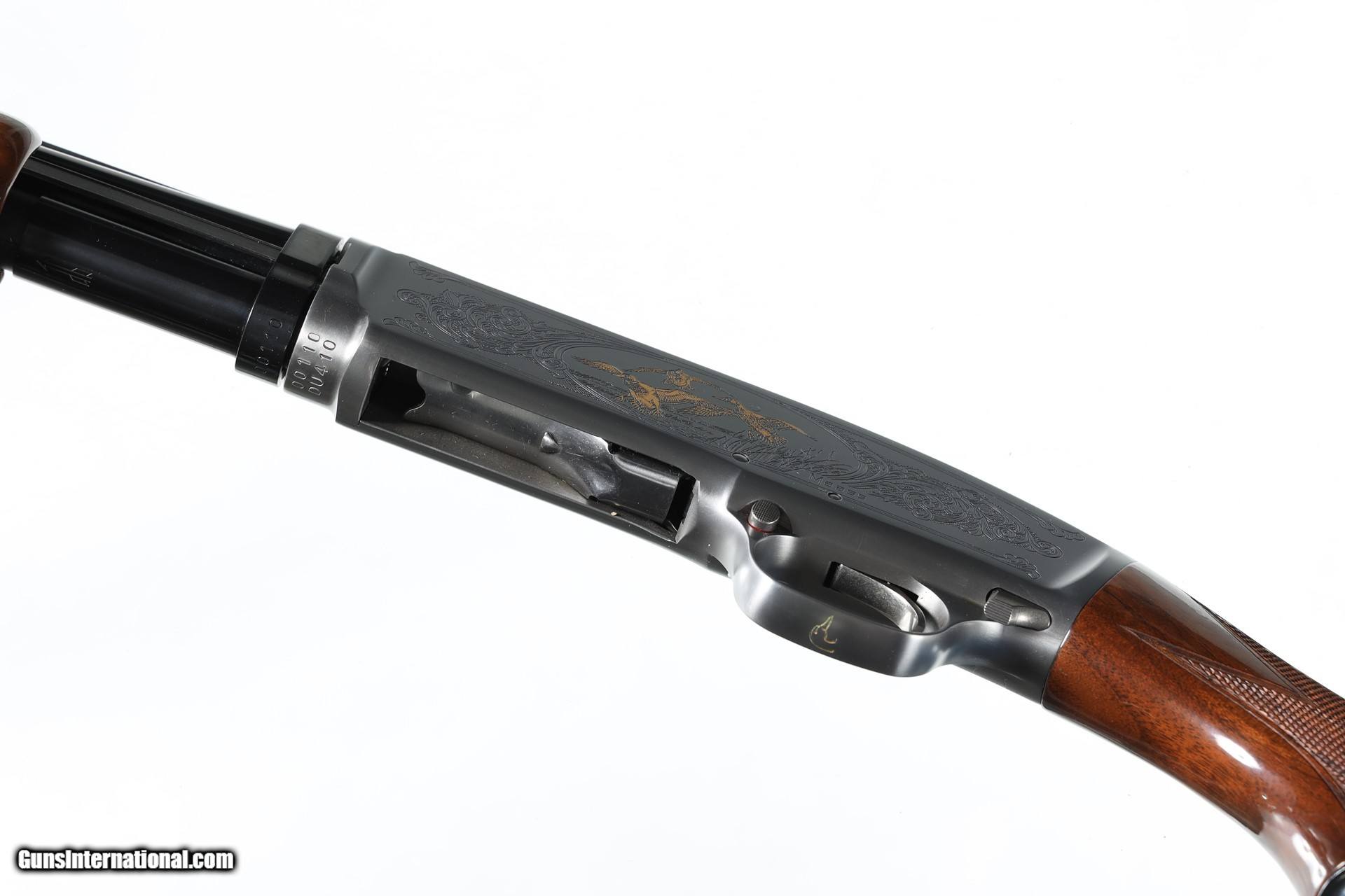 Description: Excellent plus overall condition, minimal to no handling marks present. Ducks Unlimited with factory box numbered to gun. Chamber: 3" Choke: Full, LOP 14". This illustrious Model 42 slide-action .410-gauge Shotgun, built by Browning Arms Company in Japan, was designed by David Maass for Ducks Unlimited. This Model 42 is highlighted by a receiver bearing an immaculate coin finish displaying gold washed flying ducks, "Maass" and floral engraving on its left side, while the right-side depicts gold washed pheasants flying above “Ducks Unlimited”. The top of the receiver reads "Virginia No.10" in script with a Ducks Unlimited duck head on the trigger bow. This Model 12’s high-quality design also incorporates a walnut high-figured, high-gloss, checkered pistol grip stock with a steel grip cap, a large walnut forend with checkering, and a Browning log buttplate. This shotgun also features a blued finish to a fixed modified choke barrel with a fully ventilated rib and bead front sight. Browning’s logo and the gun’s specs are located on the left-side of the barrel. This gem is accompanied by its original factory box of corresponding serial numbers, equating to a valuable addition to any collection. • Free Shipping, No Credit Card Fees. • Lay-a-way available for this firearm. • 1/3 Down, a 1/3 in 30 Days 1/3 in 60 Days. SOLD Manufacturer: Browning Model: 42 Serial Number: 0110DU410 Barrel Length: 26 |