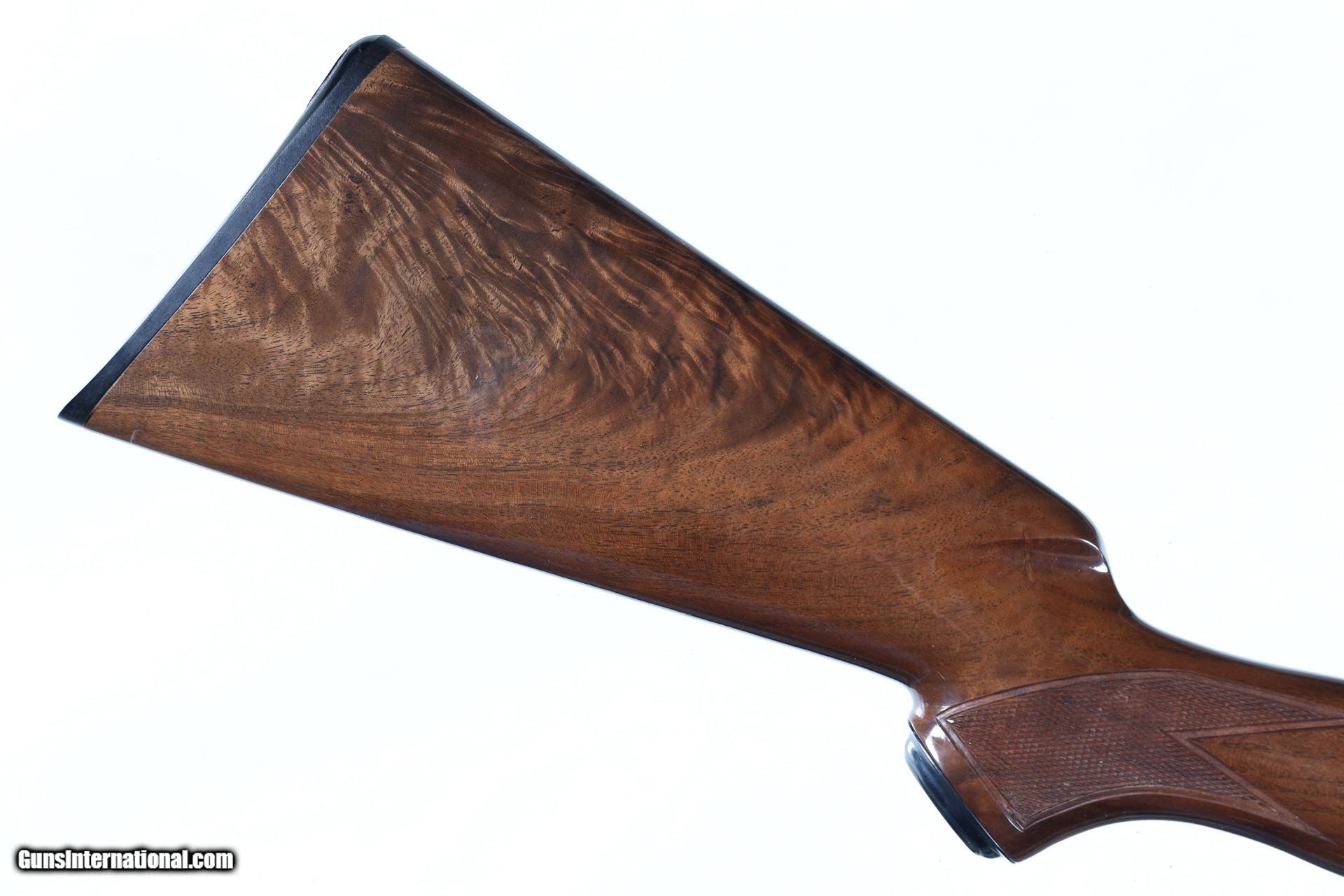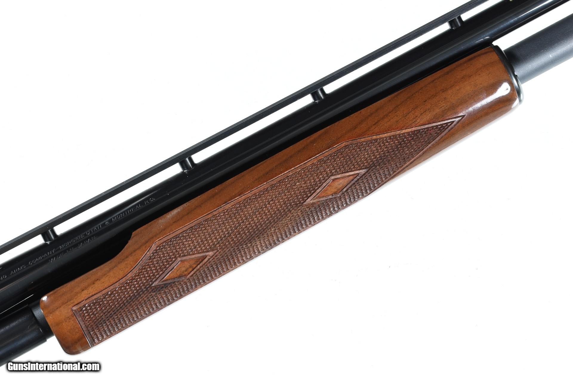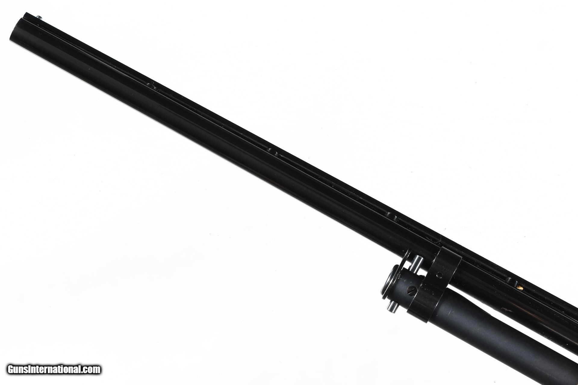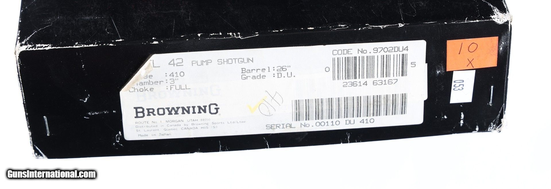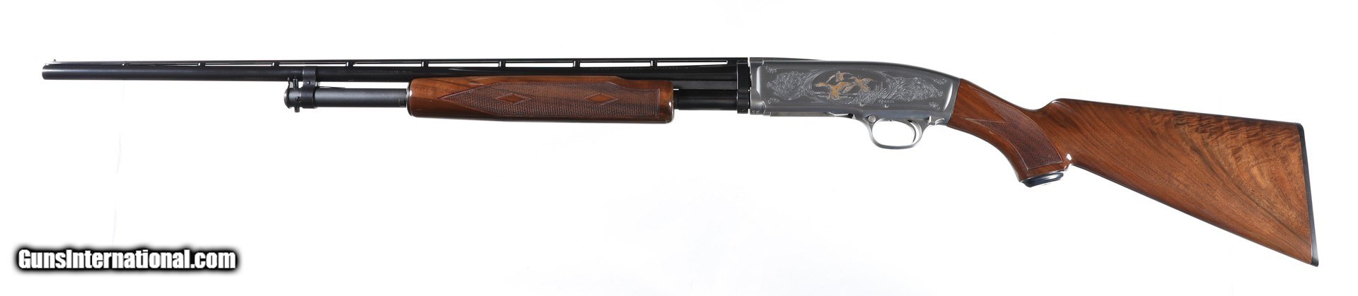 Description: Excellent plus overall condition, minimal to no handling marks present. Ducks Unlimited with factory box numbered to gun. Chamber: 3" Choke: Full, LOP 14". This illustrious Model 42 slide-action .410-gauge Shotgun, built by Browning Arms Company in Japan, was designed by David Maass for Ducks Unlimited. This Model 42 is highlighted by a receiver bearing an immaculate coin finish displaying gold washed flying ducks, "Maass" and floral engraving on its left side, while the right-side depicts gold washed pheasants flying above “Ducks Unlimited”. The top of the receiver reads "Virginia No.10" in script with a Ducks Unlimited duck head on the trigger bow. This Model 12’s high-quality design also incorporates a walnut high-figured, high-gloss, checkered pistol grip stock with a steel grip cap, a large walnut forend with checkering, and a Browning log buttplate. This shotgun also features a blued finish to a fixed modified choke barrel with a fully ventilated rib and bead front sight. Browning’s logo and the gun’s specs are located on the left-side of the barrel. This gem is accompanied by its original factory box of corresponding serial numbers, equating to a valuable addition to any collection. • Free Shipping, No Credit Card Fees. • Lay-a-way available for this firearm. • 1/3 Down, a 1/3 in 30 Days 1/3 in 60 Days. SOLD Manufacturer: Browning Model: 42 Serial Number: 0110DU410 Barrel Length: 26 |
