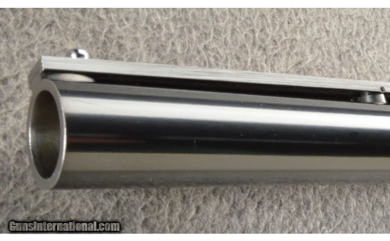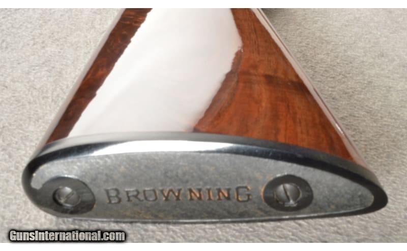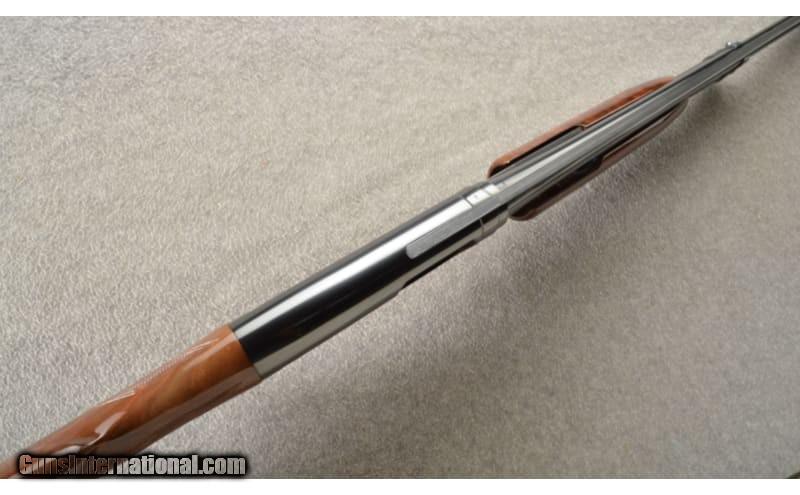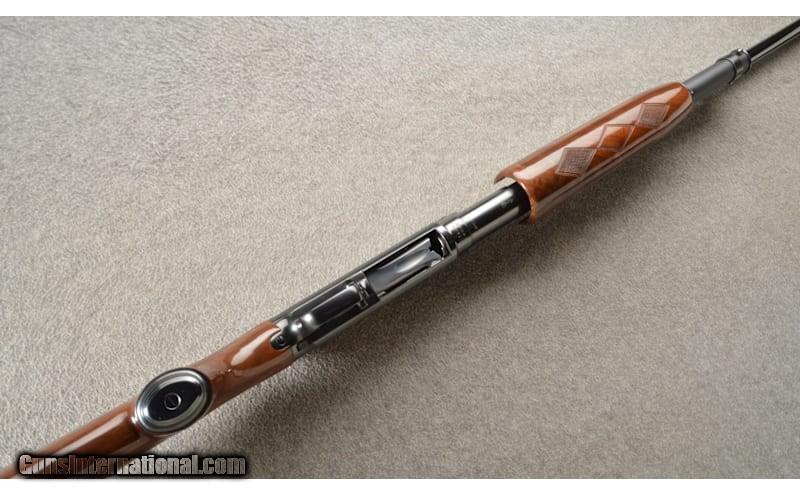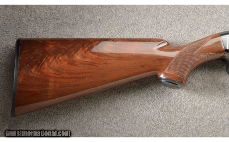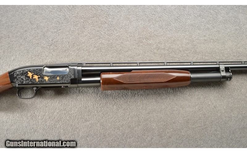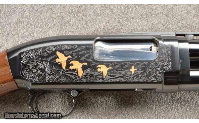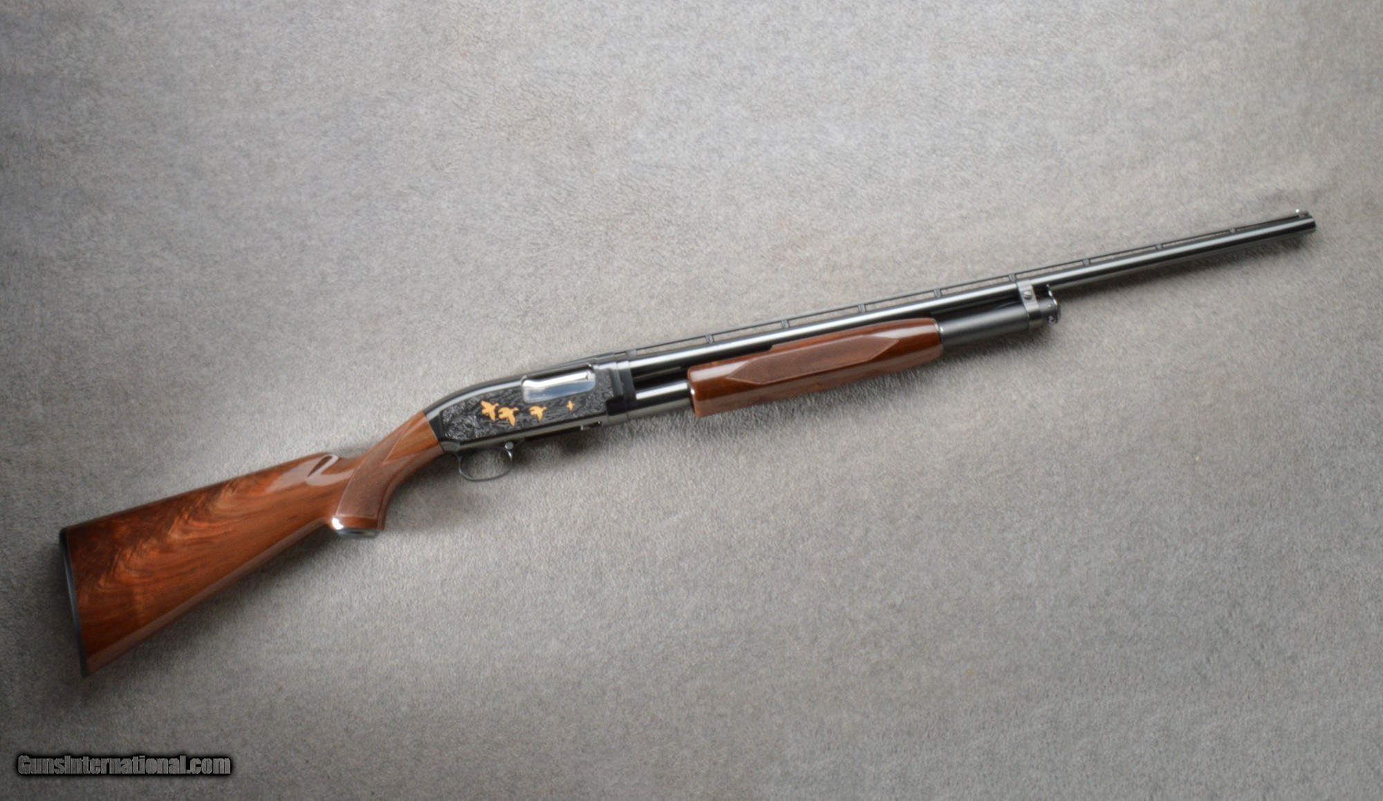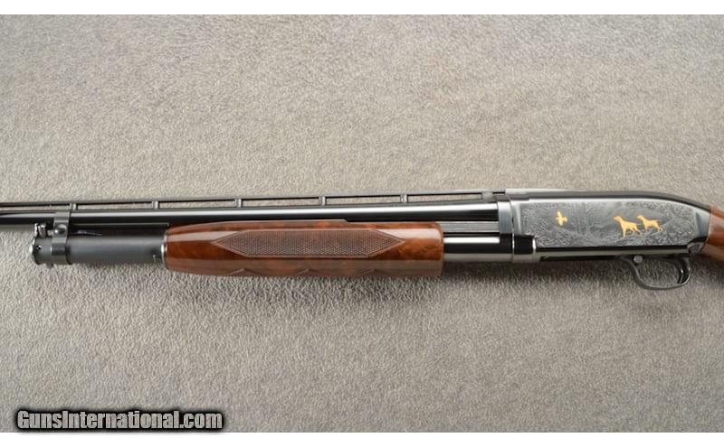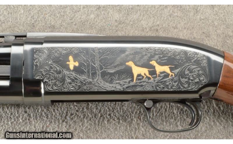 Description: This Browning Model 12 is a pump action, takedown shotgun chambered in 28 gauge with a 26" vent barrel and a bead front sight. This gun was manufactured in Miroku factory in Japan, for Browning. The left side of the receiver has scroll engraving surrounding dog and ducks scene, the right is a waterfowl scene with the animals in both scenes in gold. The stocks are a two-piece checkered, gloss-finished high grade walnut set. The forend has checkering on both sides and bottom. The butt stock has checkering on the pistol grip with a fluted comb, blued steel grip cap and textured black plastic Browning buttplate. This Grade V appears in excellent, unused condition with its serial matching box and owners manual. Serial 02603NM972. 28 Gauge SOLD Chambers: 2 3/4" chambers. Metal Condition: Like new. Wood Condition: Like new. Bore Condition: Like new. Barrels: 26" barrel. Triggers: Single trigger. Stock Dimensions: LOP 14". Fore End: Checkered. Butt Pad: Plastic butt plate. Sights: Front bead. Chokes: Fixed MOD. Item Location: Owatonna, MN |