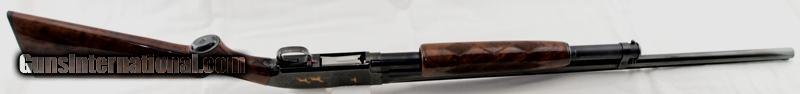 Description: Browning M-12, Grade V, 20GA 2 3/4", 26" MOD choke bbl, vented rib, 99% blued finish, lop - 14", extensive game scene engraving with gold inlays, and select walnut checkered stock. There were only 4,000 of these shotguns mfg in 1988 only. This beautifully crafted remake of the original Winchester Model 12 patent by John Browning is in excellent condition. Add 3% for Credit Card Shipping $25.00 SOLD |