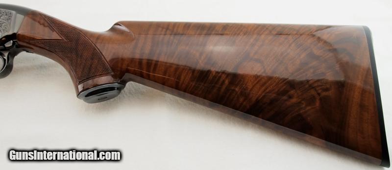 Description: Browning, M-12, Grade V, 28GA 2 3/4", 26" modified bore bbl, vented rib, 99% blued finish, extensive game scene engraving with gold inlays, lop - 14", and select walnut checkered stock. There were only 5,000 of these shotguns mfg in 1991-92 only. This beautifully crafted remake of the original Winchester Model 12 patent by John Browning is in excellent condition. Add 3% for Credit Card Shipping $30.00 SOLD |