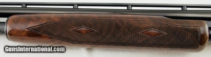 Description: Browning, M-42, Grade V, 410 GA 3", 26" full bore bbl, vented rib, 99% blued finish, extensive game scene engraving with gold inlays, and select walnut checkered stock. There were only 6,000 of these shotguns mfg in late 1991-1993 only. This beautifully crafted remake of the original Winchester Model 42 patent by John Browning is in excellent condition. Add 3% for Credit Card Shipping $25.00 SOLD |