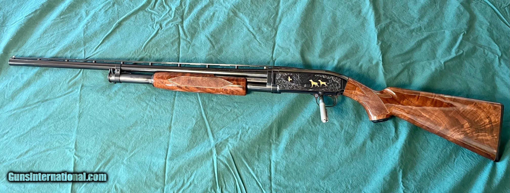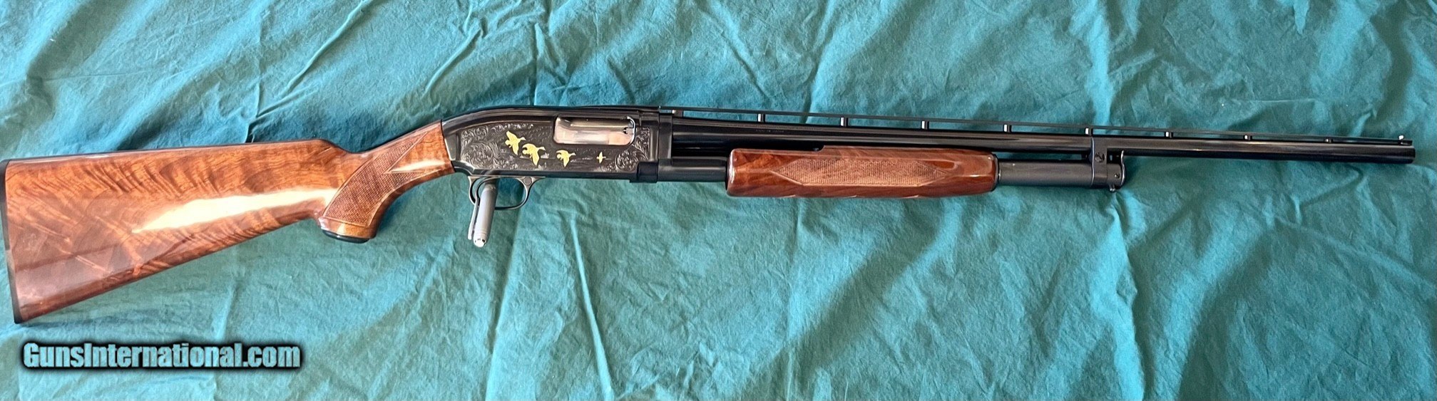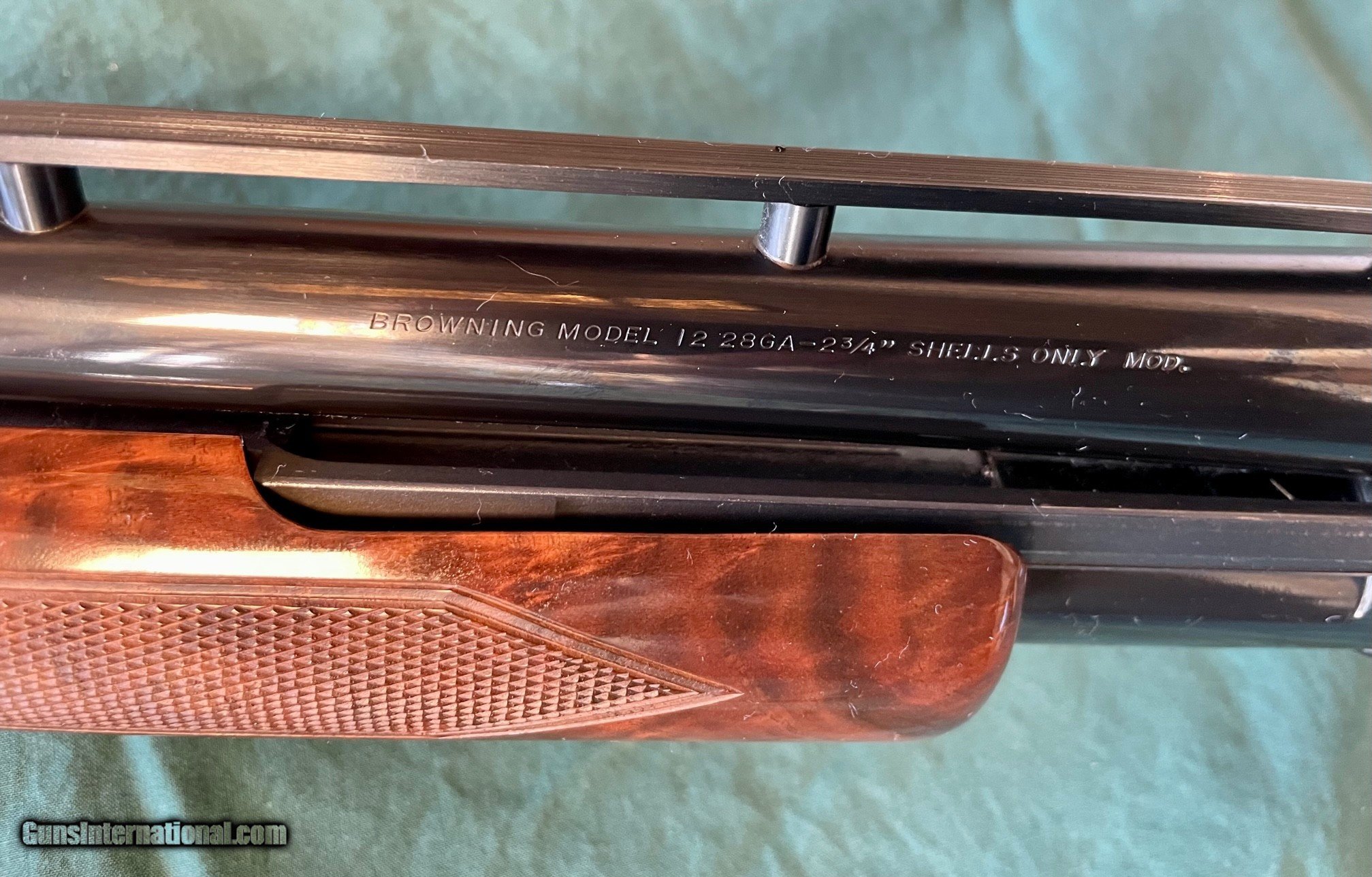 Description: This a Browning Model 12 pump shotgun, 28 gauge, Grade V. Made in Japan. 26” barrel. The shotgun is in excellent condition with a beautiful stock and engraved receiver, with gold inlay. The receiver and barrel are 100%. The wood stock is also excellent, with a couple tiny nicks (about 99%). Comes with original manual. It has been shot a few times. Serial number: 02221 NM972 SOLD Shotgun Gauge: 28 Gauge Manufacturer: Browning Model: Model 12 Serial Number: 02221 NM972 Metal Condition: 100% Wood Condition: 99% Action: Pump |