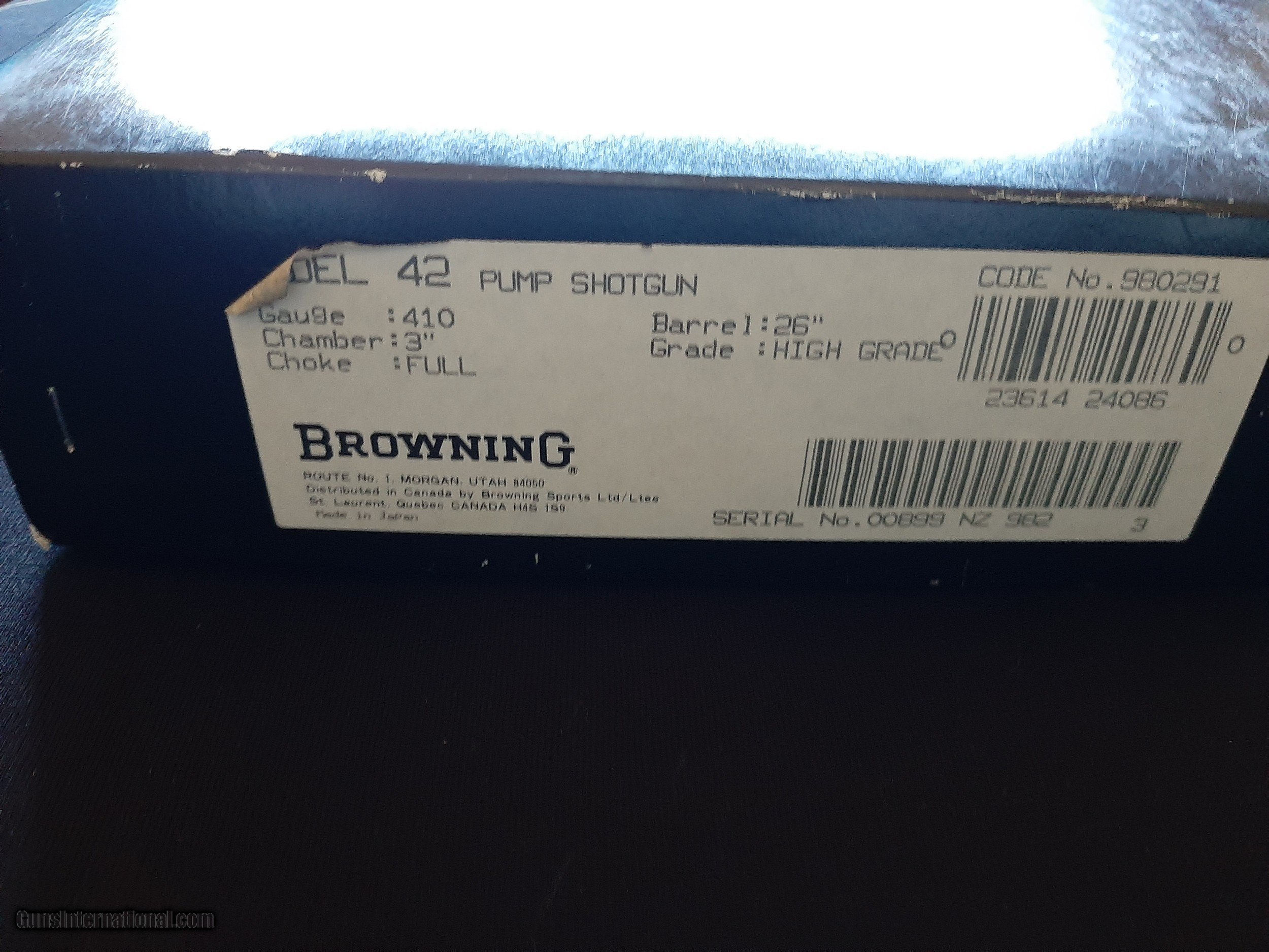 Description: Browning Model 42 410Ga Hi Grade that is NIB with all Paperwork. Cosmolene still present. Credit Cards add 3%. Shipping and Insurance is 60.00. SOLD Shotgun Gauge: .410 Gauge |