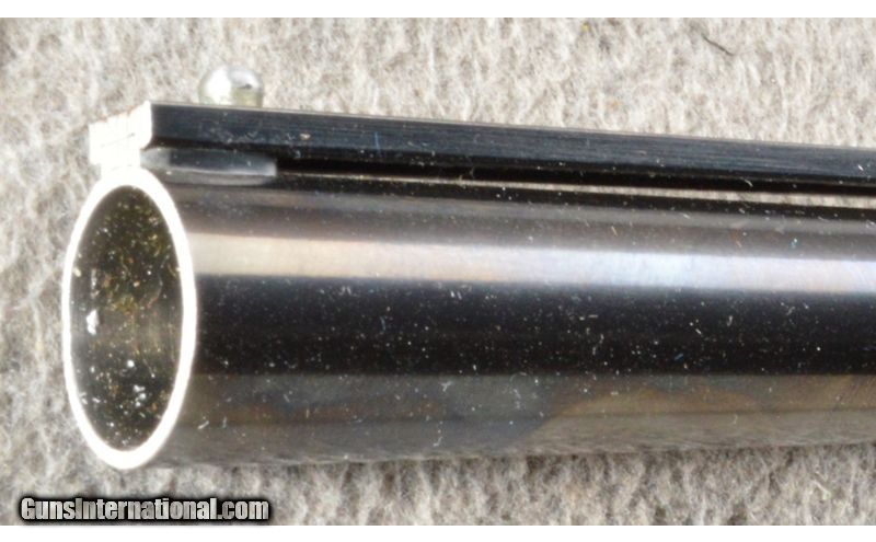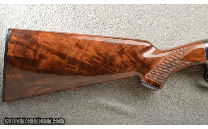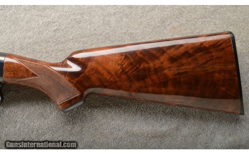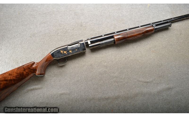 Description: This is an as new in box Browning made Winchester Model 12 grade V shotgun. The blue receiver is engraved and has 4 gold inlaid ducks on the right side and 2 dogs and a Grouse on the left side. The walnut stock and forearm are grade 5 or better with great figure and a gloss finish. This is one of several Winchester-Brownings with the SN#00109xxxxx that are new in the box. There could be tiny flaws as the shotgun is pre-owned. 20 Gauge SOLD Chambers: Pump action repeater 4+1. Metal Condition: Excellent. Wood Condition: Excellent. Bore Condition: Excellent. Barrels: 26" gloss blue with a vent rib. Triggers: Single blue. Stock Dimensions: 13 7/8" LOP. Fore End: Grade V walnut with a diamond checkering pattern. Butt Pad: Matching grade V walnut with a checkered pistol grip and a grip cap along with a Browning butt plate. Weight: 6 lbs. 15 oz. Sights: Single silver color front bead on the vent rib. Chokes: Fixed MOD. Item Location: Mitchell, SD |