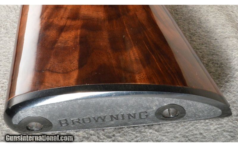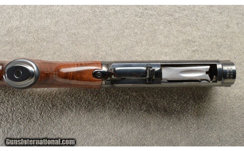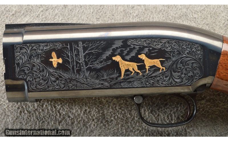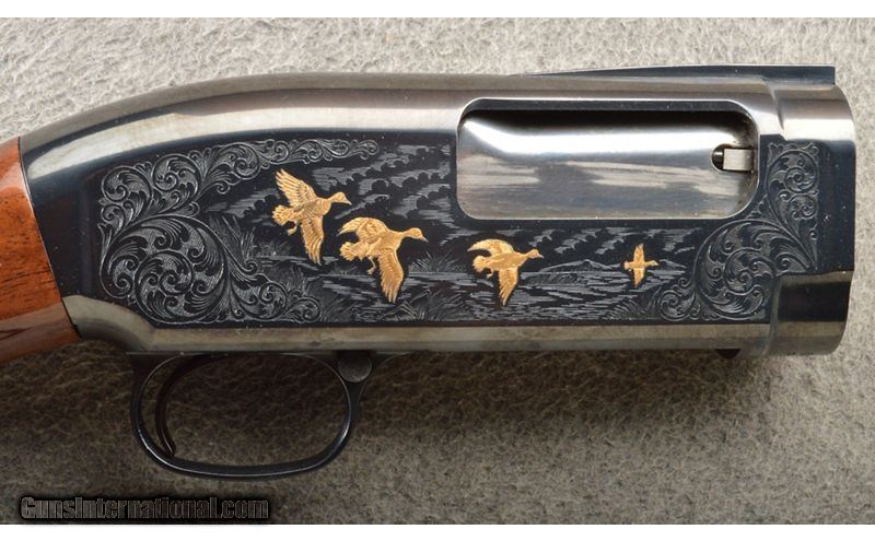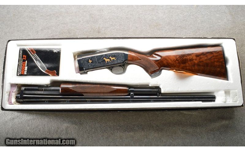 Description: This is an as new in box Browning made Winchester Model 12 grade V shotgun. The blue receiver is engraved and has 4 gold inlaid ducks on the right side and 2 dogs and a Grouse on the left side. The walnut stock and forearm are grade 5 or better with great figure and a gloss finish. This is one of several Winchester-Brownings with the SN#00109xxxxx that are new in the box. There could be tiny flaws as the shotgun is pre-owned. 20 Gauge SOLD Chambers: Pump action repeater 4+1. Metal Condition: Excellent. Wood Condition: Excellent. Bore Condition: Excellent. Barrels: 26" gloss blue with a vent rib. Triggers: Single blue. Stock Dimensions: 13 7/8" LOP. Fore End: Grade V walnut with a diamond checkering pattern. Butt Pad: Matching grade V walnut with a checkered pistol grip and a grip cap along with a Browning butt plate. Weight: 6 lbs. 15 oz. Sights: Single silver color front bead on the vent rib. Chokes: Fixed MOD. Item Location: Mitchell, SD |