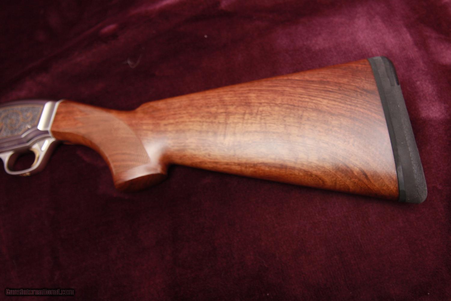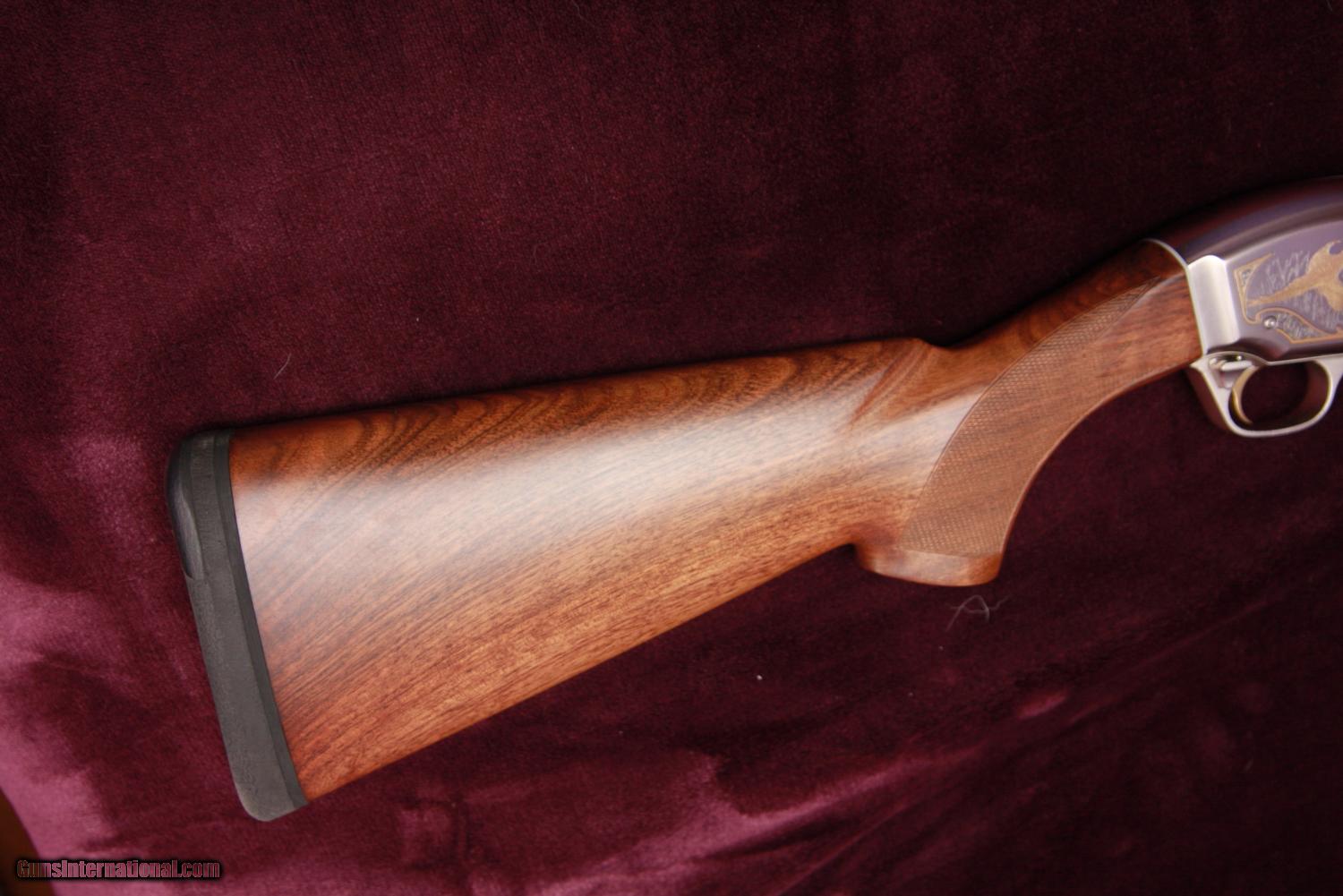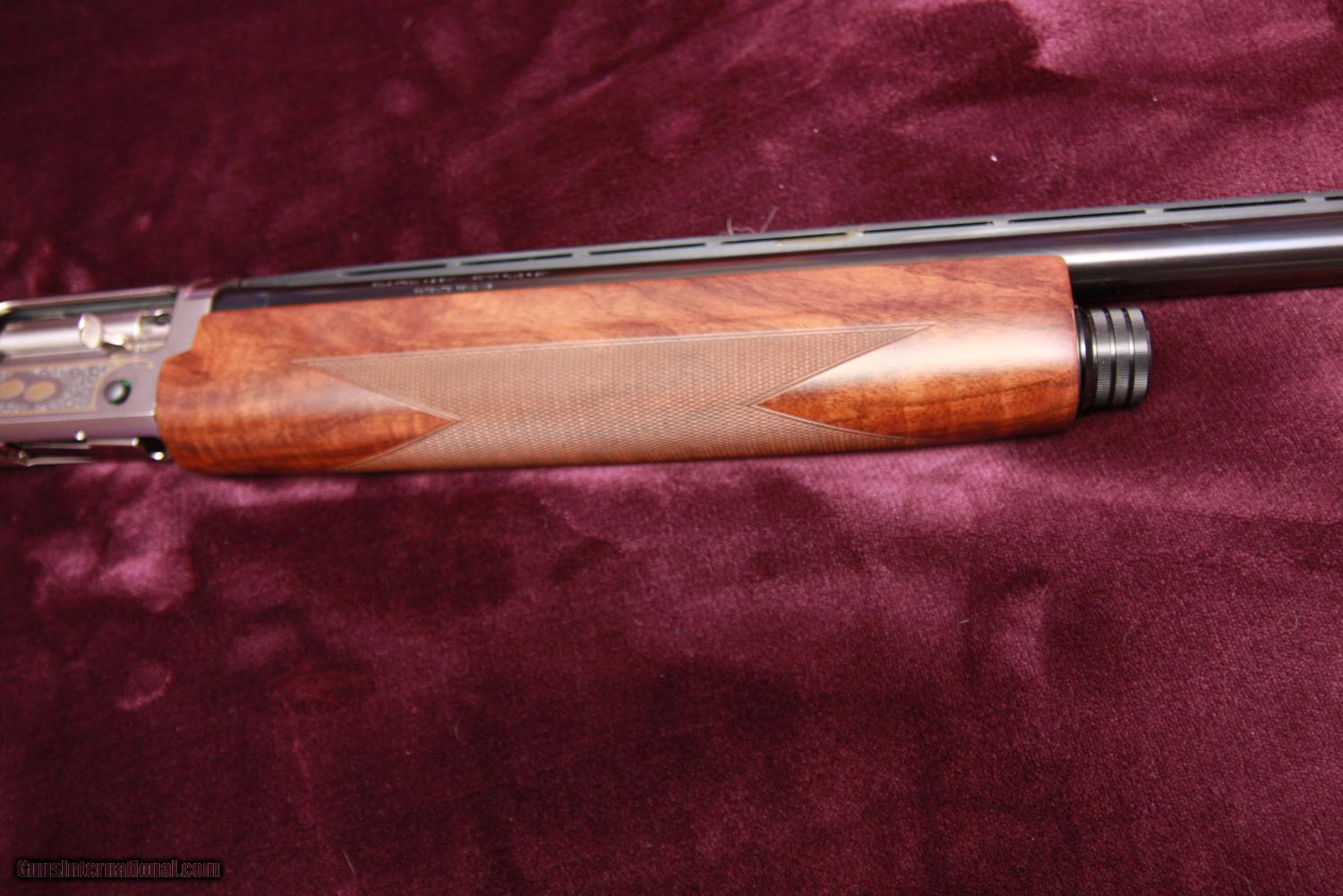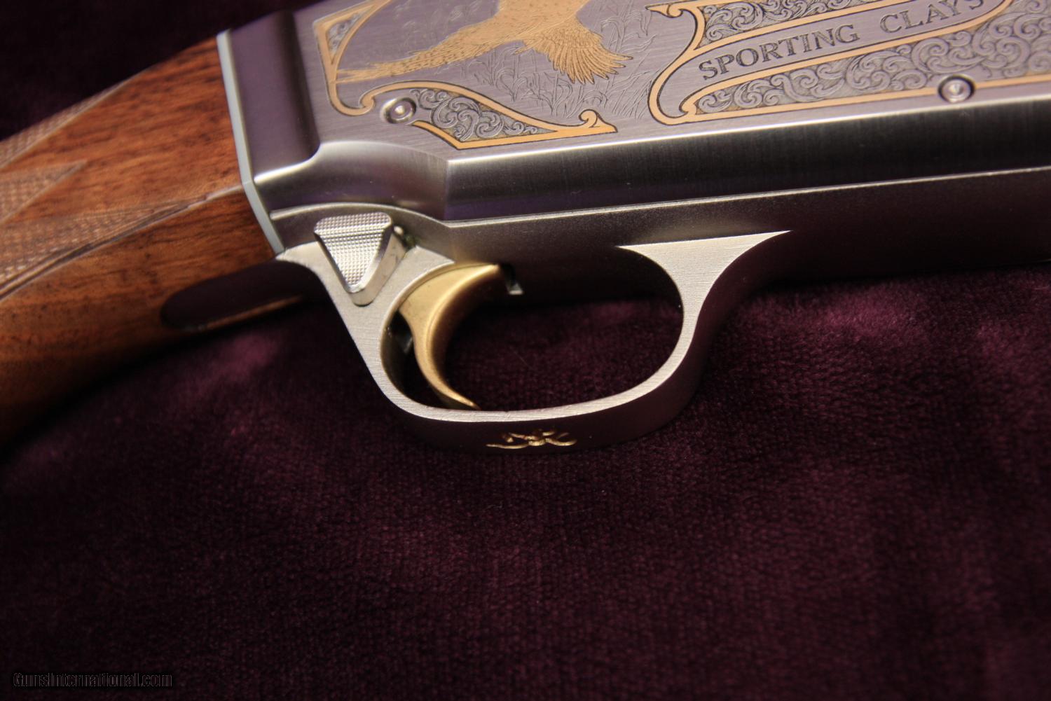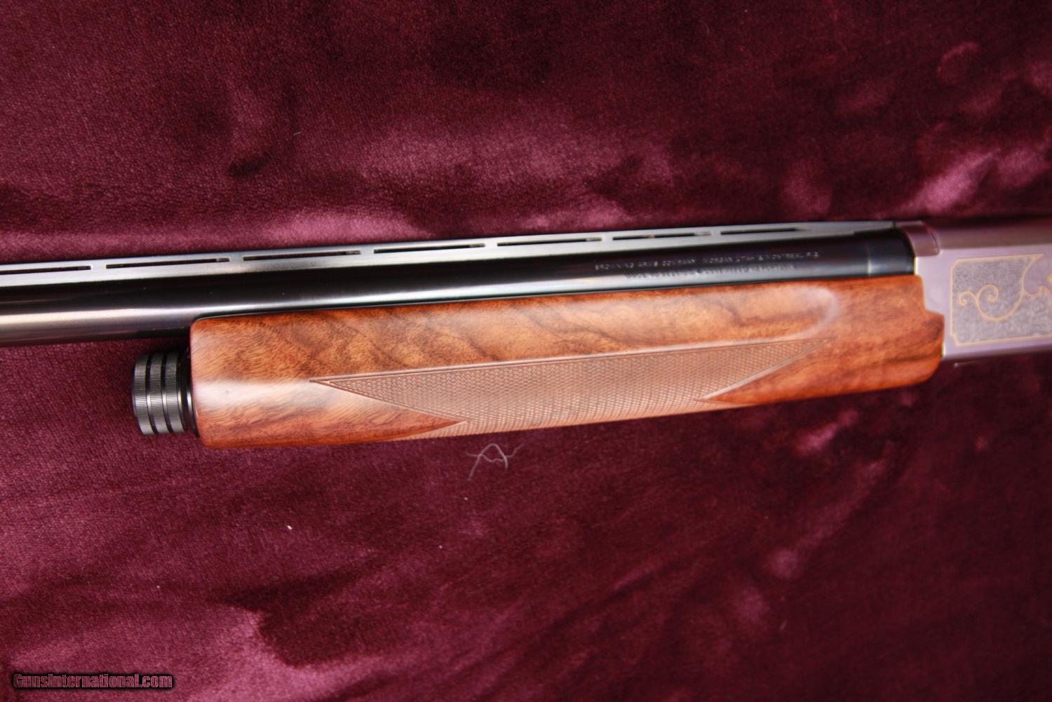 Description: BROWNING GOLD "GOLDEN CLAYS" 12 GA. SEMI-AUTOMATIC, ALUMINUM ALLOY RECEIVER "GOLDEN CLAYS" SCROLL ENGRAVING WITH GOLD ENHANCEMENTS / GOLD PHEASANT ON THE RIGHT SIDE / GOLD QUAILS ON THE LEFT SIDE ON THE SILVER RECEIVER. THE GUN HAS LOP OF 14 1/4", 1 5/8" DROP AT THE COMB AND 1 7/8" AT THE HEEL. THE GUN HAS A 30" VENTILATED RIBBED BARREL AND A GOLD TRIGGER AN IS GAS OPERATED. THIS COMES WITH 2 DIAMOND EXTENDED AND 3 INTERNAL CHOKE TUBES AND 6 BRILEY "SPLASH" EXTENDED CHOKE TUBES. THE FRONT SITE IS "HI-VIZ TRI-COMP". THE FOREARM AND BUTT STOCK ARE WALNUT WITH A SATIN FINISH. THIS GUN IS 100% ON THE WOOD AND METAL. IN ADDITION, THERE IS A $50.00 SHIPPING, INSURANCE AND TRANSFER COST ADDED TO THE SALE PRICE. IF YOU HAVE ANY QUESTIONS, PLEASE CALL 708-228-4947 SOLD |