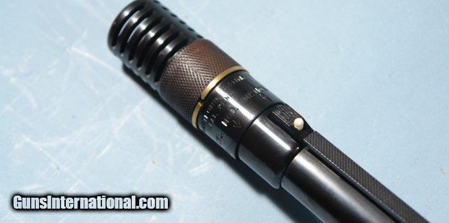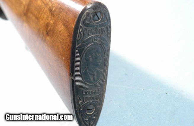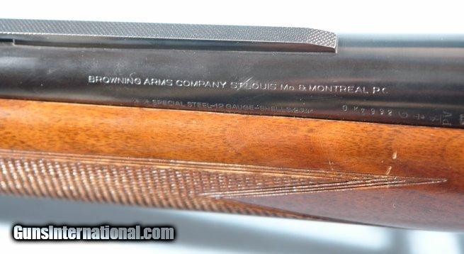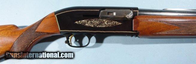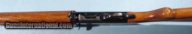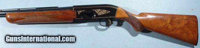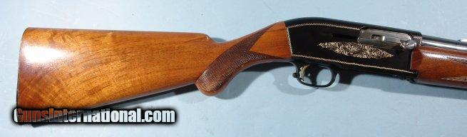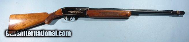 Description: BELGIAN BROWNING MODEL TWELVETTE 12GA. ALLOY SEMI-AUTO SHOTGUN, CIRCA 1960. Serial number "A37XXX". Original Belgian proofed barrel with Deluxe Poly-Choke. Factory vent rib extends to polychoke on what is now a 25 1/2" barrel. Probably originally a 26 or 28" barrel choked modified(**). Browning was known to offer these with whatever you wanted as far as compensator/polychoke. 100% of it's original blue and black anodized alloy receiver color. 100% of it's original gold fill to engraving. Wood and checkering just like the day it was applied. NO signs of use and or dings. Original John Browning profile retro horn buttplate with factory 14 1/4" LOP. Probably shot a handful of times and put back in safe. From very old collection of notable Browning collector. SOLD Curio/Relic: Yes |