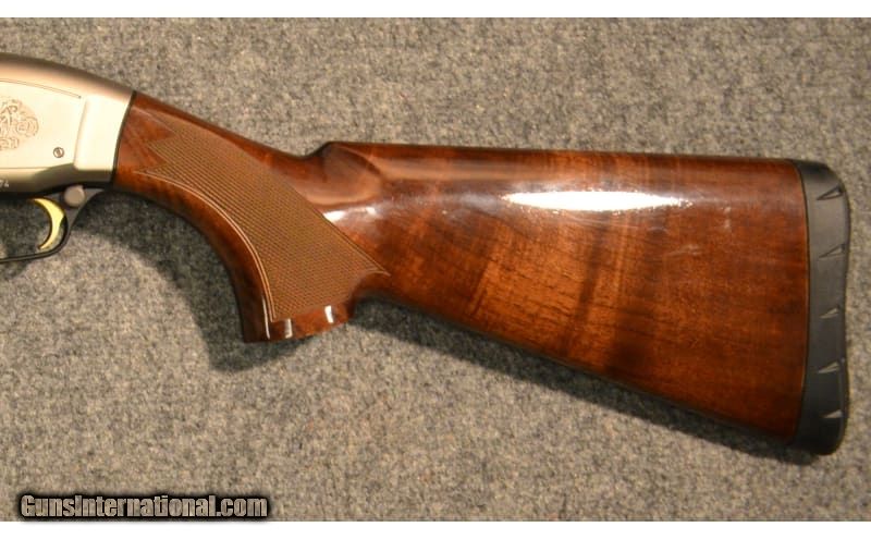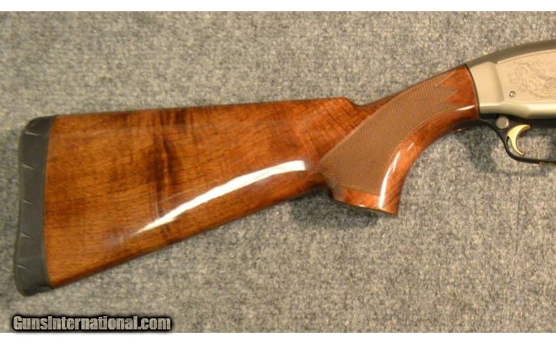 Description: This Browning Model Maxus is a right hand semi-auto shotgun in 12 Ga. It has a 28 inch ventilated rib barrel with a brass bead front sight. With a 3 inch chamber it has Invector-Plus Choke and comes with 3 choke tubes. The butt stock is a checkered grip walnut pistol grip. The forearm is a checkered grip walnut. The receiver is lightly engraved with duck and pheasant. 12 Gauge SOLD Chambers: 2 3/4 inch or 3 inch. Metal Condition: Very Good. A couple of minor handling marks. Wood Condition: Very Good. A few light handling marks. A very small chip of wood is missing left side buttstock bottom at the recoil pad. Bore Condition: Shiny. Barrels: 28 inch barrel with a ventilated rib. Stock Dimensions: LOP 14 inches. Fore End: Checkered grip walnut. Butt Pad: Inflex Technologies black rubber pad. Weight: 7 lbs Sights: Brass bead front. Chokes: Invector-Plus Choke. Comes with 3 choke tubes. Item Location: Richfield, WI |