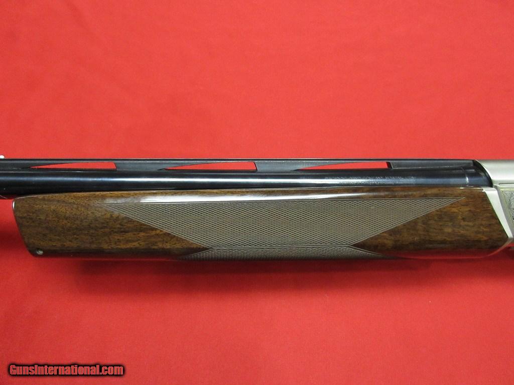 Description: Lightweight aluminum alloy receiver with a satin nickel finish, gold enhanced engravings with birds transforming into clay targets on both sides of the receiver, the Power Drive gas system cycles light 2 3/4" target loads to 3" magnum field loads, grade III walnut stock with a high gloss finish, shims to adjust drop & cast as well as LOP, HiVis fiber-optic front sight. Comes with a factory case and five choke tubes. SOLD |