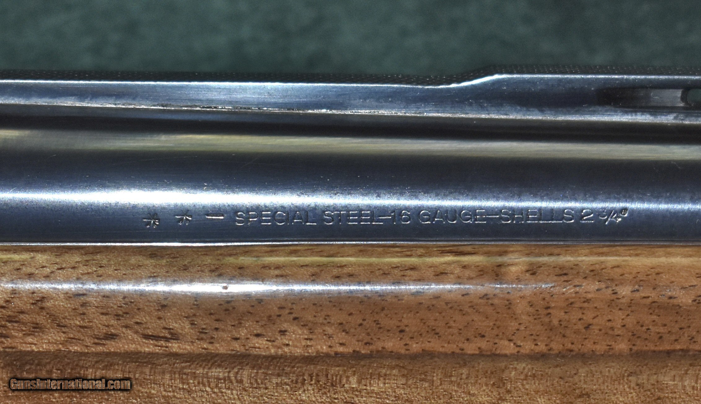 Description: Belgian Browning Sweet 16 built in 1966.This gun appears to be unfired showing no wear at all and no primer mark on the bolt face.The gun has a 26" vent rib barrel choked improved cylinder.It retains 100% of the original blue and wood finish.It has the quare knob stock and darker wood typlical of the period.It comes with a Browning luggage case.Sorry,no box.C&R eligible. SOLD Curio/Relic: Yes Shotgun Gauge: 16 Gauge Manufacturer: Browning (FN) Model: Sweet 16 Serial Number: 6S51923 Barrel Length: 26 Chambers: 23/4 Condition: new Metal Condition: new Wood Condition: new Bore Condition: n Barrel Type: Browning Special Steel Action: semi auto Butt Pad: factory buttplate Manufacture Date: 1966 Chokes: Improved cylinder |