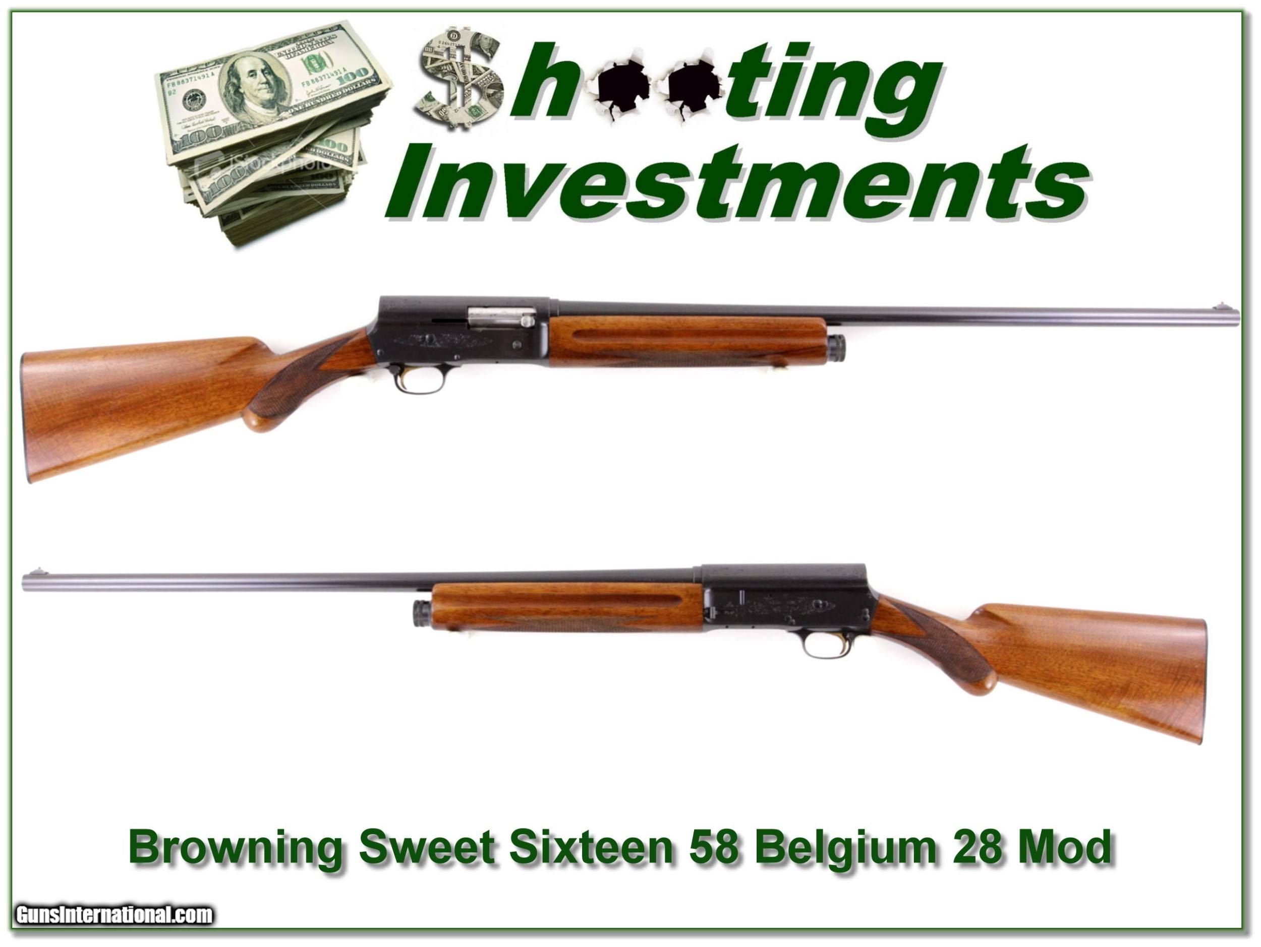 Description: This is a 1958 Belgium made Browning Sweet Sixteen. The original rust blue is excellent with just the faintest or recoil wear on the 28in Modified barrel. The original wood finished has light marks. I am sure this one wasn’t use much and shot few shells. It has it’s original St. Lious barrel. It will make a classic field gun and they just don’t make them like this anymore! Shipping with insurance is $39. Please email me with any questions or larger pictures. (Consign your quality firearms with Shooting Investments for only 12%! Let me know if you have any you would like to sell!) 19-0416 Payment: Payment is by Money Order, Cashiers Check or Personal Check. I can now also accept Credit Cards (MasterCard, Visa, Discover & American Express) with a 3% convenience fee. PayPal can be used for some items but never for firearms. Shipping: The shipping charge will be listed in each description. It is $39 for most firearms. Some heavy guns or those insured for over $2000 will be higher. Shipments to Alaska and Hawaii are higher because air shipment is required. Most firearms are shipped on Tuesday and Thursday and usually in 5 days of receipt of payment. We package all shipments carefully and insure them. Optics are shipped Priority Mail and most other non-firearm shipments are shipped First Class. Returns: Our return policy is simple. If for any reason you are not pleased with your purchase, you may return your item for a full refund of purchase price. Ammunition cannot be returned. It is important to us that you are happy. Guns cannot be fired or dissembled before returning them and they must be returned in the same condition as received. Notification of a return must occur with-in 3 days of receipt at your dealer. Shipping, convenience and dealer fees are not refundable and are the responsibility of the buyer. Lay-a-way: If needed, we offer a 60 day lay-a-way option on most firearms. It is 1/3 now, 1/3 in 30 days and 1/3 in 60 days. Lay-a-way firearm sales are final and if not completed the first payment cannot be returned. Consigning your firearms with Shooting Investments: We will help you get top dollar for your firearms. While most local guns shops charge 20% or more, our fee is only 12% with a minimum of $75. At your local gun shop it might take months to sell. Selling on-line provides instant access to thousands of interested buyers. You won’t find any other on-line dealer willing to sell your firearms for only 12% or listing every gun on 3 separate s. Selling through an House typically costs the seller 15% and the buyer an addition 15% (so 30%) and you have to wait several months to sell and longer to receive funds. If properly priced, we will sell your firearms in a few weeks. Send us an email or give us a call and we’ll explain how easy it is for you to get top dollar. Trading: Trading for use is really just buying your gun to re-sell. If you have a gun you want to trade, please email a picture and we will let you know what we can give or it. You will always get more if we sell it for you on consignment. Help for California Buyers: We are happy to ship to California. It is the buyer’s responsibility to make sure any item you buy is legal in your state. We are also happy to help with your purchase of a firearm from someone other than us. If you see a gun you would like to buy but the seller can’t or won’t ship to California they can ship to use and we’ll then ship it to your California dealer. The cost for this service is only $30 + shipping. Let us know if we can help! SOLD |