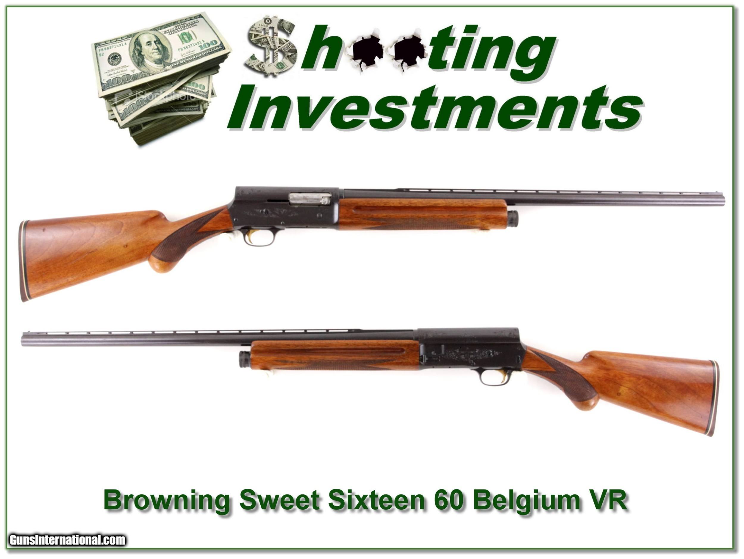 Description: This is a 1960 Belgium made Browning Sweet Sixteen. It has a hard to fin 26in Vent Rib choked Modified. Nearly all the blue is present with just light freckles. The bore is bright and shiny. The LOP is 14in to added thin recoil pad. This with make a classic field gun with the perfect barrel for most bird hunters! They don’t make them like this anymore. Shipping with insurance is $39. Please email me with any questions or larger pictures. (Consign your quality firearms with Shooting Investments for only 12%! Let me know if you have any you would like to sell!) 19-0727 Payment: Payment is by Money Order, Cashiers Check or Personal Check. I can now also accept Credit Cards (MasterCard, Visa, Discover & American Express) with a 3% convenience fee. PayPal can be used for some items but never for firearms. Shipping: The shipping charge will be listed in each description. It is $39 for most firearms. Some heavy guns or those insured for over $2000 will be higher. Shipments to Alaska and Hawaii are higher because air shipment is required. Most firearms are shipped on Tuesday and Thursday and usually in 5 days of receipt of payment. We package all shipments carefully and insure them. Optics are shipped Priority Mail and most other non-firearm shipments are shipped First Class. Returns: Our return policy is simple. If for any reason you are not pleased with your purchase, you may return your item for a full refund of purchase price. Ammunition cannot be returned. It is important to us that you are happy. Guns cannot be fired or dissembled before returning them and they must be returned in the same condition as received. Notification of a return must occur with-in 3 days of receipt at your dealer. Shipping, convenience and dealer fees are not refundable and are the responsibility of the buyer. Lay-a-way: If needed, we offer a 60 day lay-a-way option on most firearms. It is 1/3 now, 1/3 in 30 days and 1/3 in 60 days. Lay-a-way firearm sales are final and if not completed the first payment cannot be returned. Consigning your firearms with Shooting Investments: We will help you get top dollar for your firearms. While most local guns shops charge 20% or more, our fee is only 12% with a minimum of $75. At your local gun shop it might take months to sell. Selling on-line provides instant access to thousands of interested buyers. You won’t find any other on-line dealer willing to sell your firearms for only 12% or listing every gun on 3 separate s. Selling through an House typically costs the seller 15% and the buyer an addition 15% (so 30%) and you have to wait several months to sell and longer to receive funds. If properly priced, we will sell your firearms in a few weeks. Send us an email or give us a call and we’ll explain how easy it is for you to get top dollar. Trading: Trading for use is really just buying your gun to re-sell. If you have a gun you want to trade, please email a picture and we will let you know what we can give or it. You will always get more if we sell it for you on consignment. Help for California Buyers: We are happy to ship to California. It is the buyer’s responsibility to make sure any item you buy is legal in your state. We are also happy to help with your purchase of a firearm from someone other than us. If you see a gun you would like to buy but the seller can’t or won’t ship to California they can ship to use and we’ll then ship it to your California dealer. The cost for this service is only $30 + shipping. Let us know if we can help! SOLD |