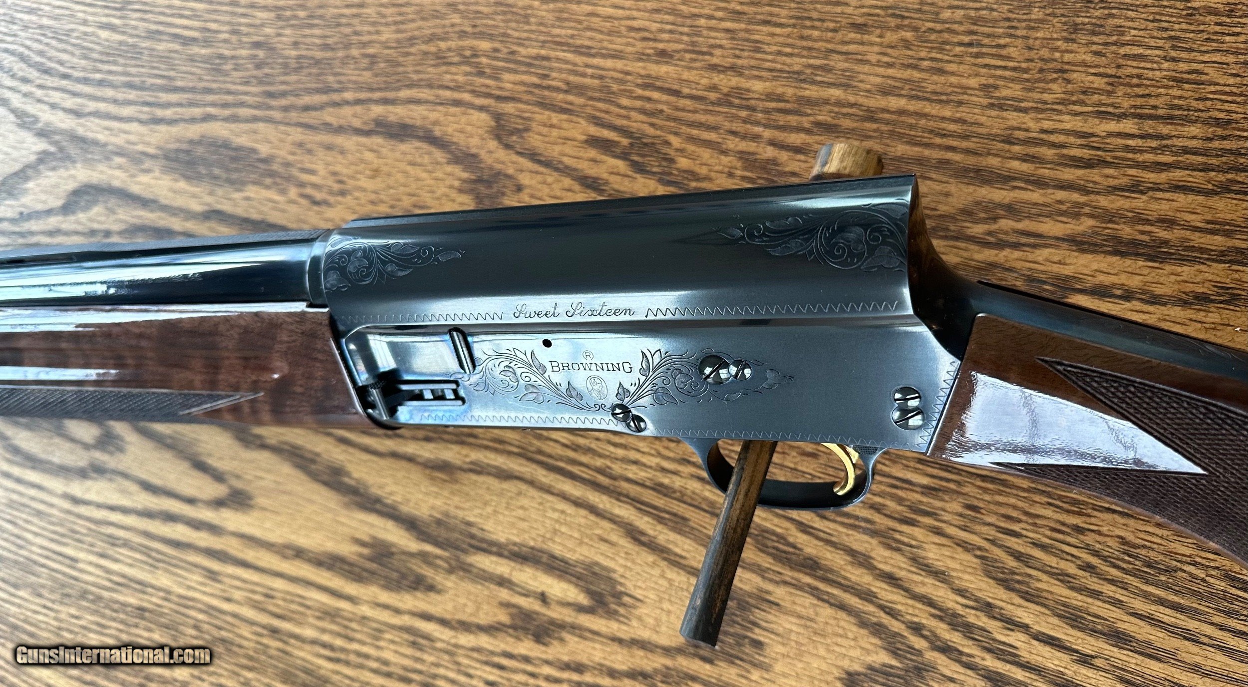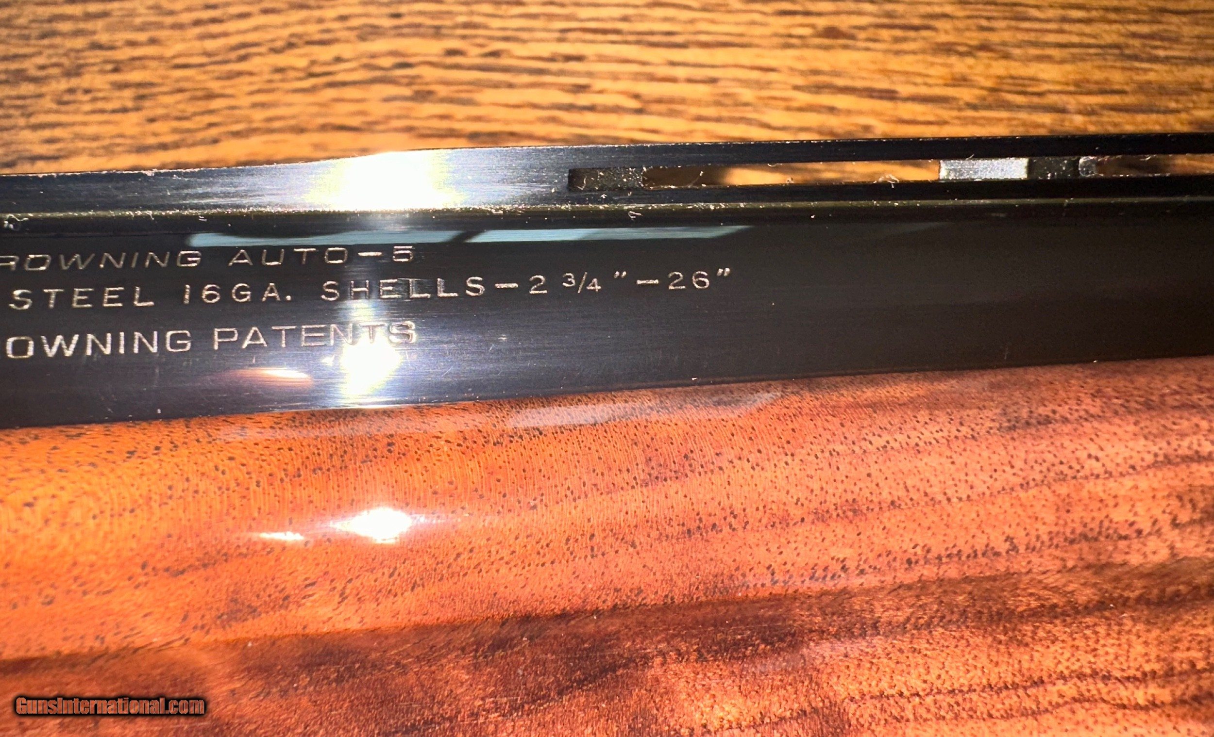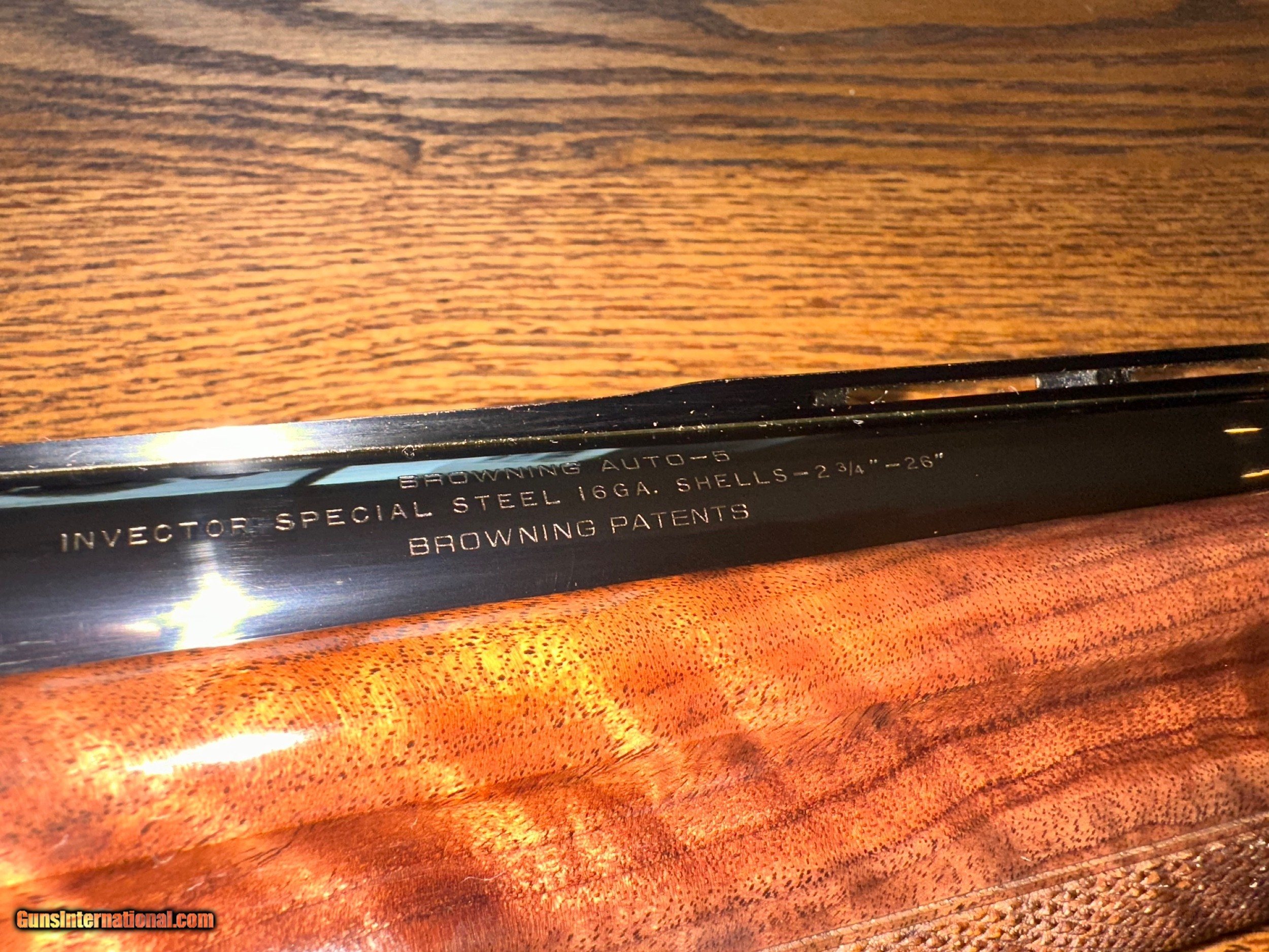 Description: Browning Auto 5 Sweet Sixteen with 26" invector barrel and high grade wood. Beautiful gun that has been shot and handled very little. Made in Japan in 1987 and comes with 3 chokes. Please add $75 for shipping. SOLD Shotgun Gauge: 16 Gauge Manufacturer: Browning Model: Auto 5 Barrel Length: 26” Chambers: 2 3/4” Condition: Excellent Metal Condition: Excellent Wood Condition: Excellent |