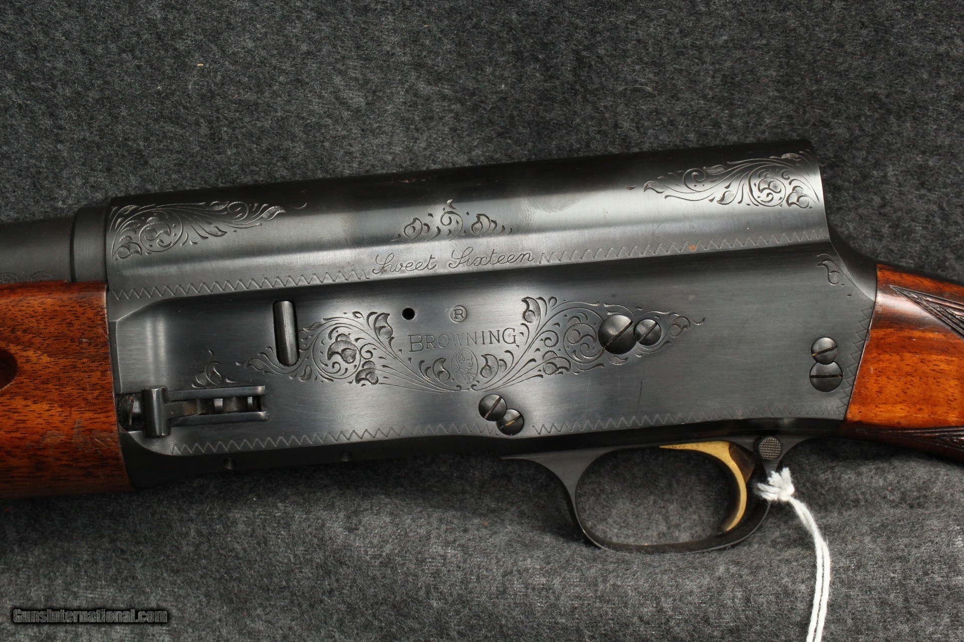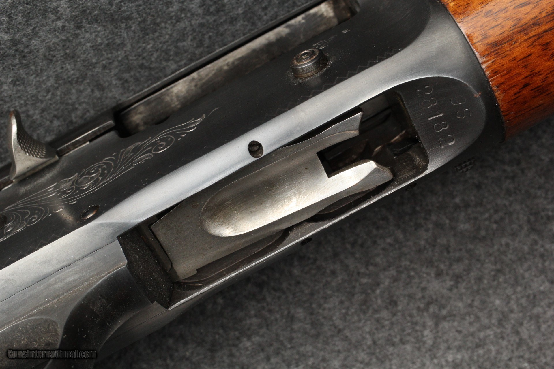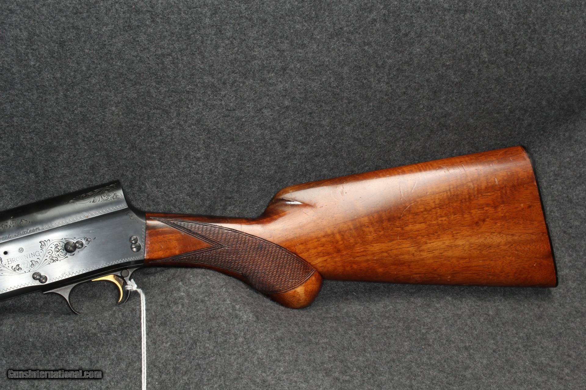 Description: 16ga, serial number 9S281XX. 25" barrel, 2 3/4" chamber. Made in Belgium. Fixed choke (mod). Forend shows light marring, no apparent cracks. Checkering shows wear, flattening at some points. Retains 90% original finish. Buttstock shows hunting wear and checking of original finish, 90% remains. Slight oil soaking around tang. Correct original buttplate. Metal shows minor rust freckling on barrel and receiver. Retains 95% blue. First 8" of barrel show dulling, possible cold blue application. Bore is excellent. More photos on request. Please add $60.00 for shipping and insurance. SOLD Shotgun Gauge: 16 Gauge |